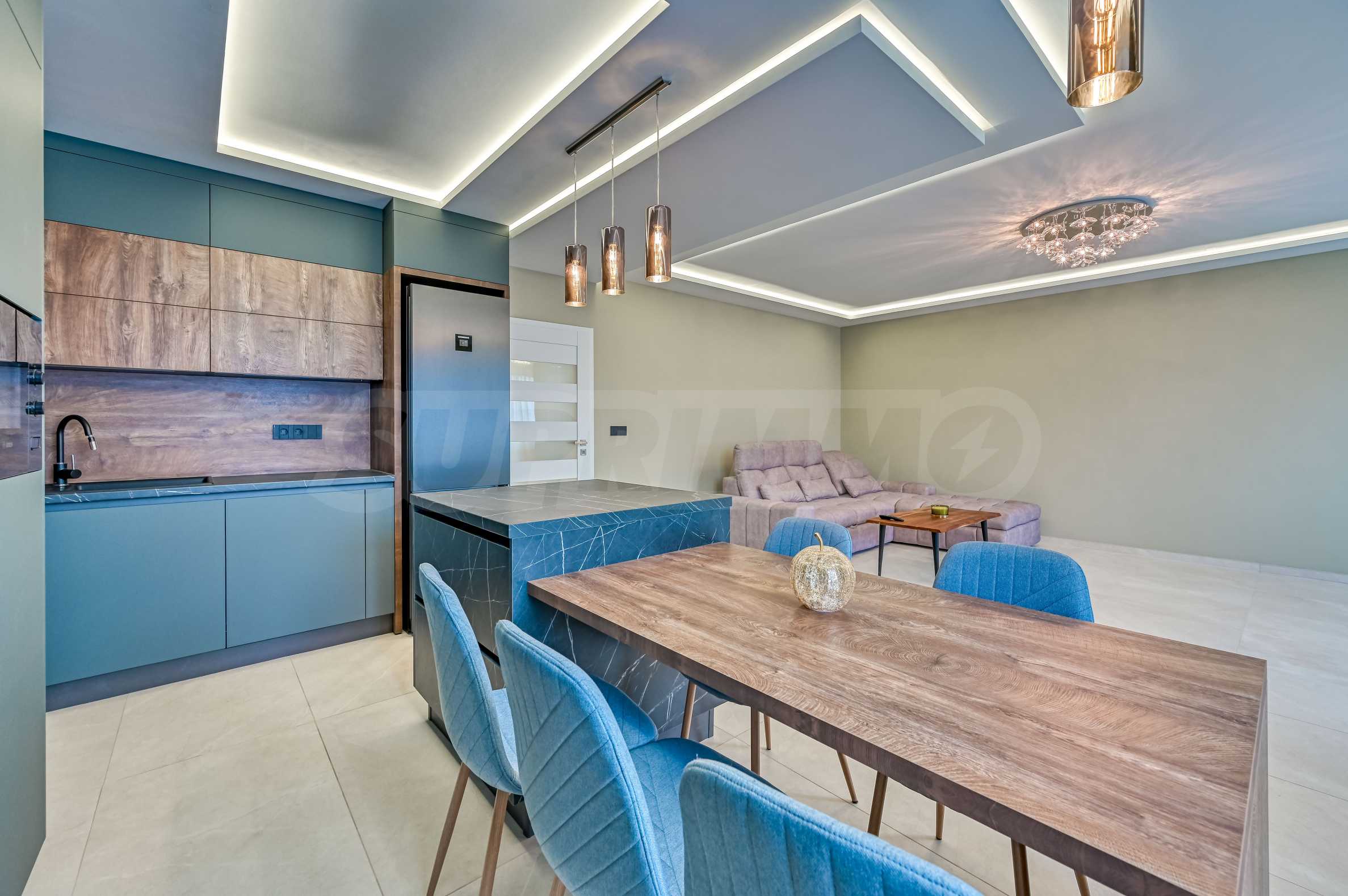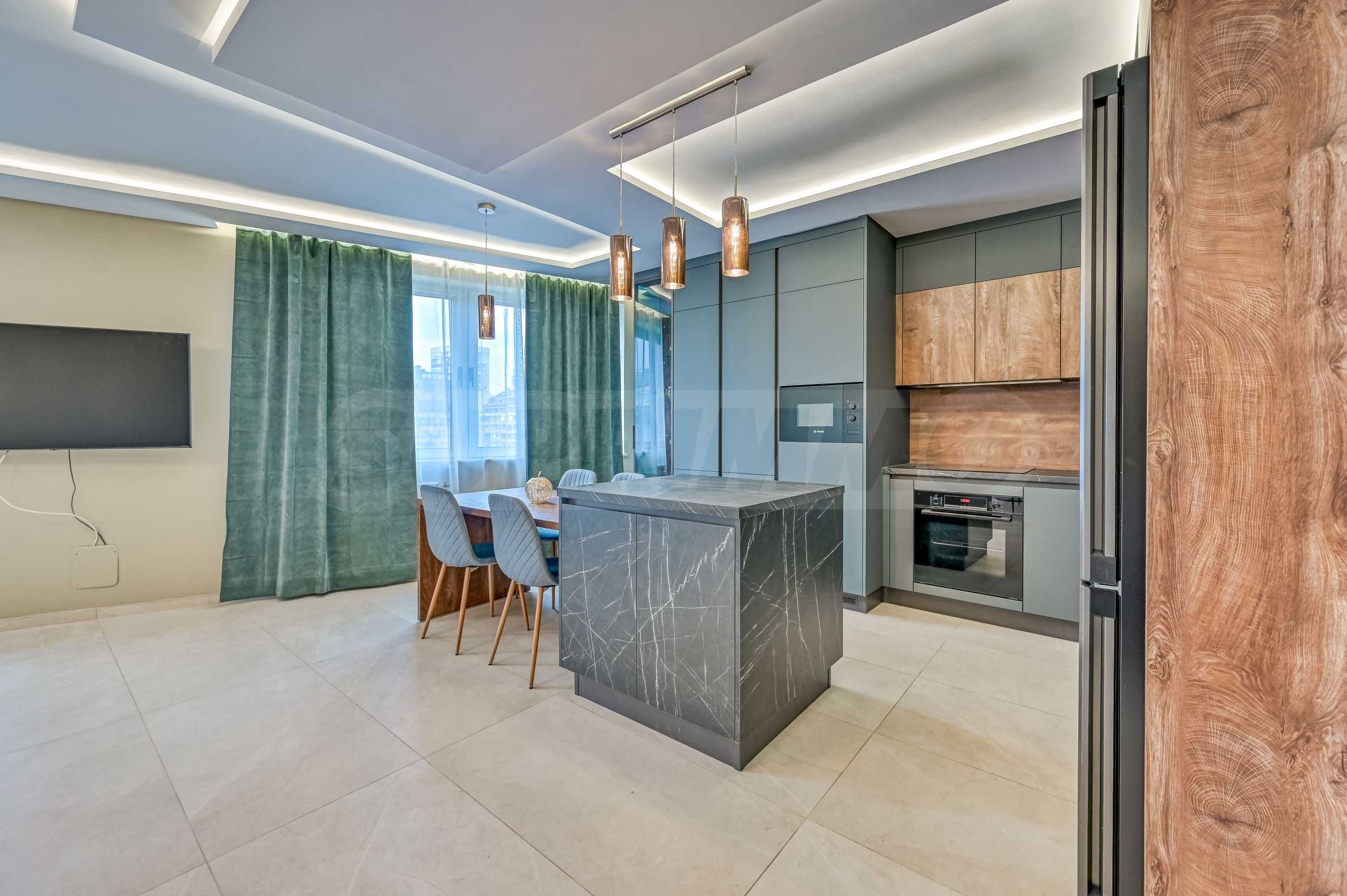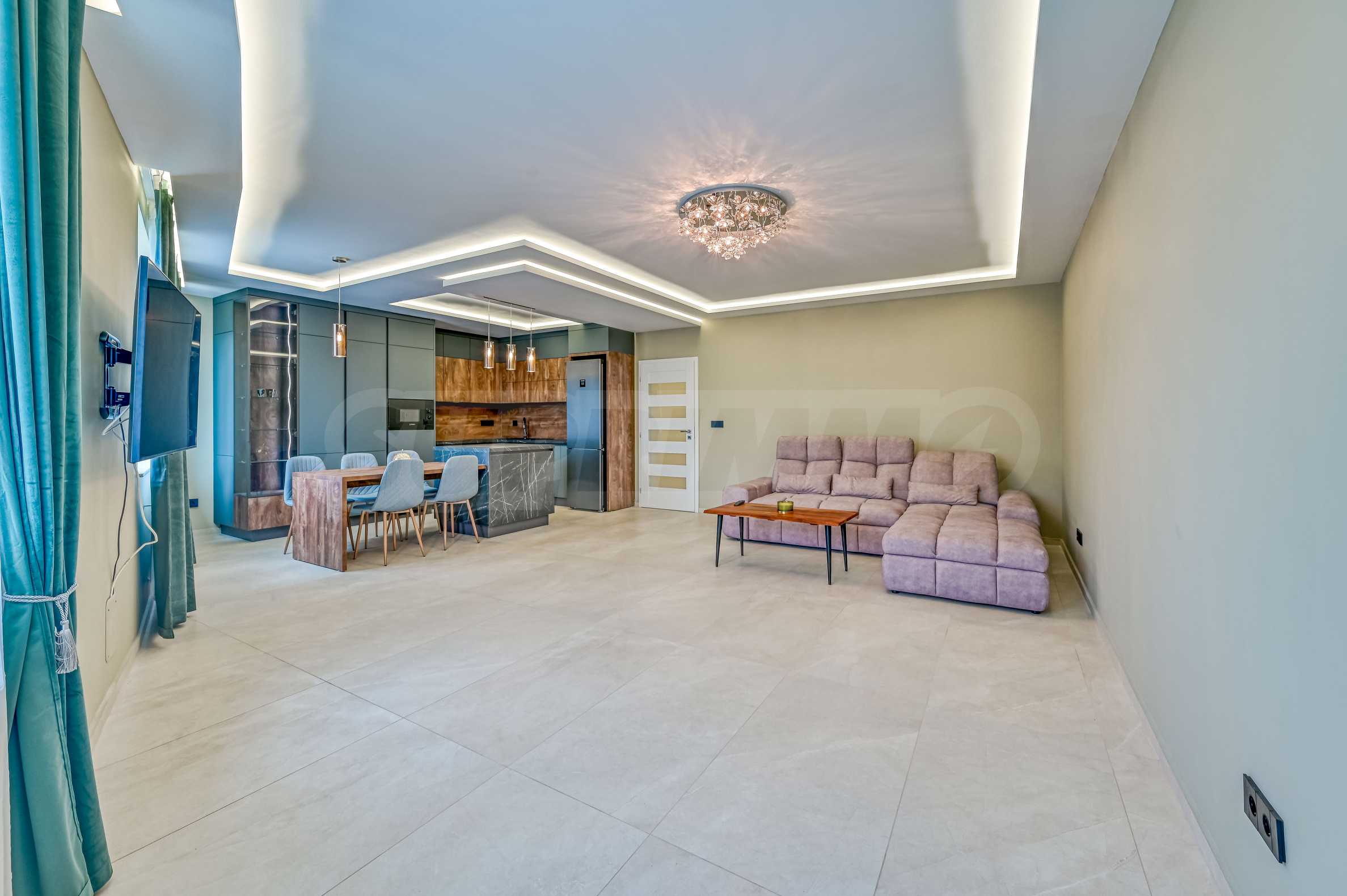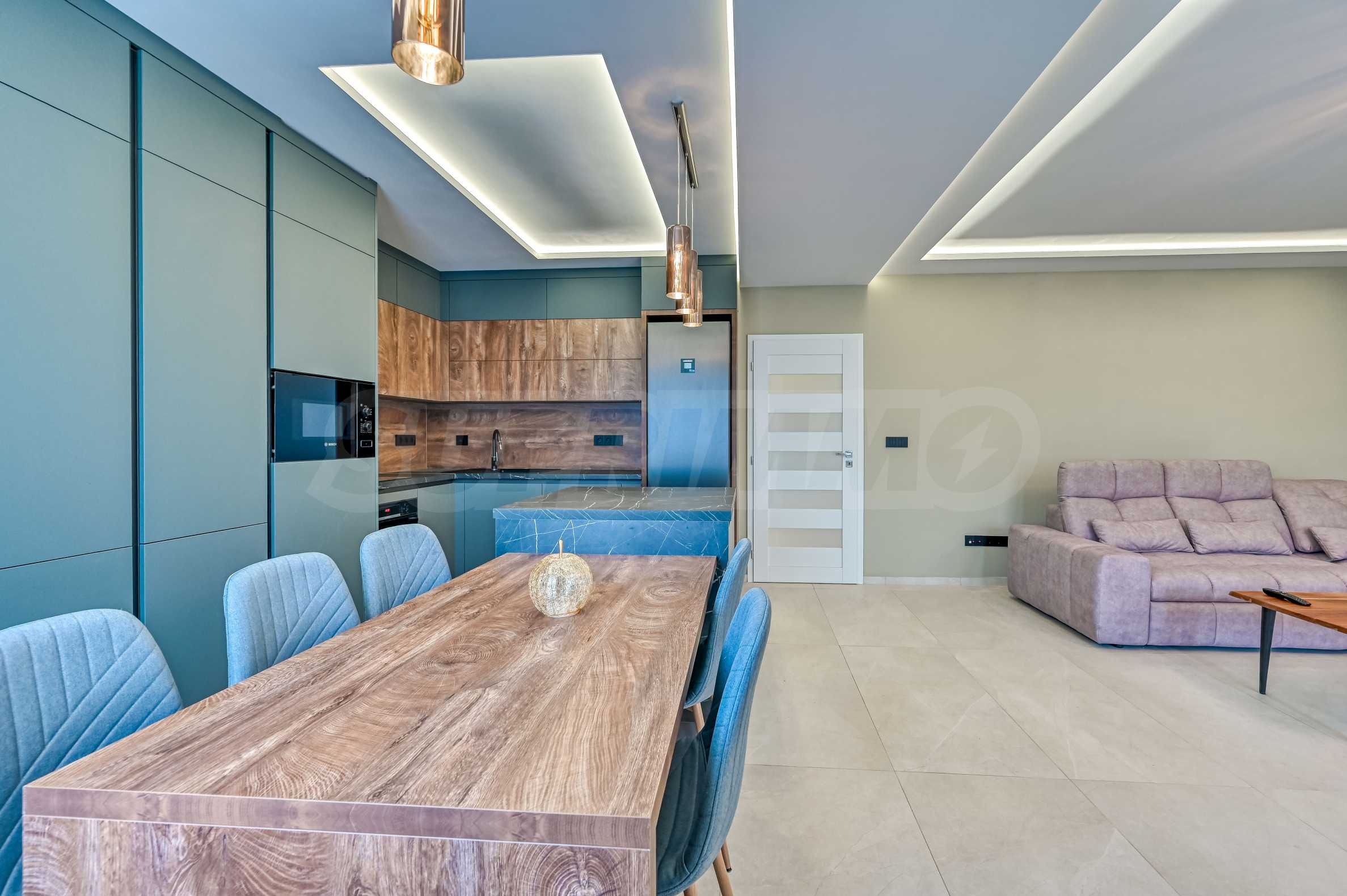 Квартира отличается простором, чистым дизайном и высококачественной отделкой. Она расположена на площади 120 кв. м и включает в себя просторную гостиную со столовой и полностью оборудованной кухней площадью 46 кв. м, главную спальню, вторую спальню, которую можно обставить по желанию арендатора, две ванные комнаты и террасу с видом на населенный пункт и гору Витоша.