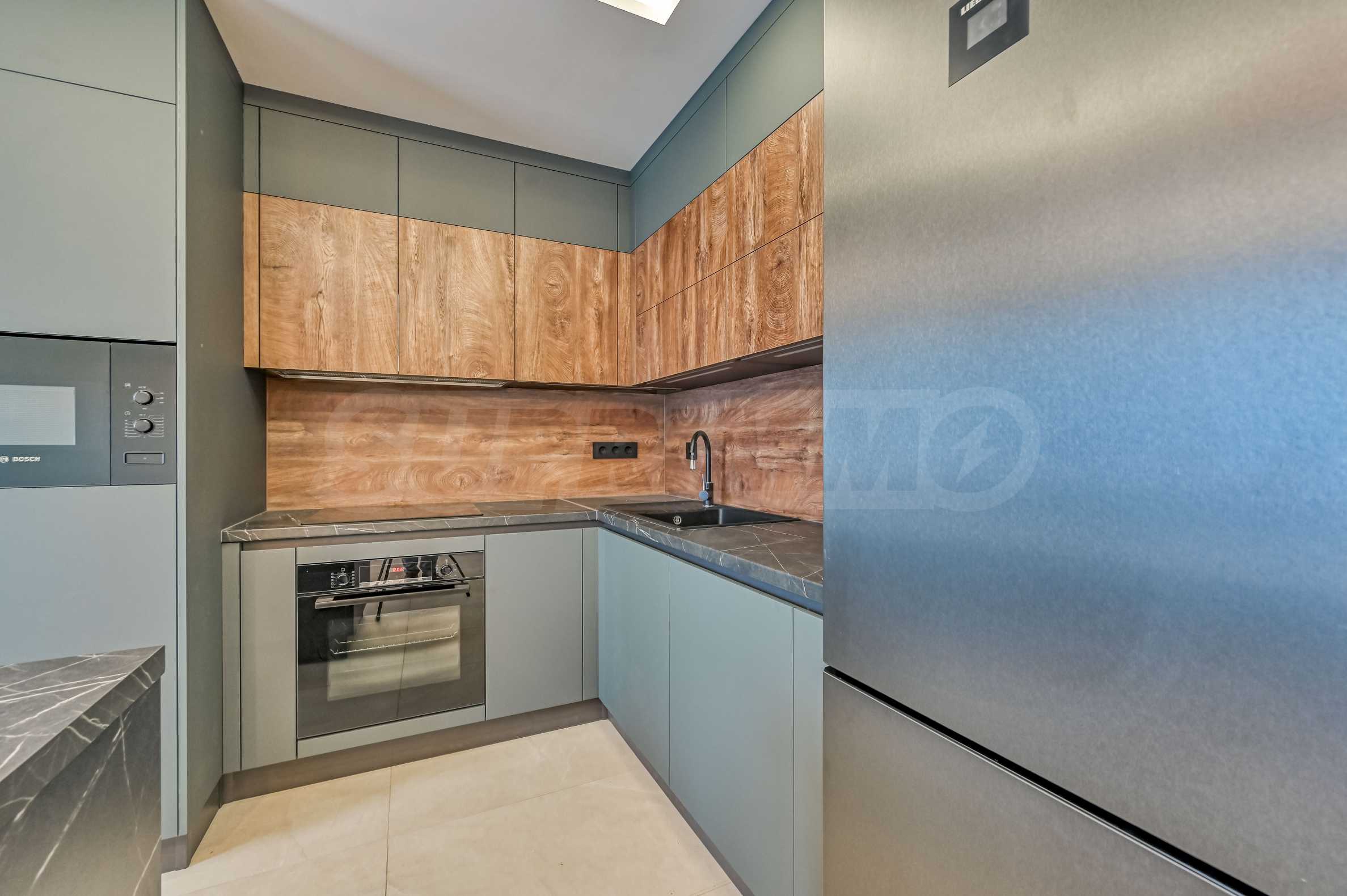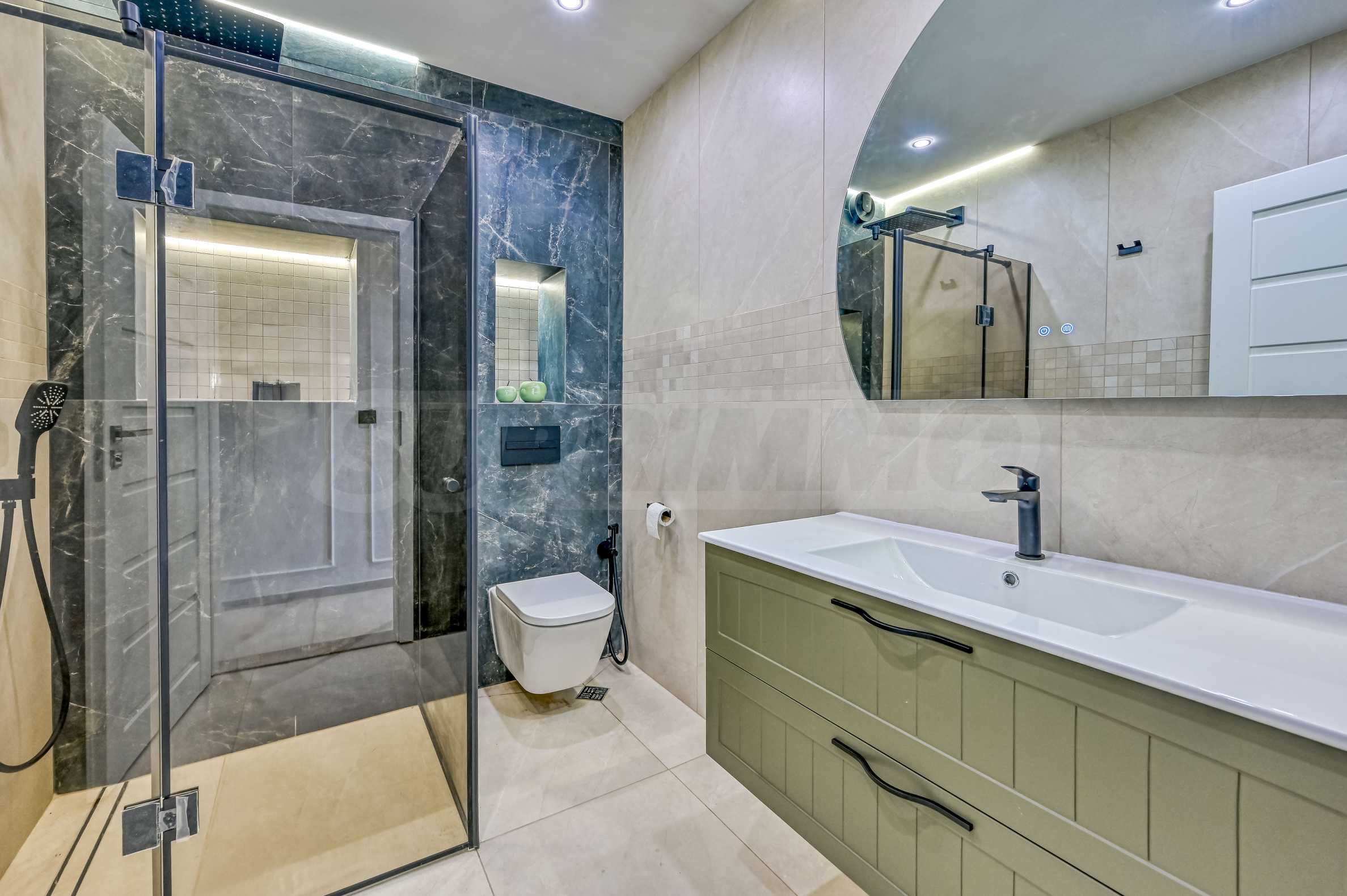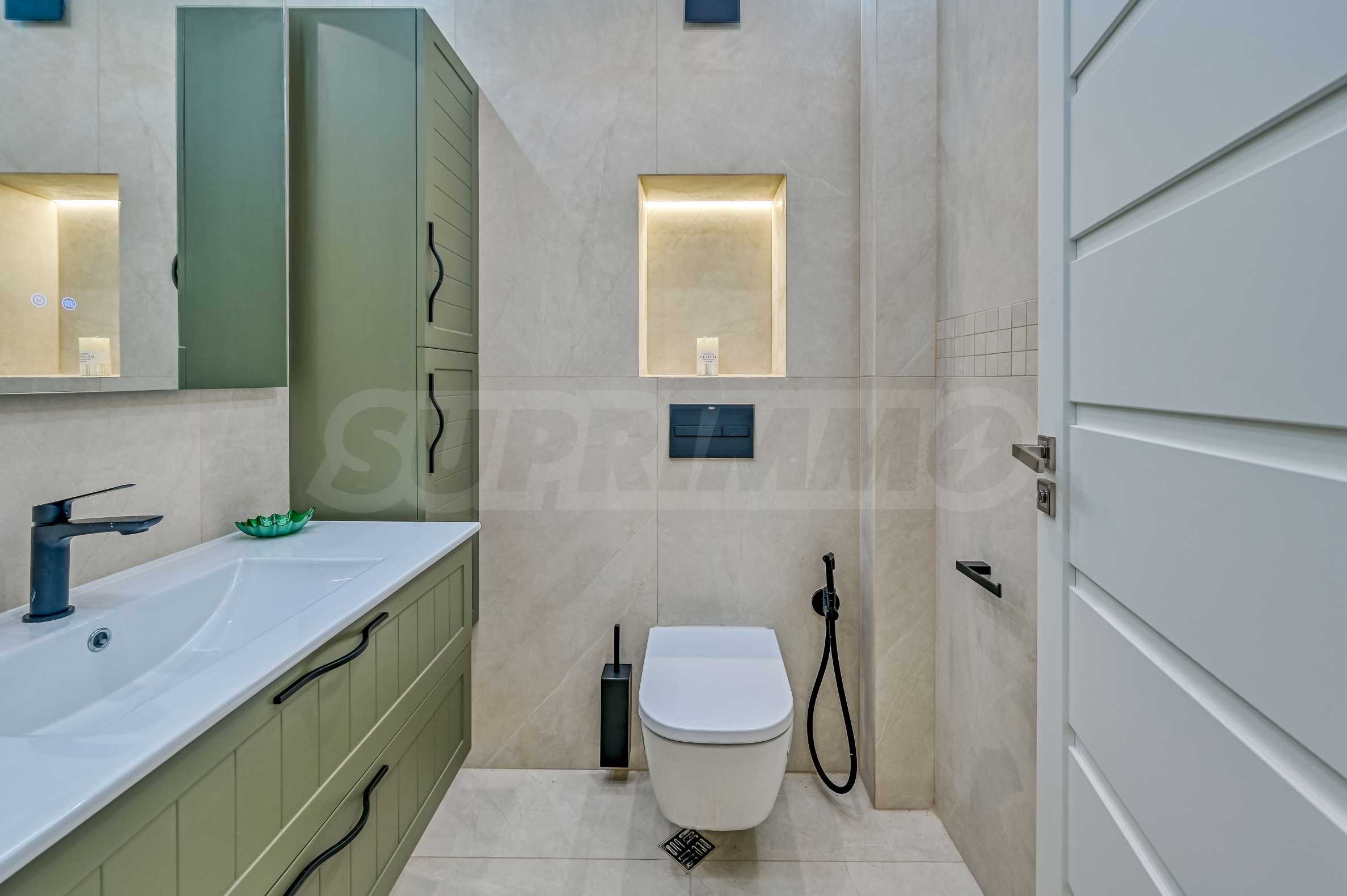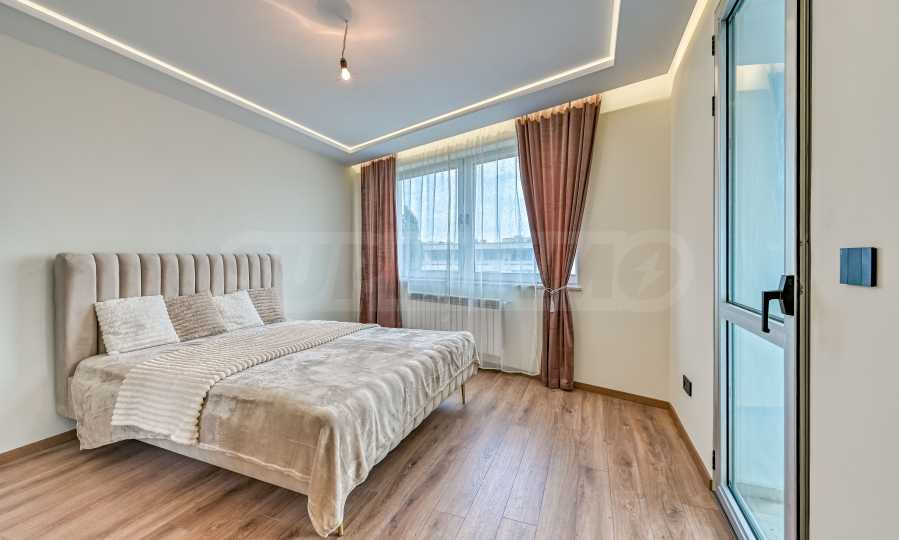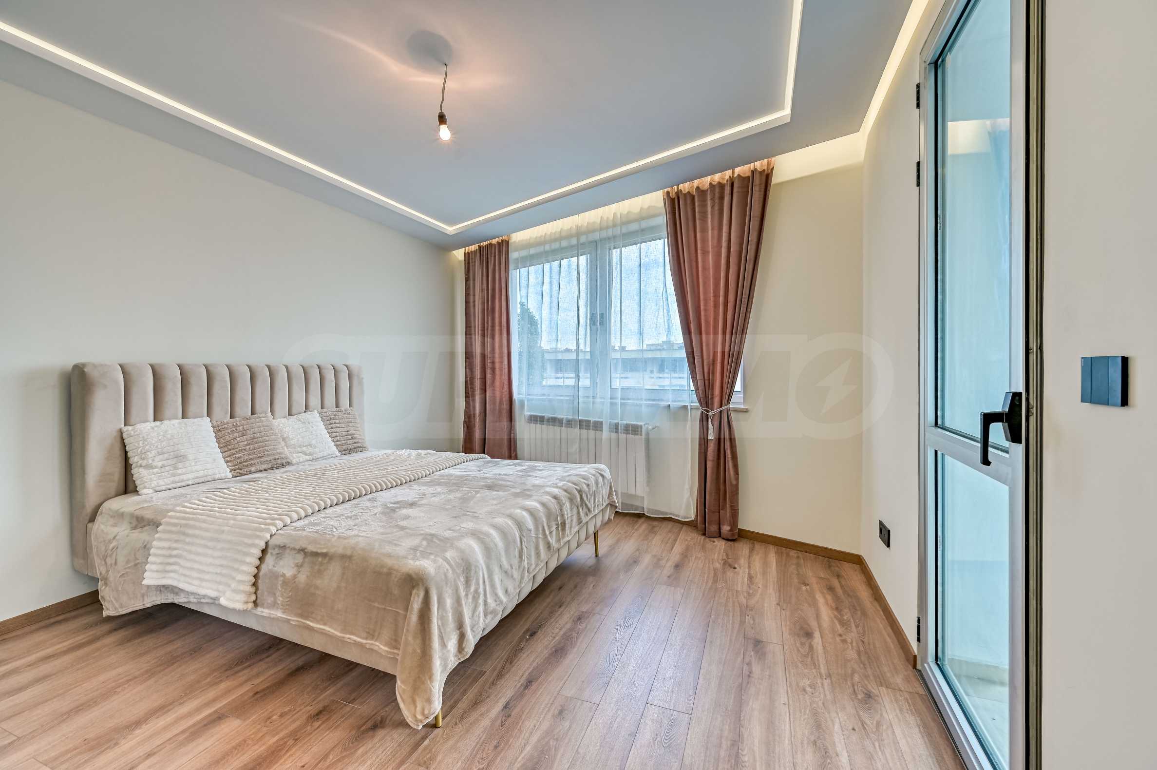 Квартира отличается простором, чистым дизайном и высококачественной отделкой. Она расположена на площади 120 кв. м и включает в себя просторную гостиную со столовой и полностью оборудованной кухней площадью 46 кв. м, главную спальню, вторую спальню, которую можно обставить по желанию арендатора, две ванные комнаты и террасу с видом на населенный пункт и гору Витоша.