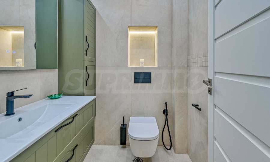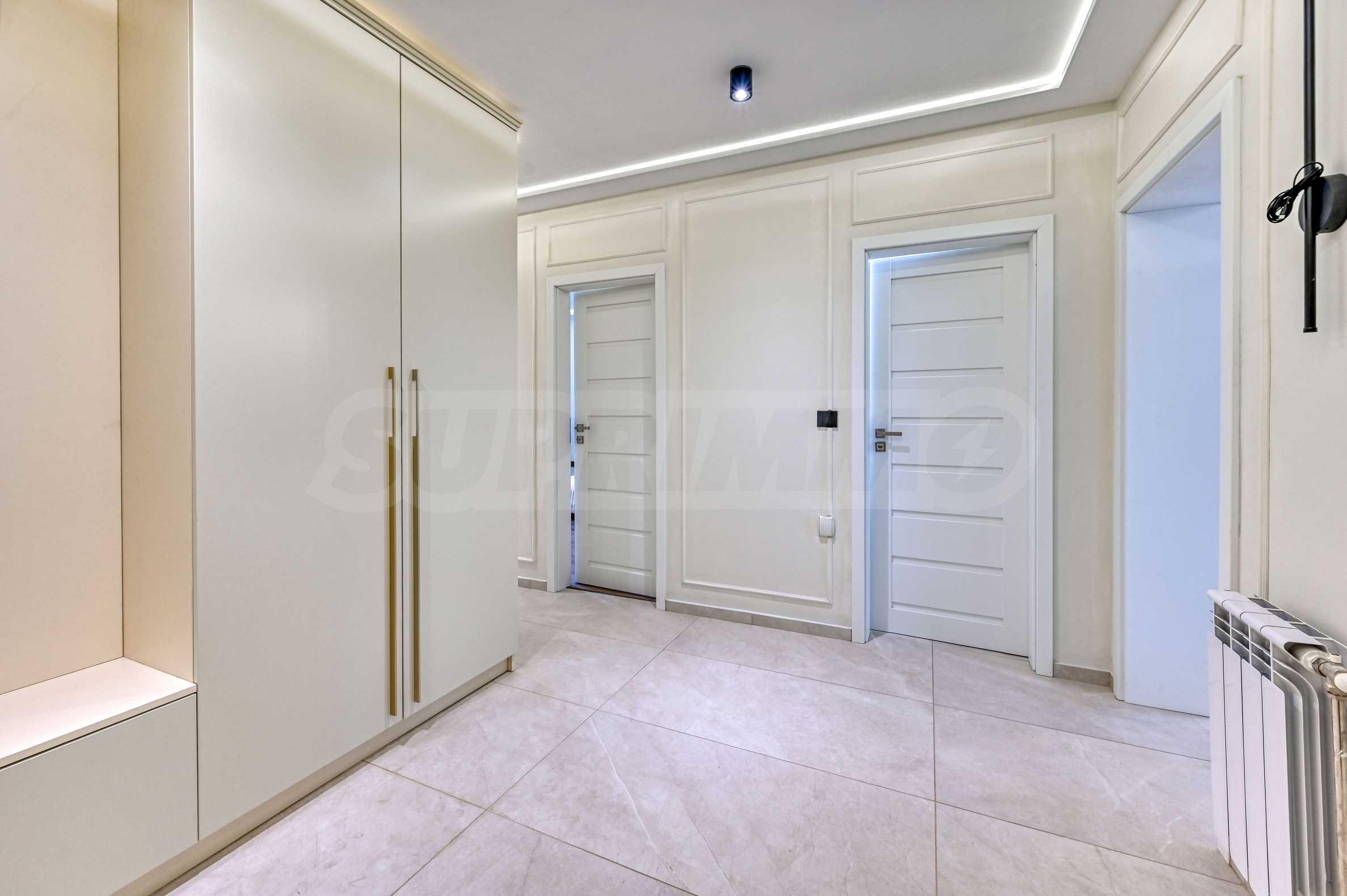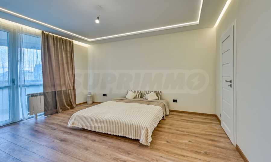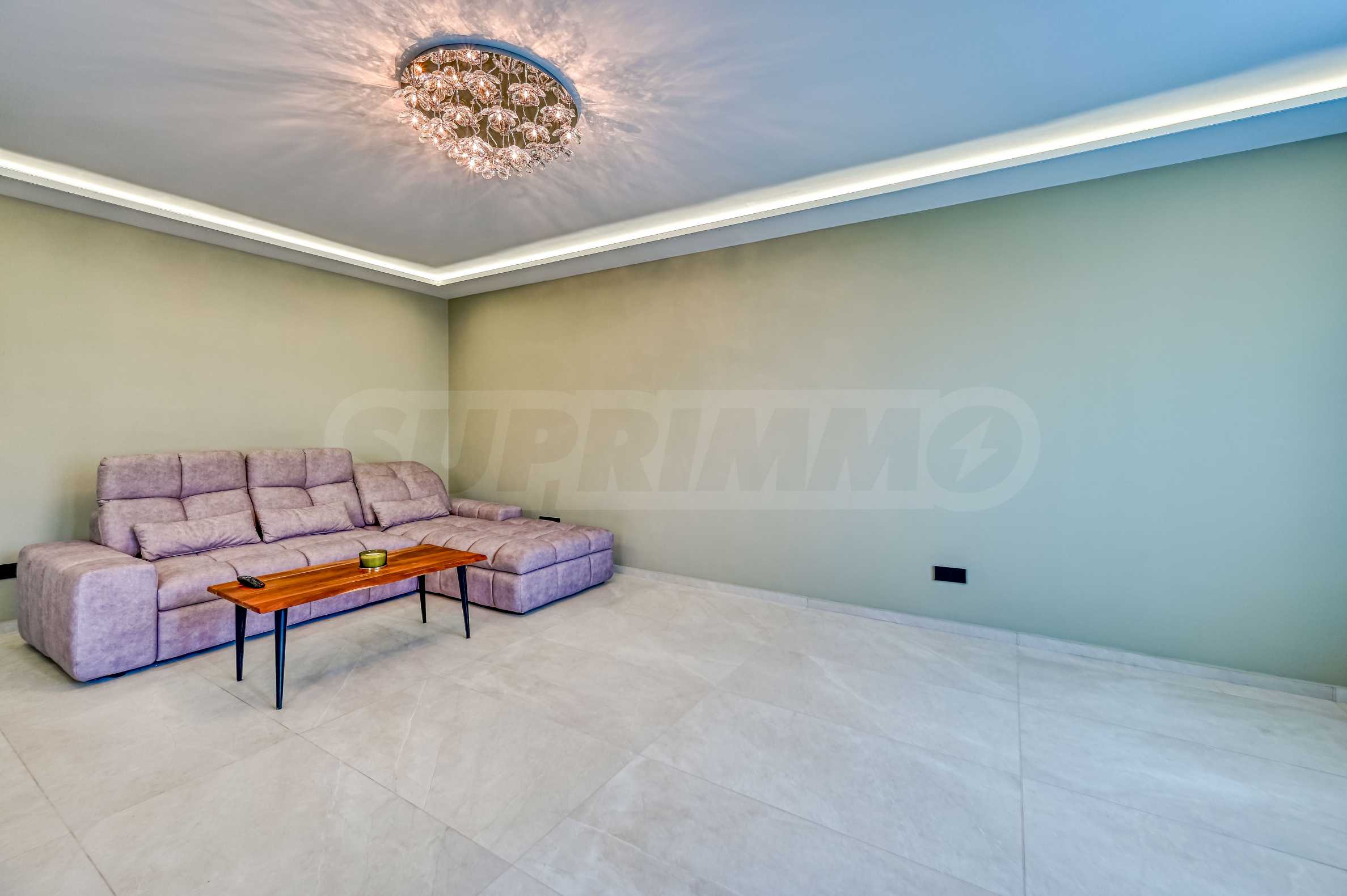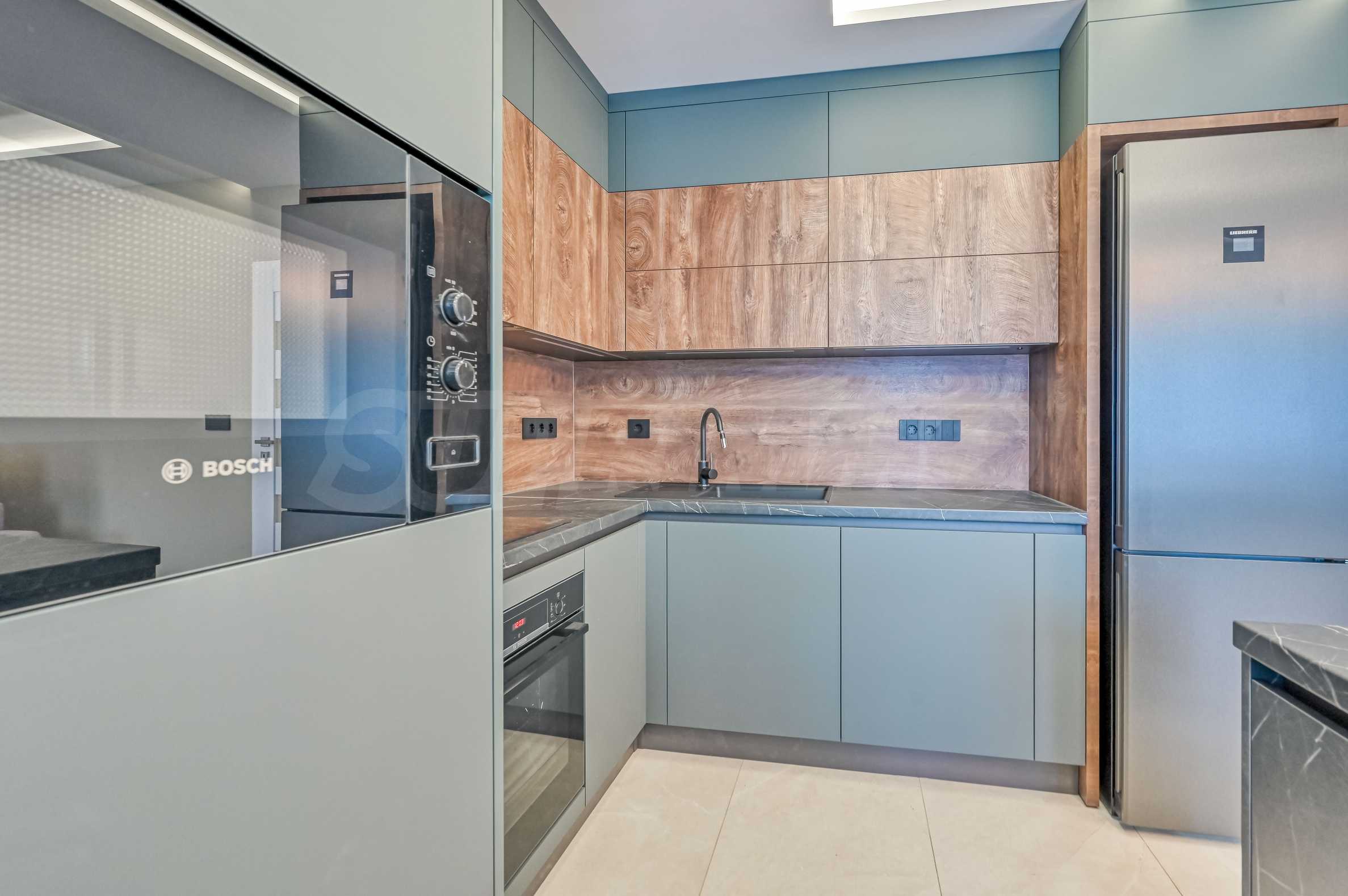 Квартира отличается простором, чистым дизайном и высококачественной отделкой. Она расположена на площади 120 кв. м и включает в себя просторную гостиную со столовой и полностью оборудованной кухней площадью 46 кв. м, главную спальню, вторую спальню, которую можно обставить по желанию арендатора, две ванные комнаты и террасу с видом на населенный пункт и гору Витоша.