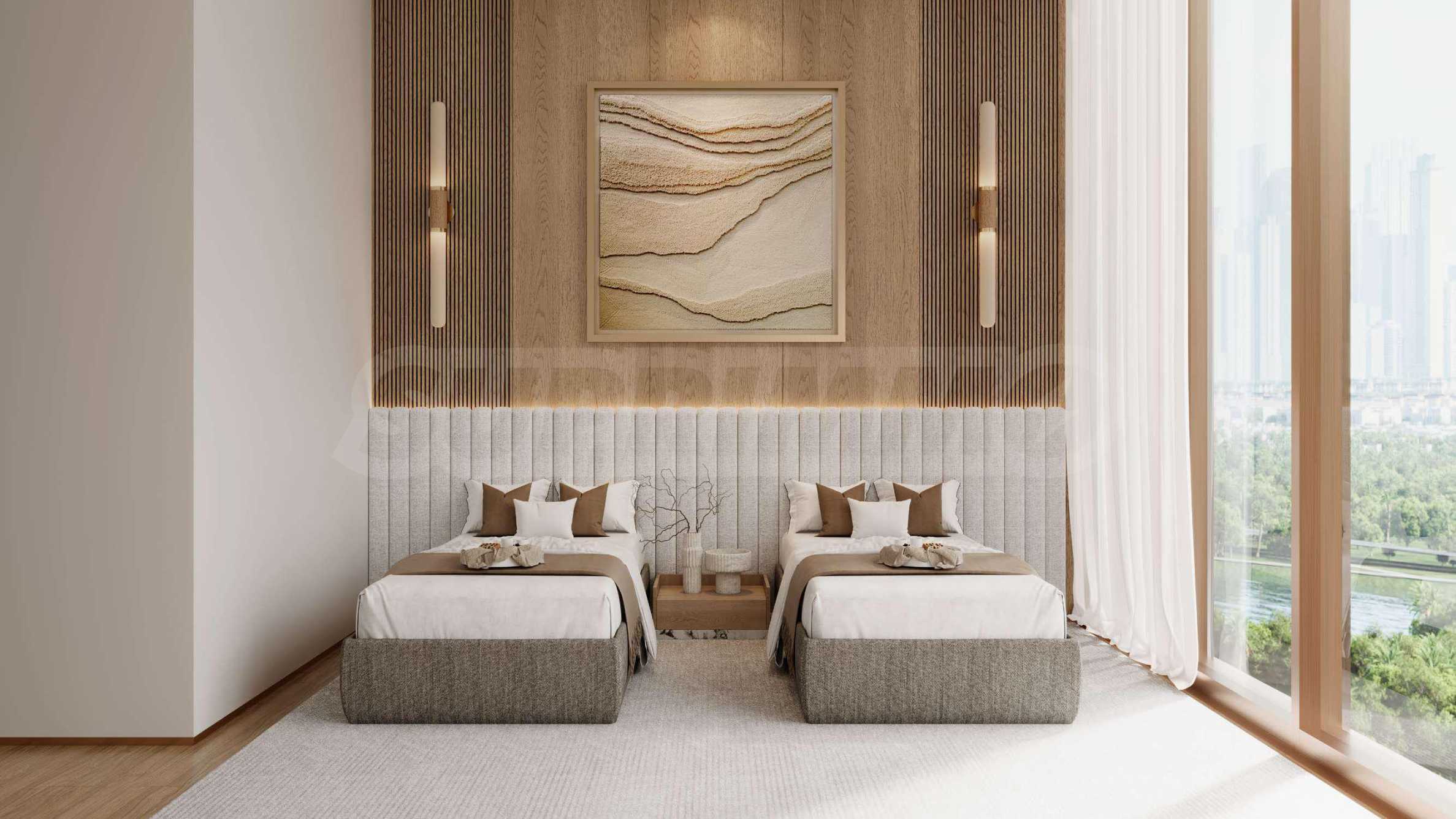 Квартира полностью меблирована. Команда дизайнеров интерьера Wynwood продумала каждую деталь с профессионализмом, вкусом и вниманием. От стильной мебели в гостиной до удобных кроватей в спальнях — всё было подобрано с целью создания изысканной, уютной и гармоничной атмосферы.