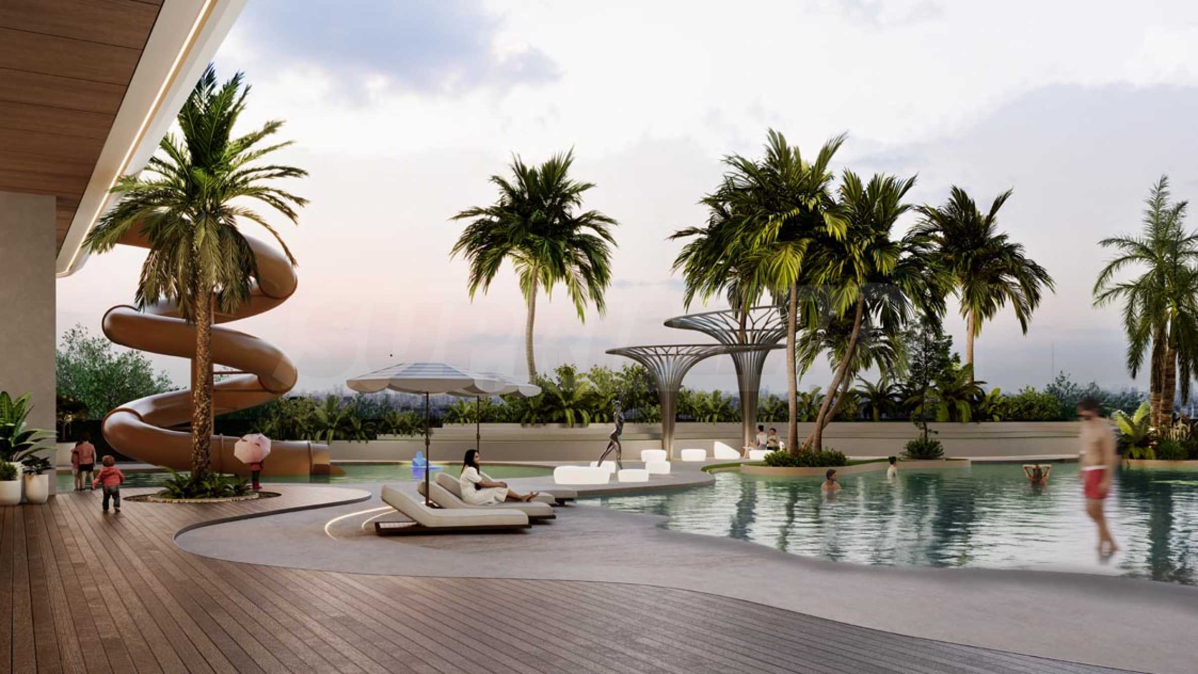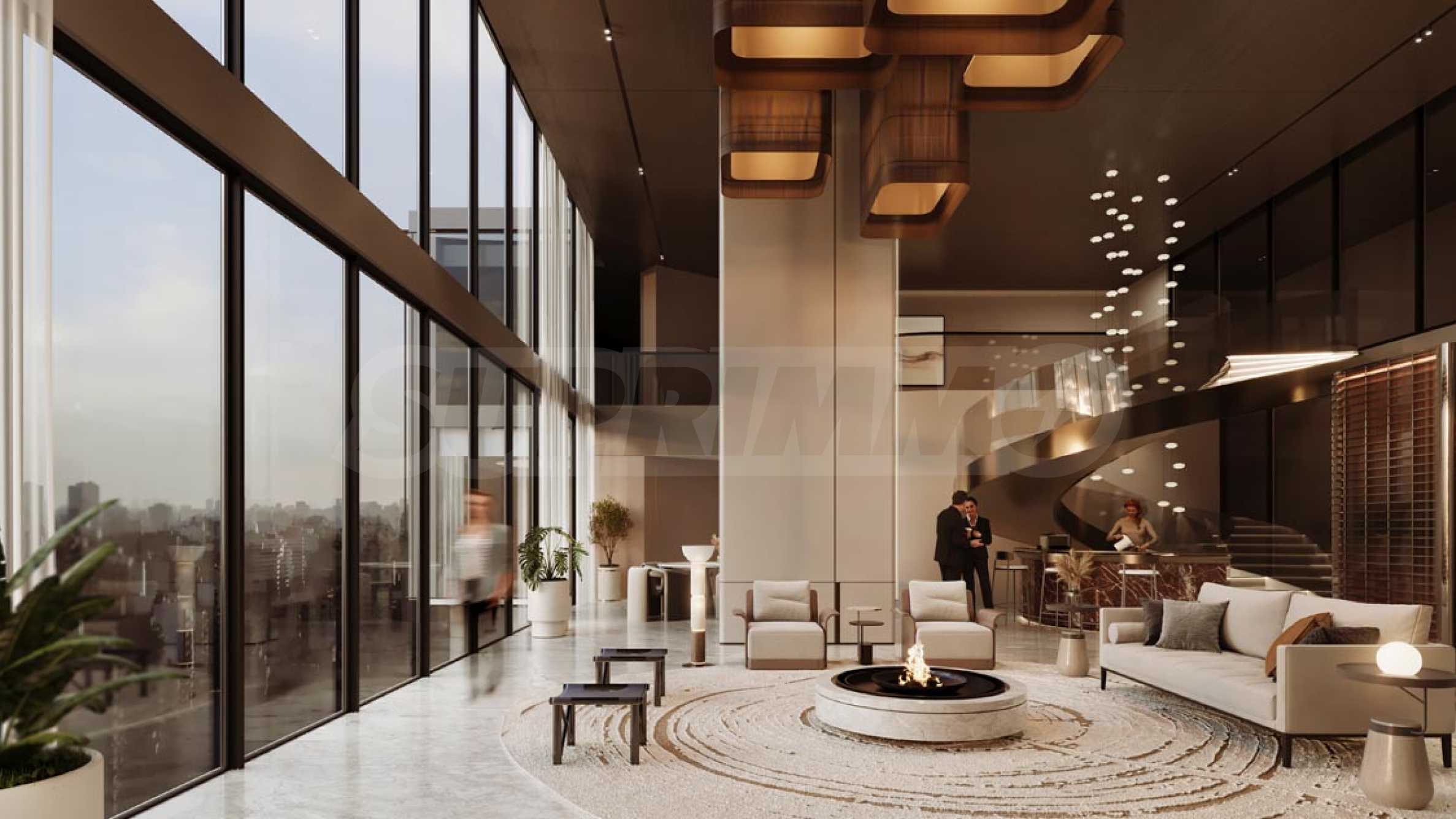 Помимо впечатляющего фасада, украшенного золотыми элементами и стеклом, здание отличается необычайно просторным вестибюлем, где также предусмотрены зоны для отдыха и встреч с друзьями и соседями. Для приятного времяпрепровождения в Marquis One предусмотрены большой открытый бассейн, тренажерный зал с зоной для йоги – идеальное место для тренировок и восстановления сил. Также имеется зона SPA, где можно расслабиться. Свободное время можно провести в богато благоустроенных садах комплекса, которые подходят как для неспешных прогулок, так и для пробежек.