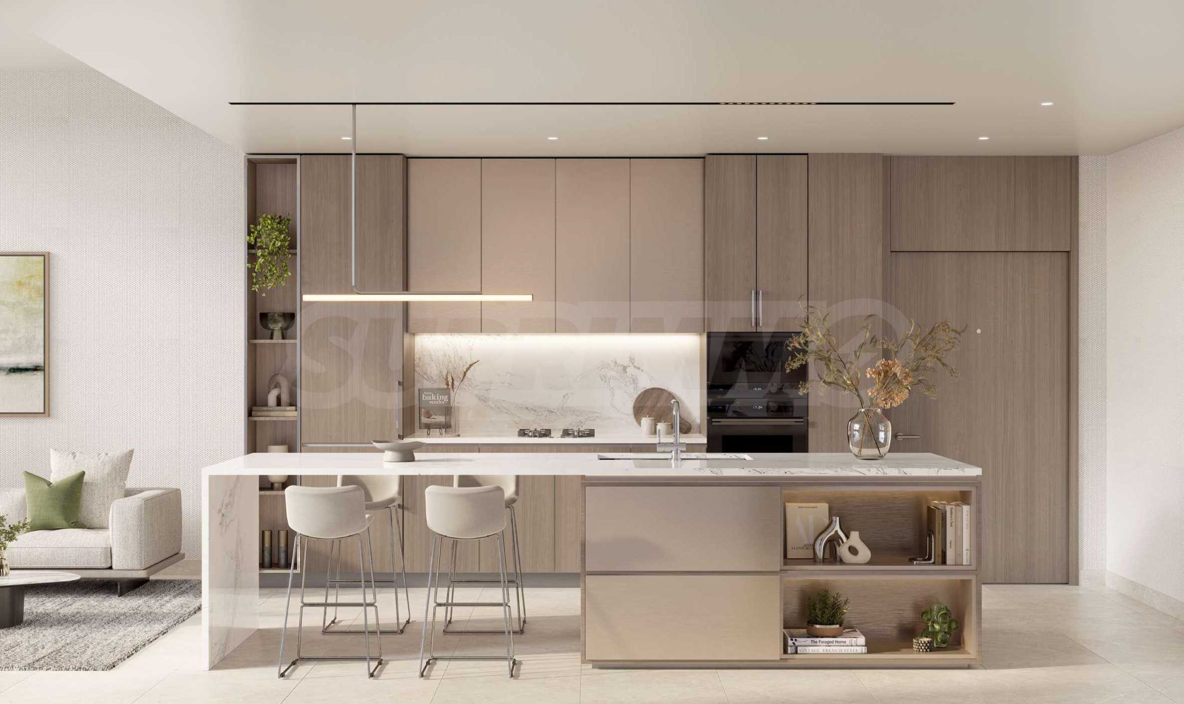В каждом доме жильцов встречают большие, чем обычно, двери, которые придают изысканный акцент элегантности. Полы покрыты крупной керамогранитной плиткой светлых тонов, придавая интерьеру свежесть и дополнительный простор. Кухни полностью готовы и оснащены элегантными шкафами, высококачественной техникой и каменными столешницами, дополненными встроенной мойкой из нержавеющей стали. Все детали продуманы, чтобы создать идеальную среду для вашего кулинарного вдохновения.