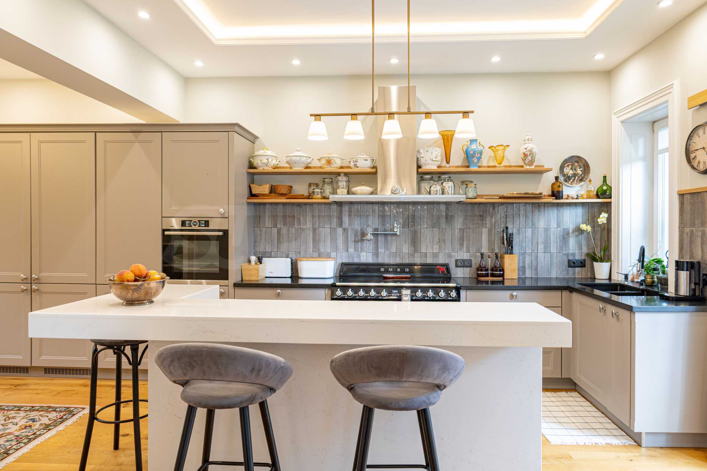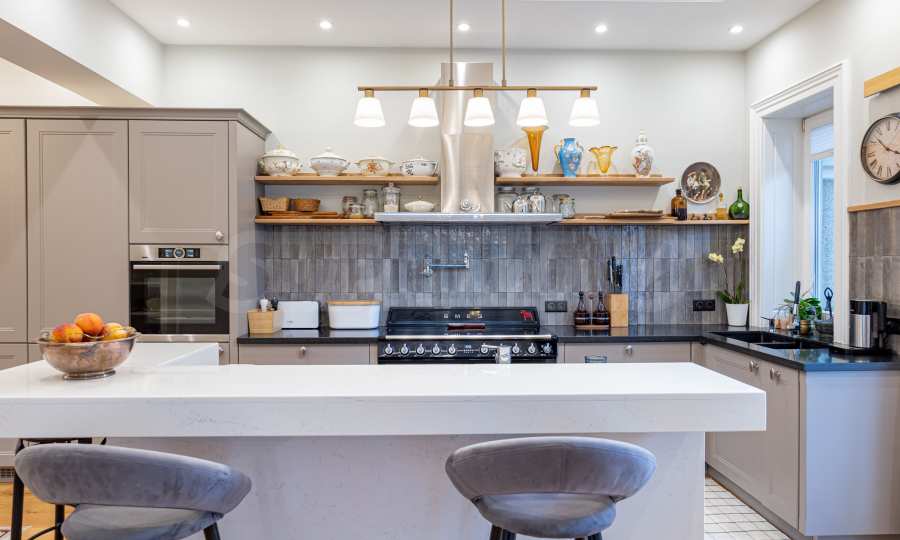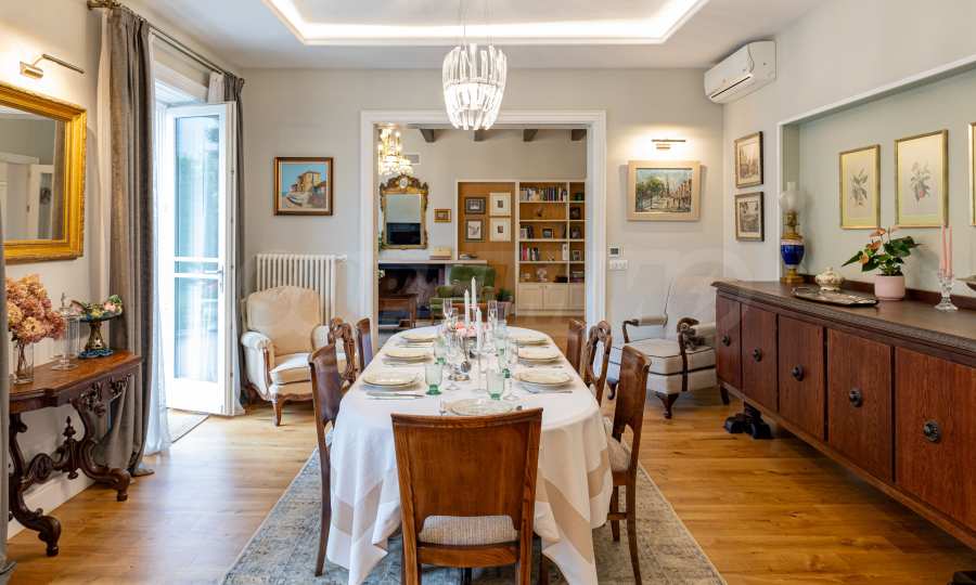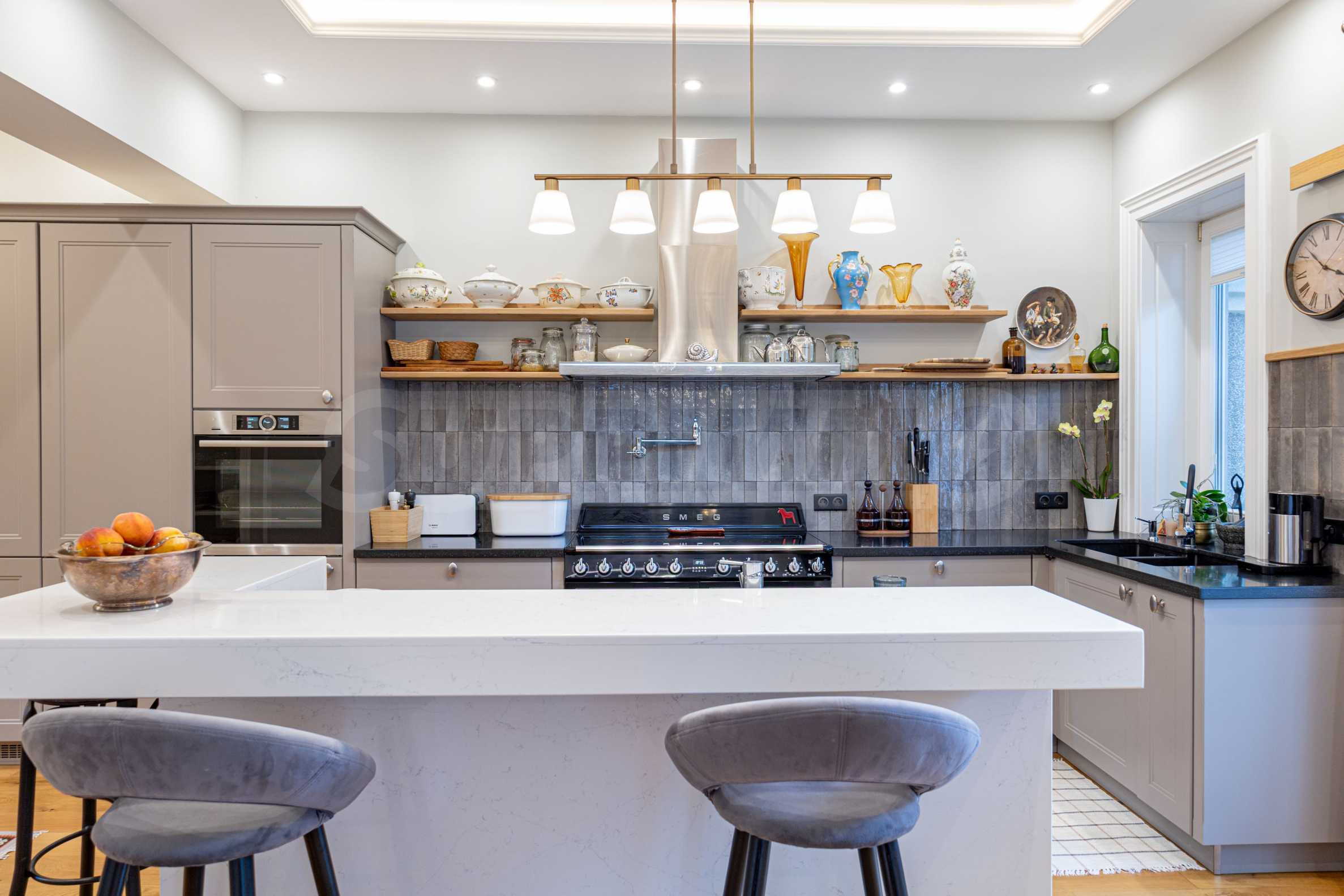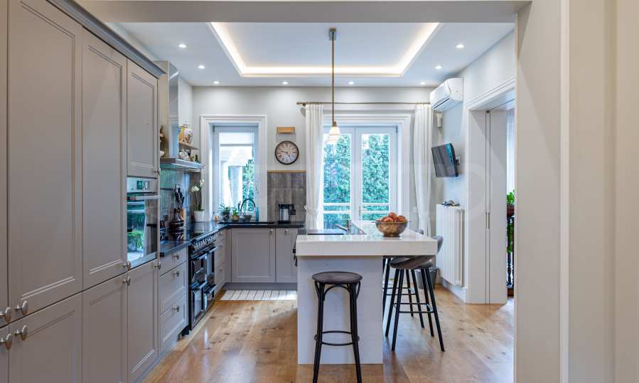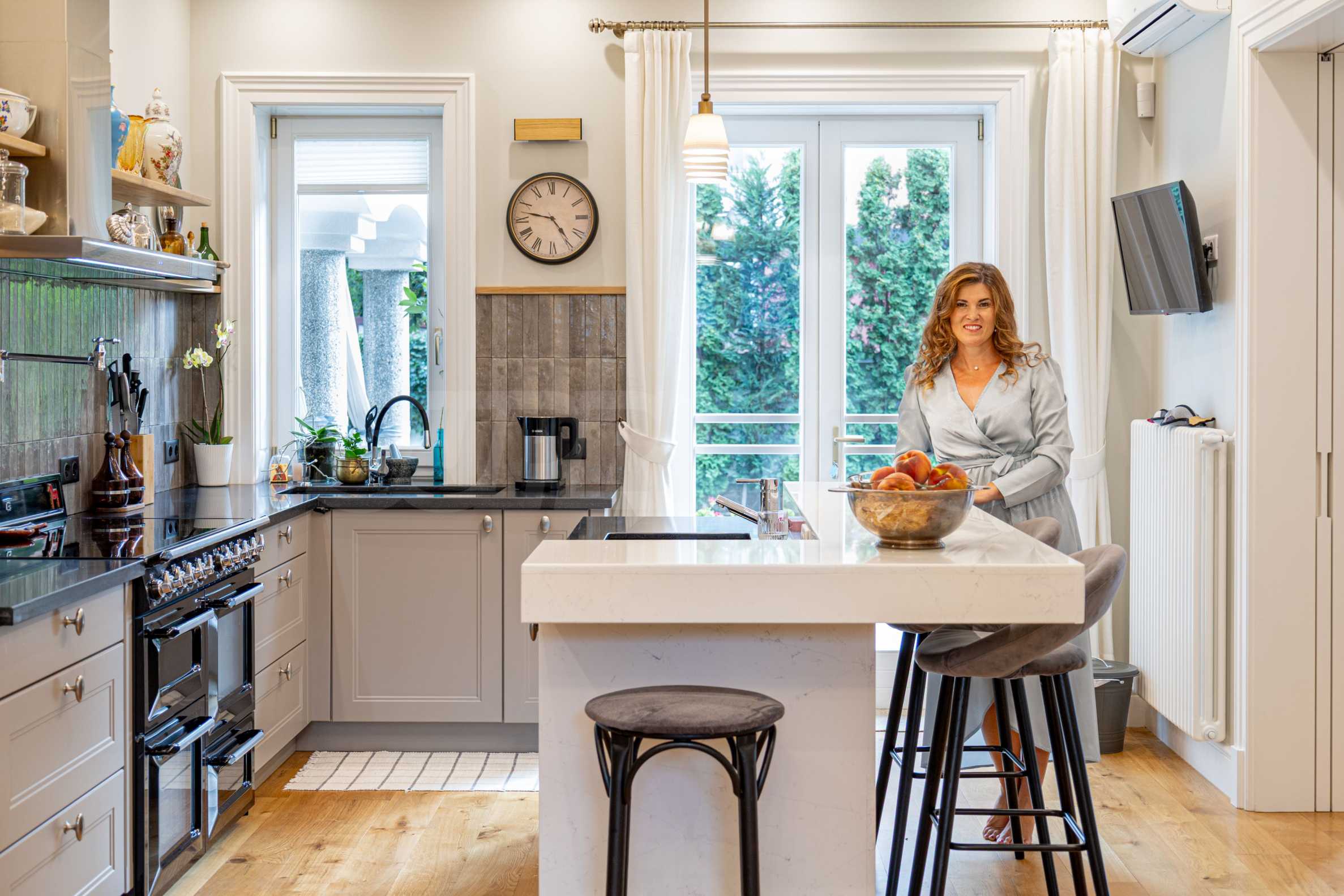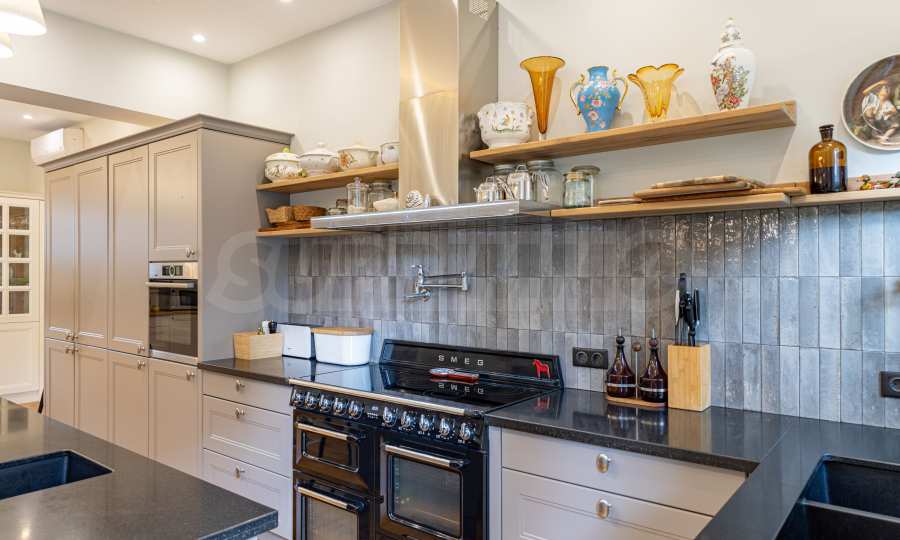 На первом этаже с трехметровыми потолками и красивыми окнами расположены чудесная гостиная и столовая, просторная и современная кухня с рабочей зоной и бытовой техникой — мечта любого повара. Из всех комнат есть выход в прекрасный сад и на просторную веранду, где можно разместить гостей долгими летними вечерами.