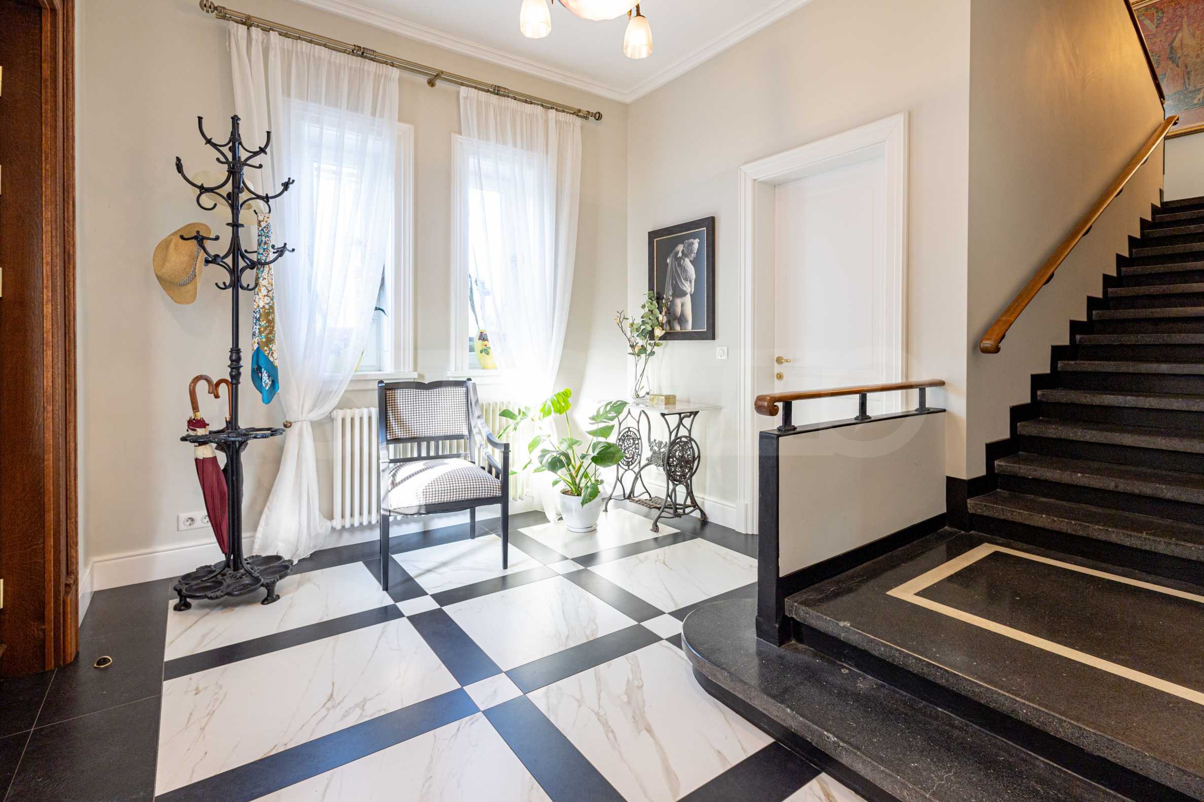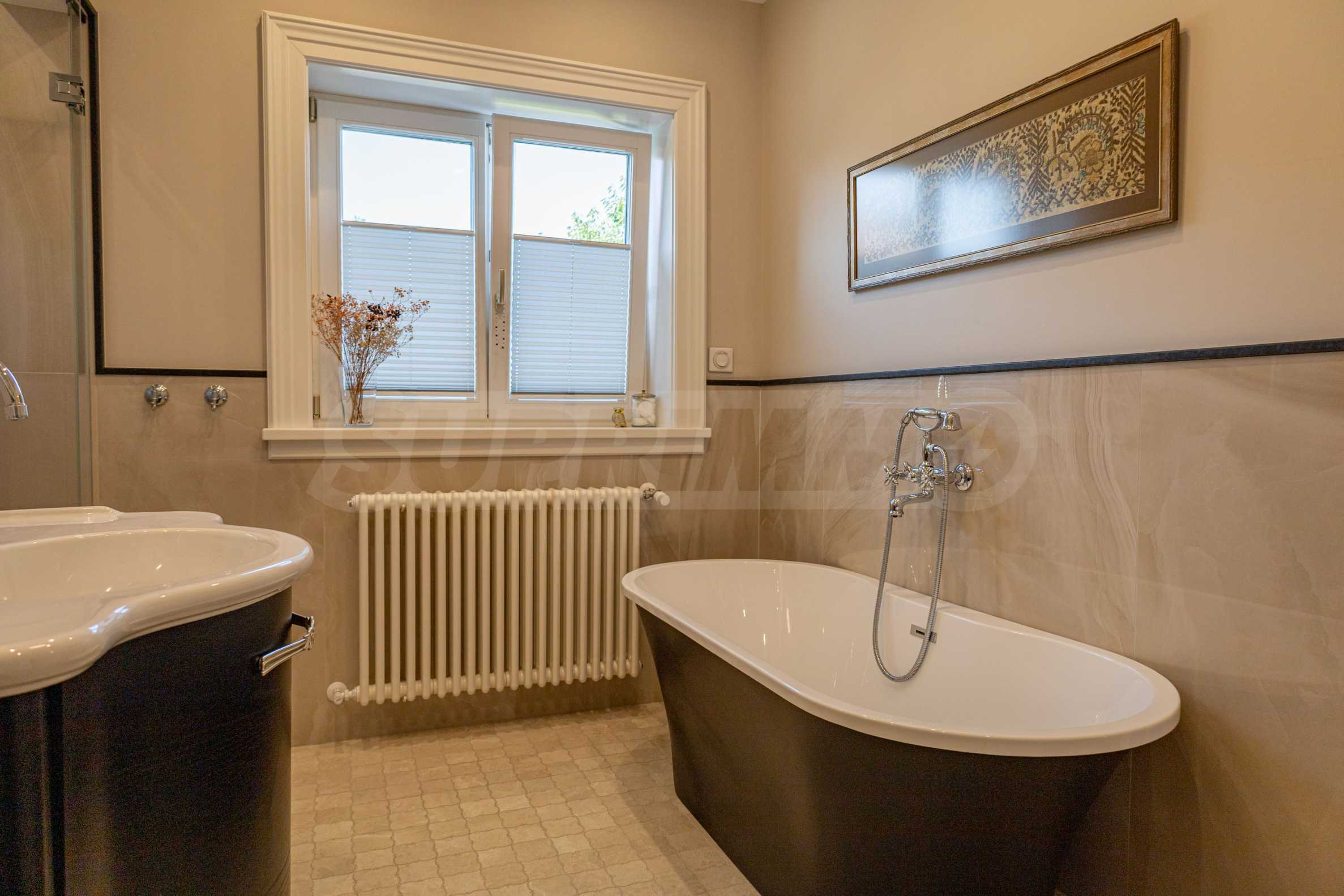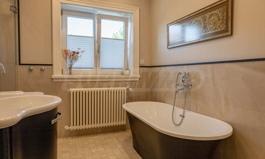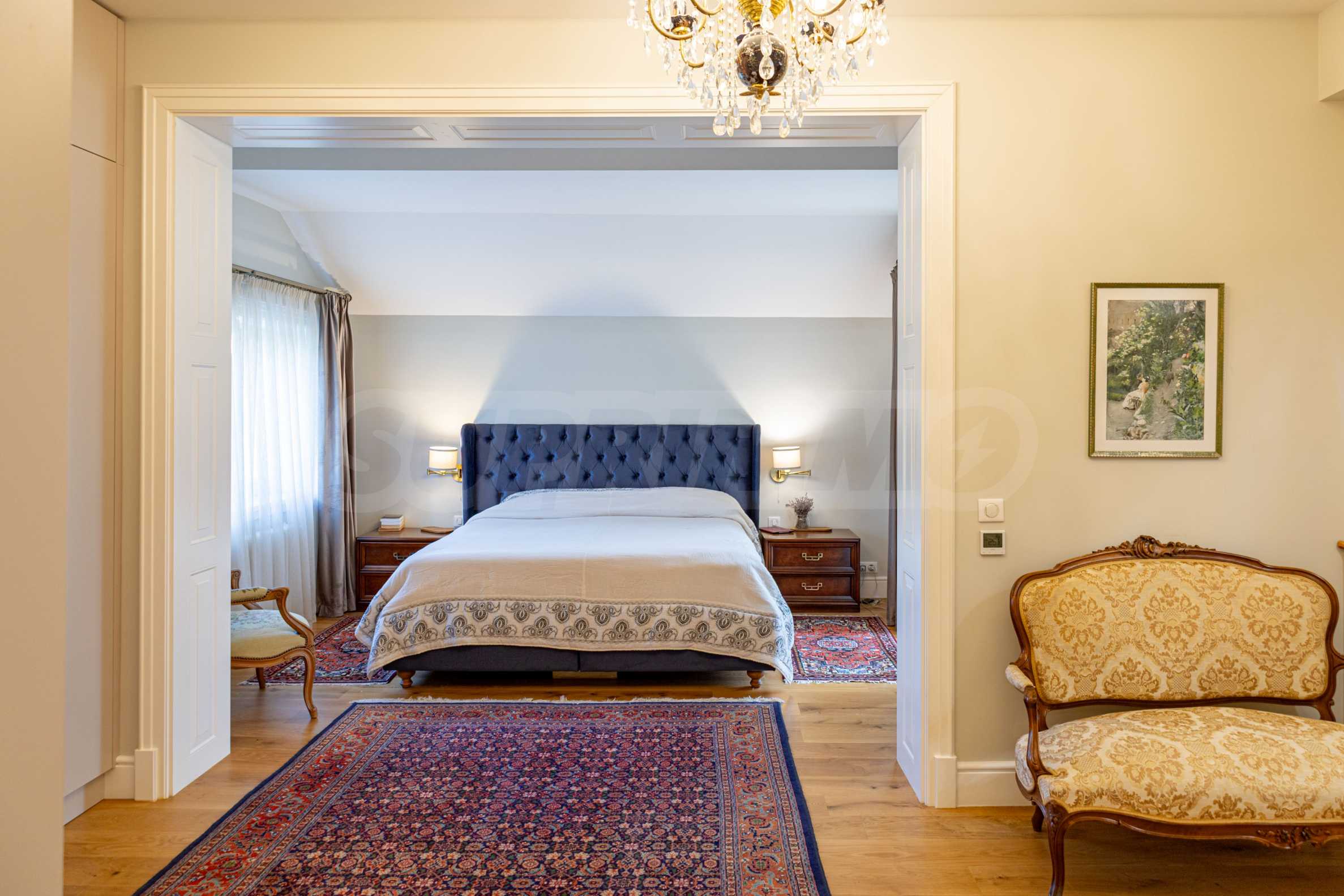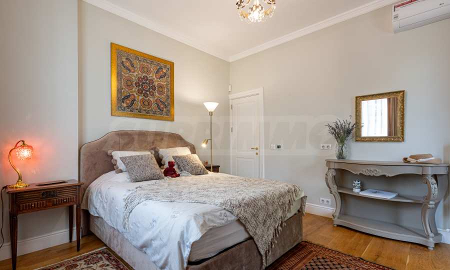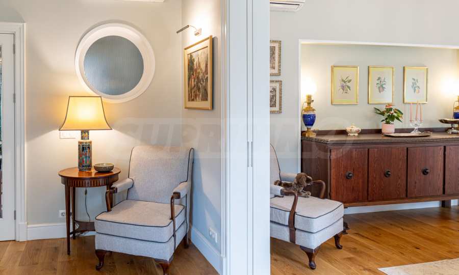Красивая лестница с отреставрированной мозаикой и перилами ведет на второй этаж, где расположены две спальни с ванной комнатой и туалетом, отдельный туалет, главная спальня с гардеробной и ванной комнатой, а также кабинет с собственной ванной комнатой. Здесь же находится просторная терраса с видом на внутренний двор и гору Витоша.