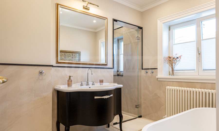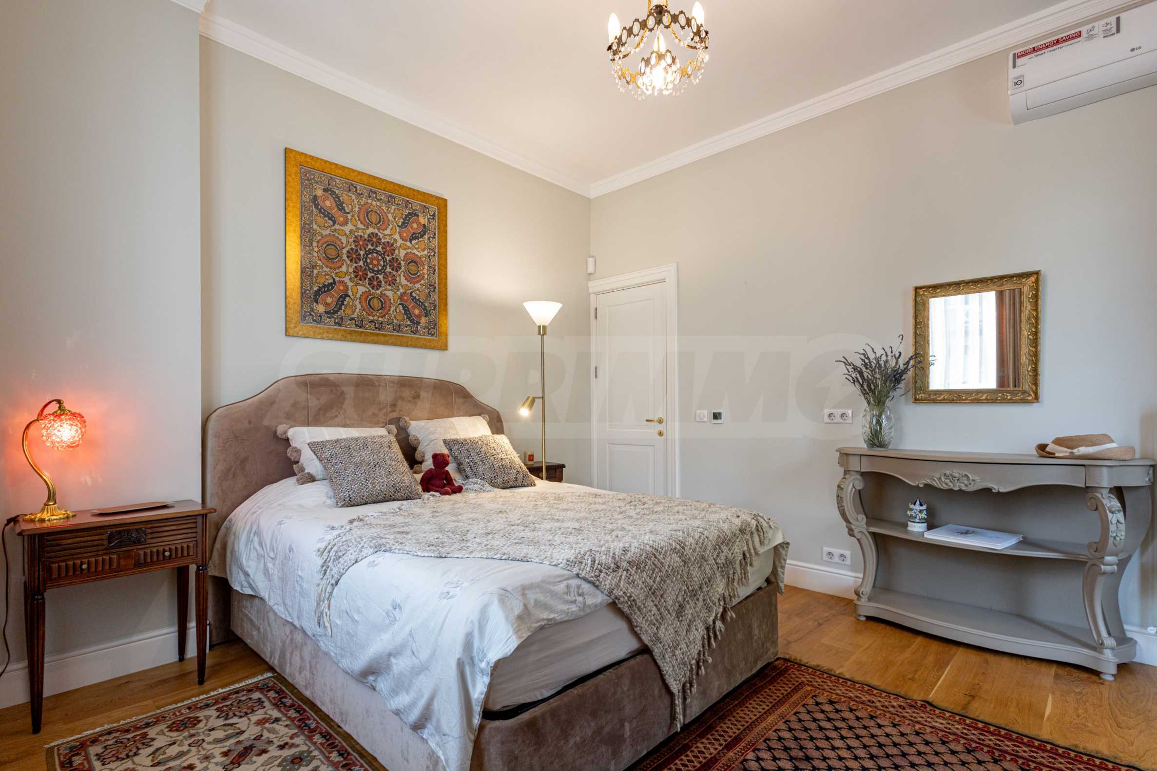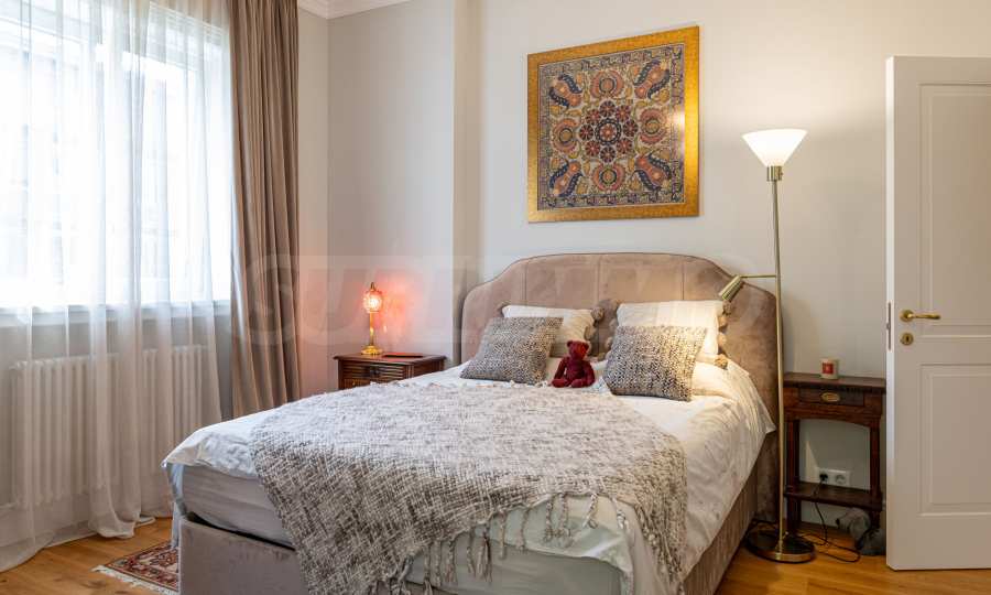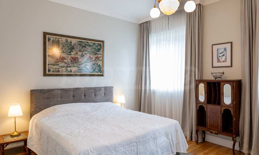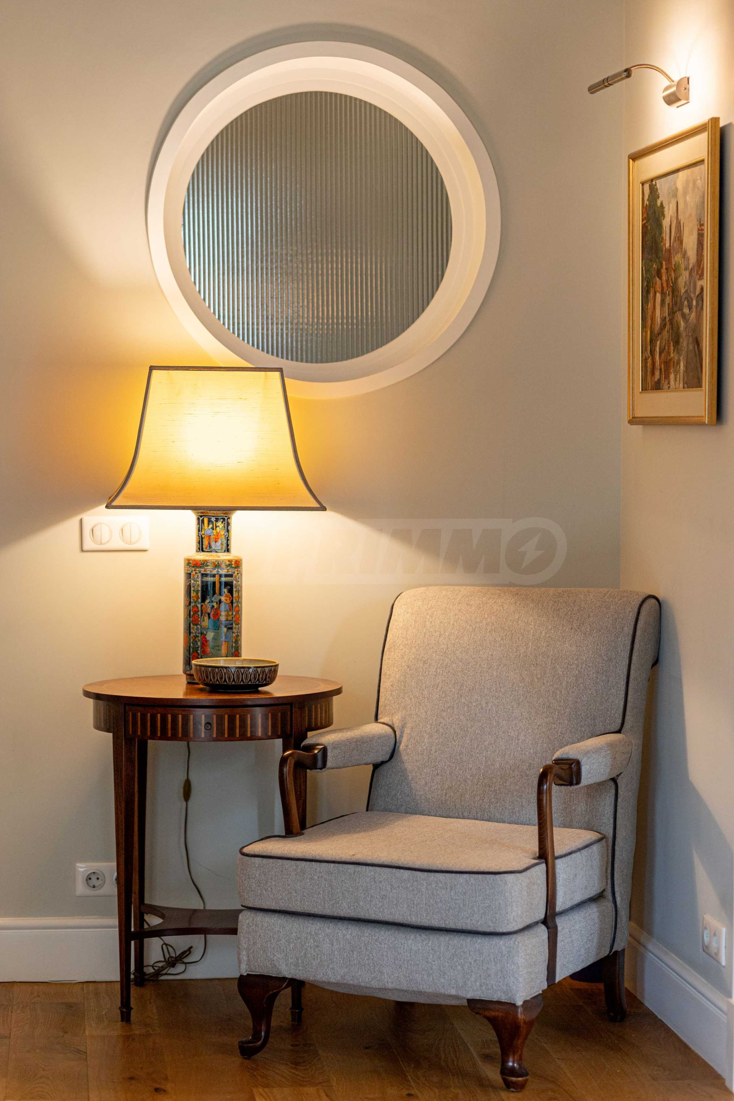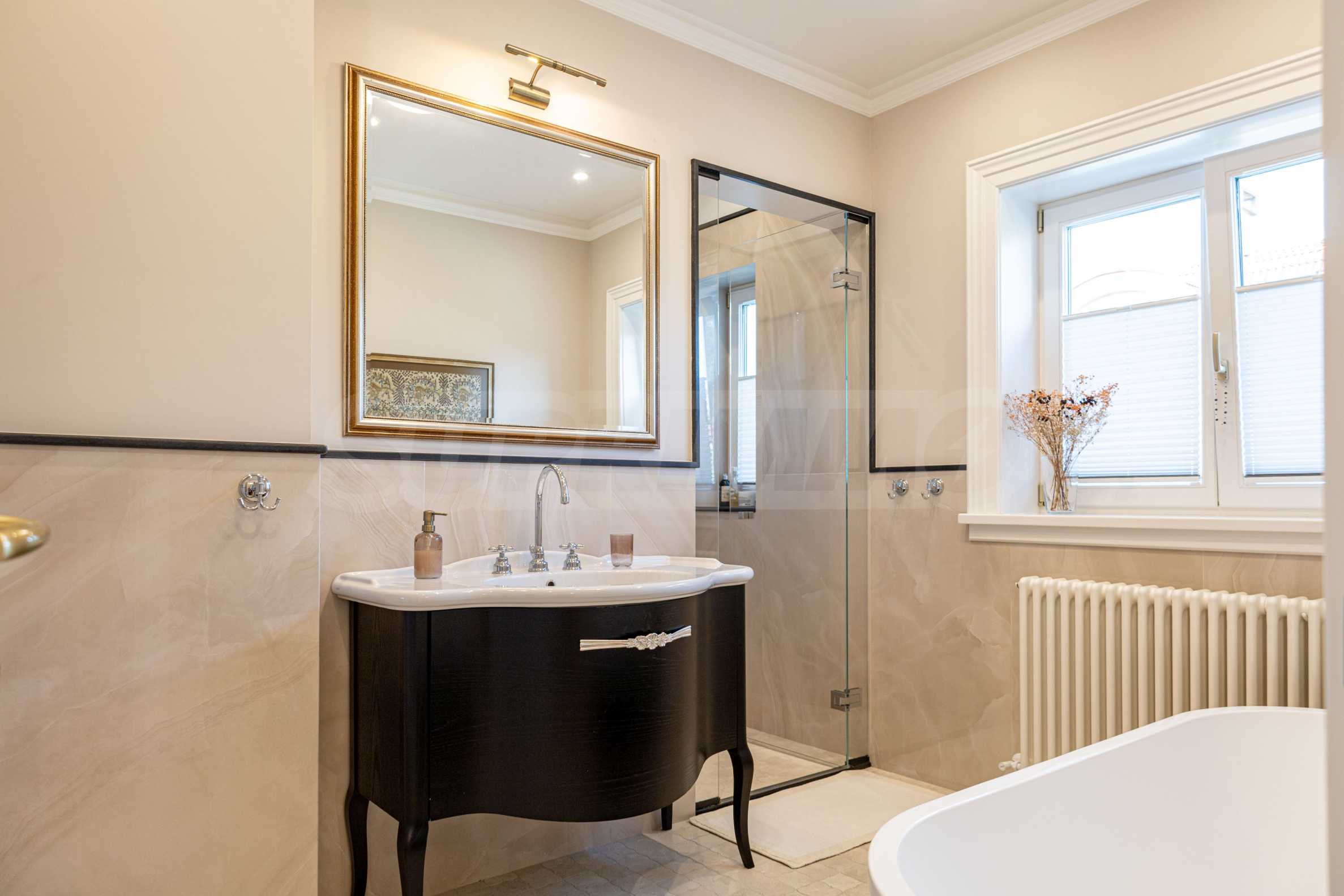 Красивая лестница с отреставрированной мозаикой и перилами ведет на второй этаж, где расположены две спальни с ванной комнатой и туалетом, отдельный туалет, главная спальня с гардеробной и ванной комнатой, а также кабинет с собственной ванной комнатой. Здесь же находится просторная терраса с видом на внутренний двор и гору Витоша.