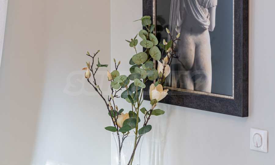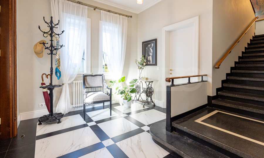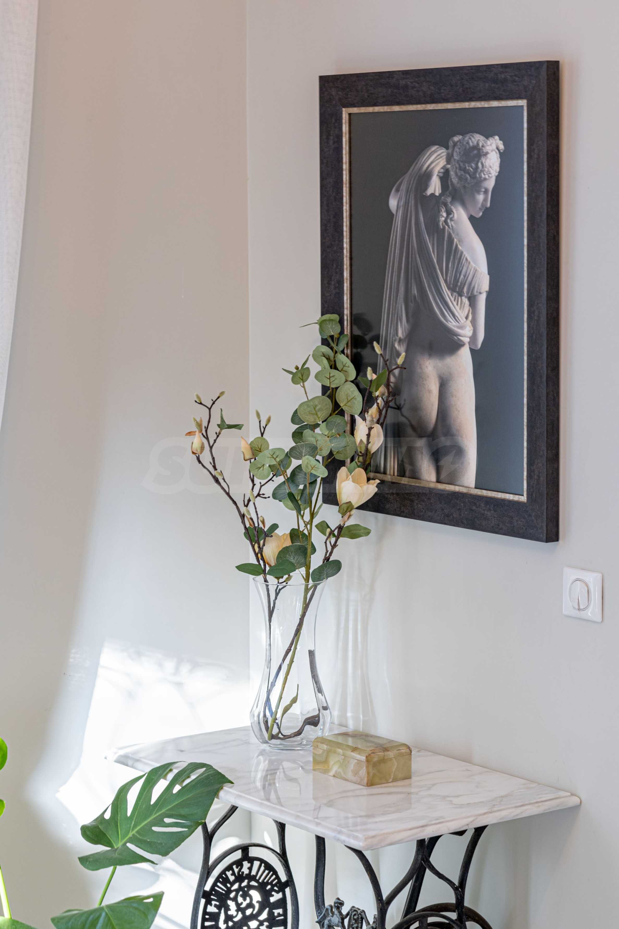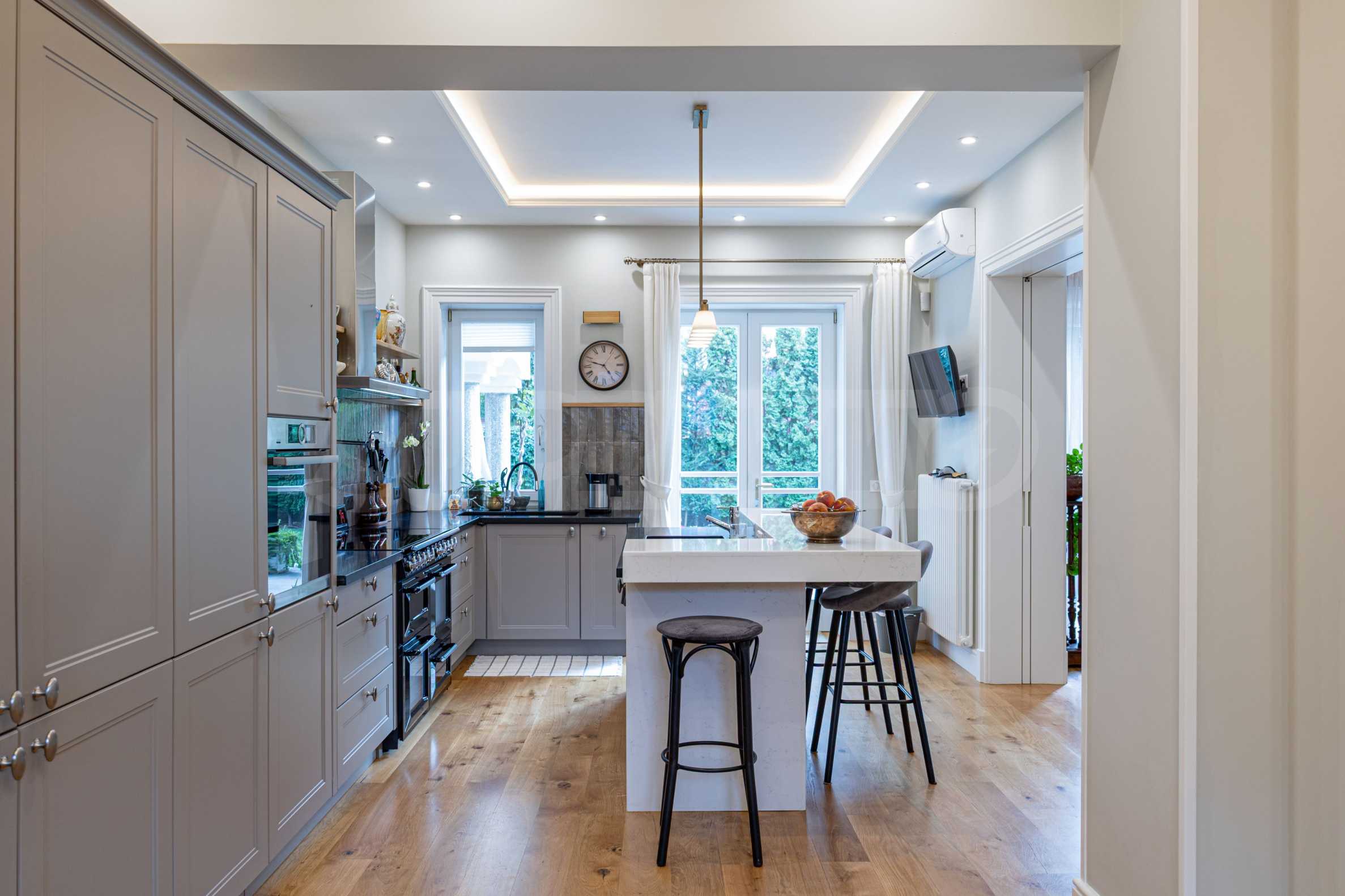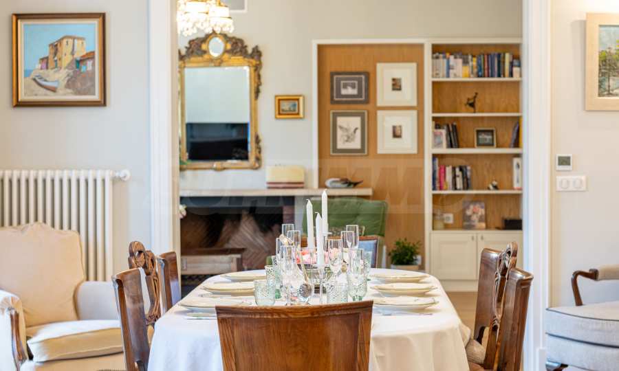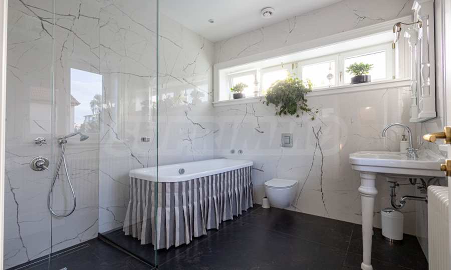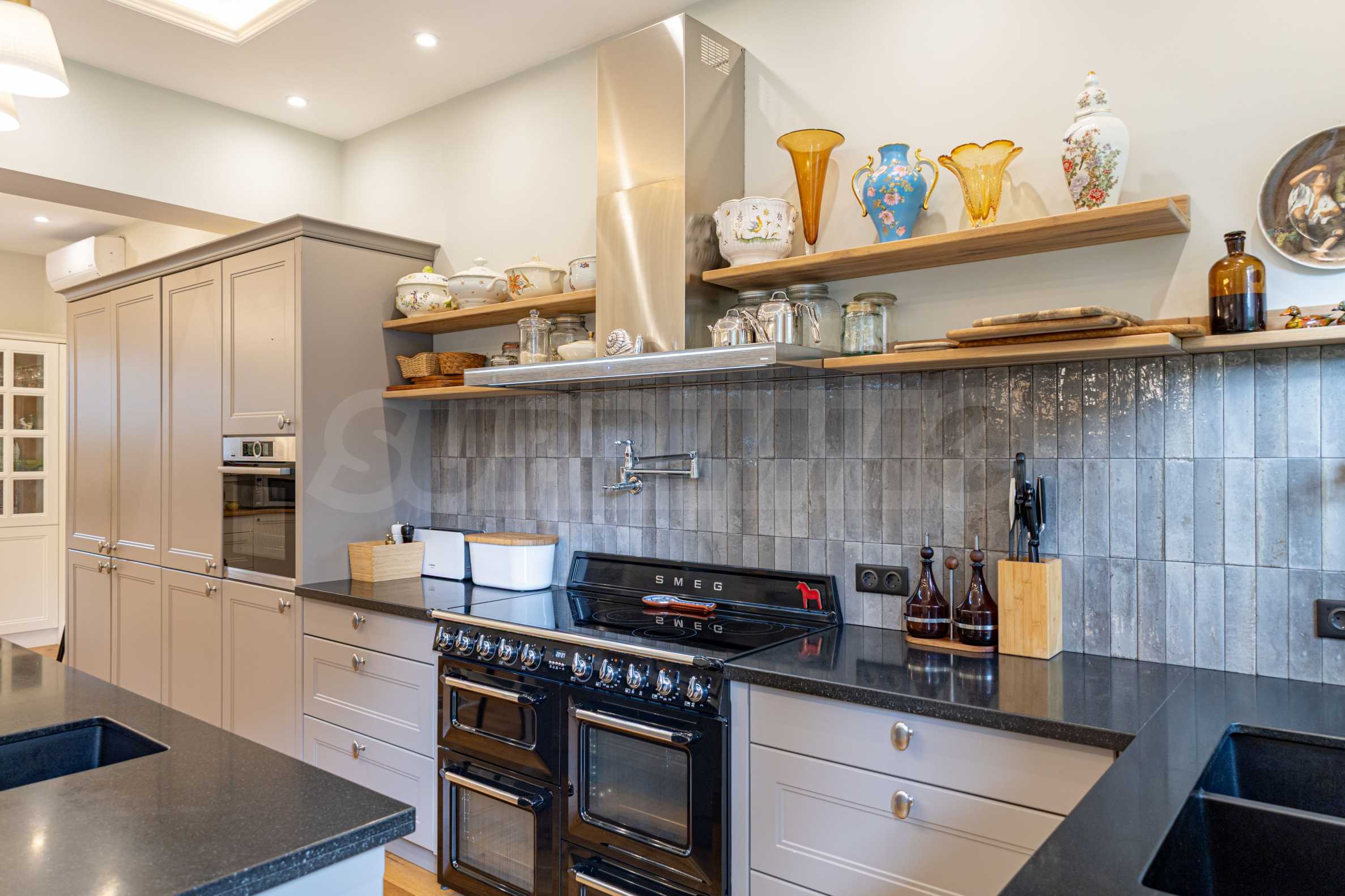 Красивая лестница с отреставрированной мозаикой и перилами ведет на второй этаж, где расположены две спальни с ванной комнатой и туалетом, отдельный туалет, главная спальня с гардеробной и ванной комнатой, а также кабинет с собственной ванной комнатой. Здесь же находится просторная терраса с видом на внутренний двор и гору Витоша.