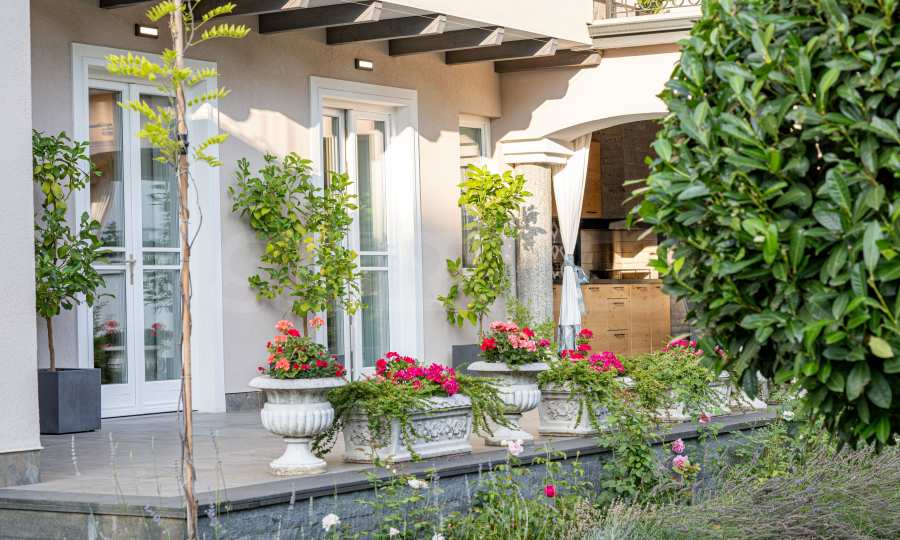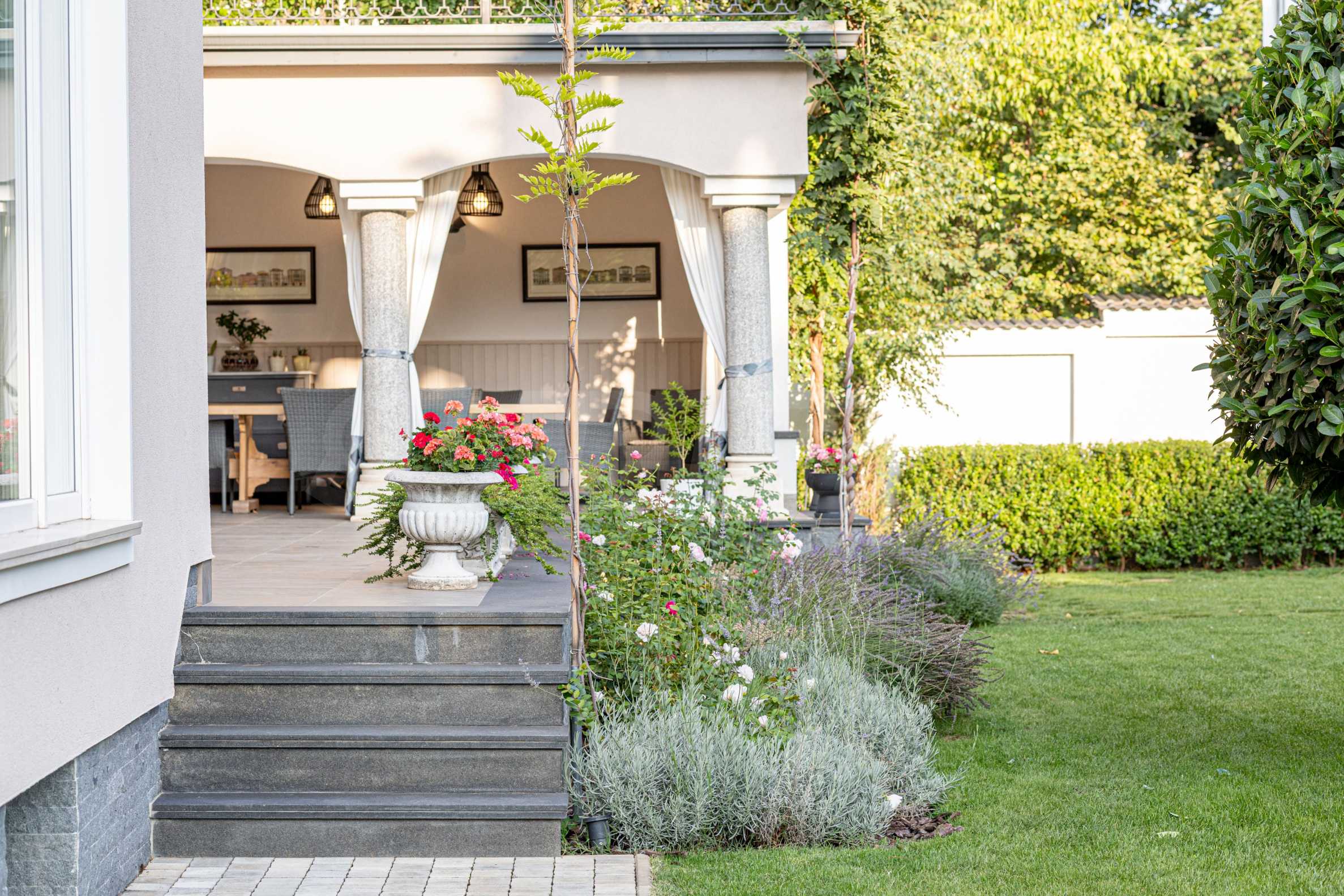 Второй вход, типичный для зданий начала века, ведет в чудесное тенистое место в саду, отведенное под кофейный уголок.