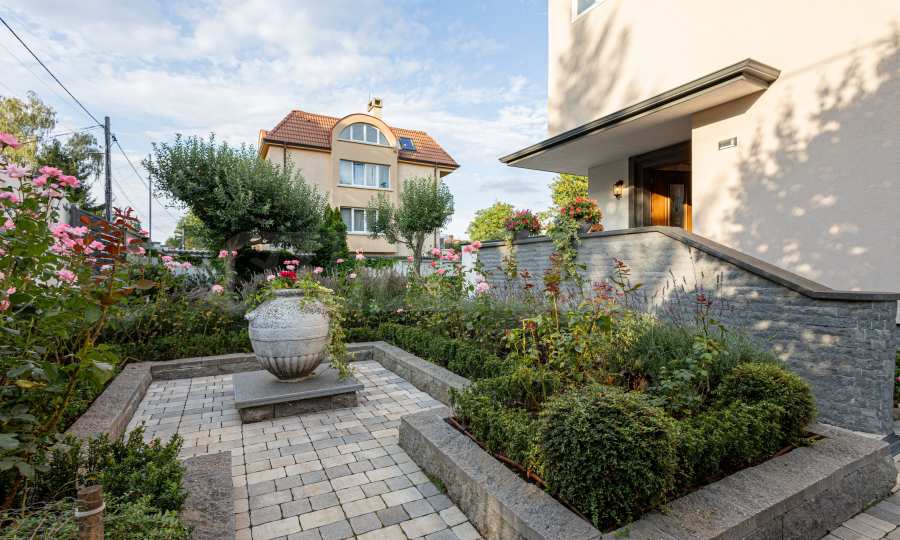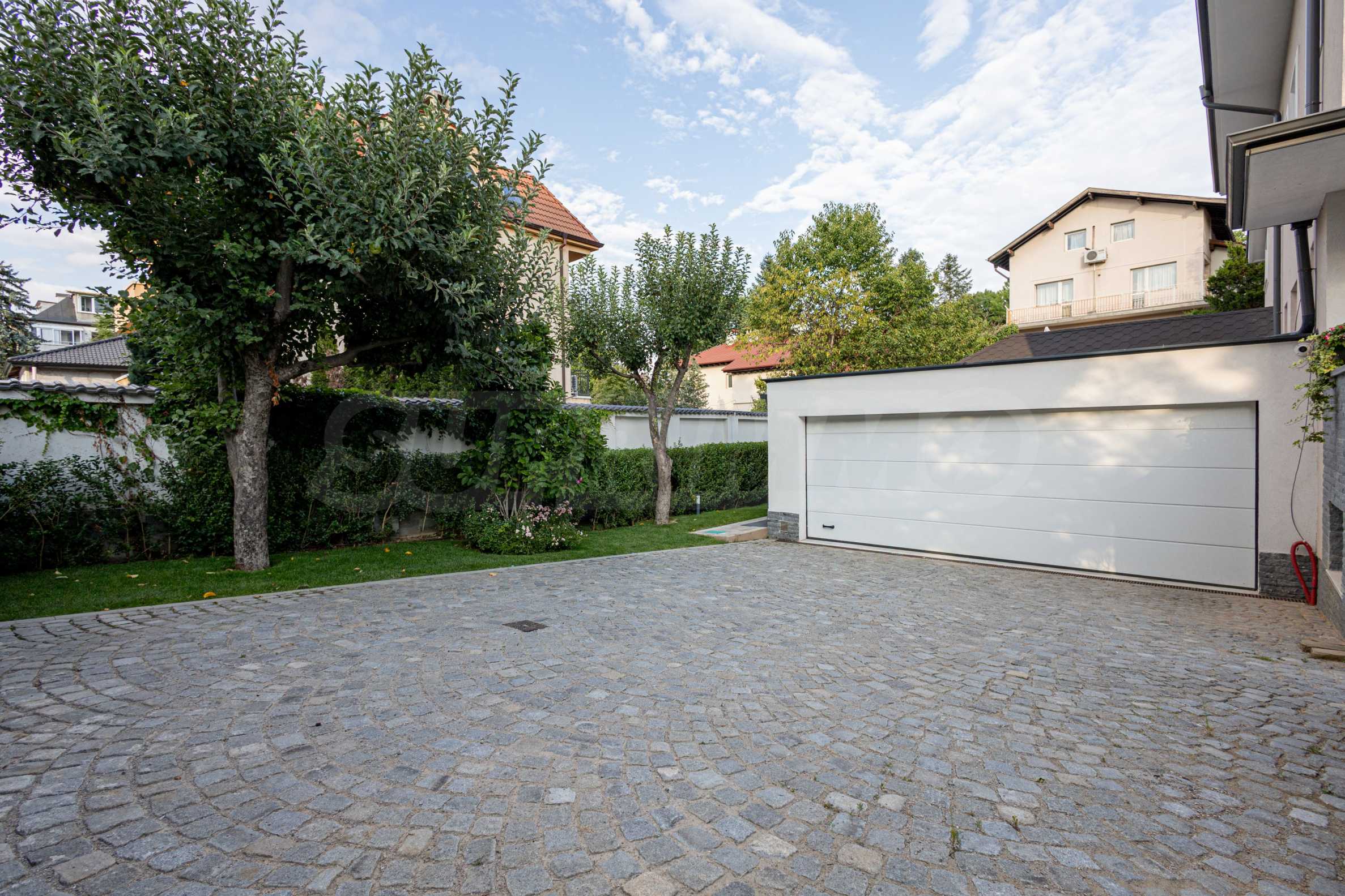 На этом этаже также расположены кабинет, гардеробная, отдельный гостевой туалет и ванная комната с гостевым туалетом. Первый этаж имеет теплое соединение с просторным гаражом на две машины и дополнительной гостевой квартирой с отдельным входом, гостиной с кухней и зимним садом, спальней, ванной комнатой и туалетом.