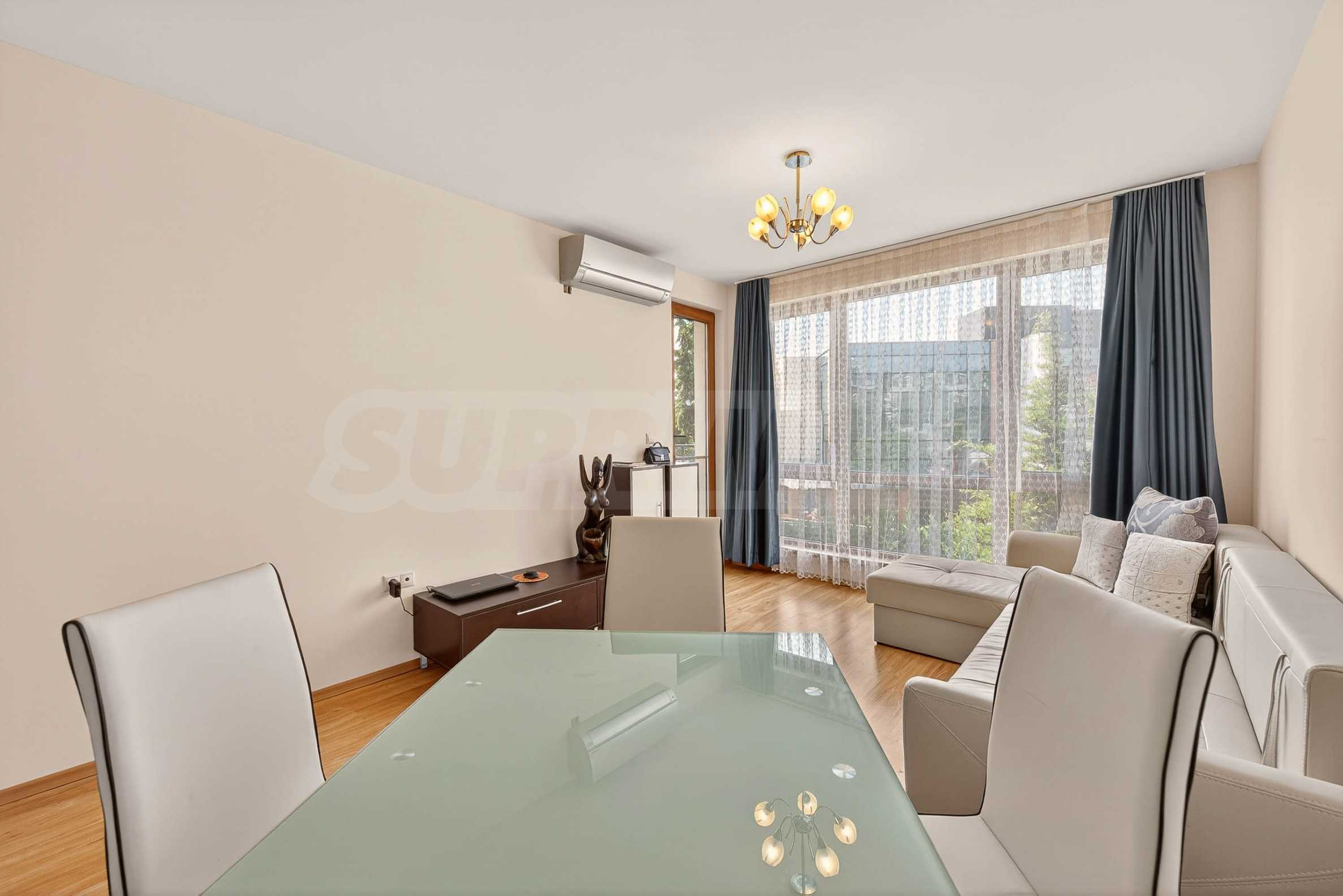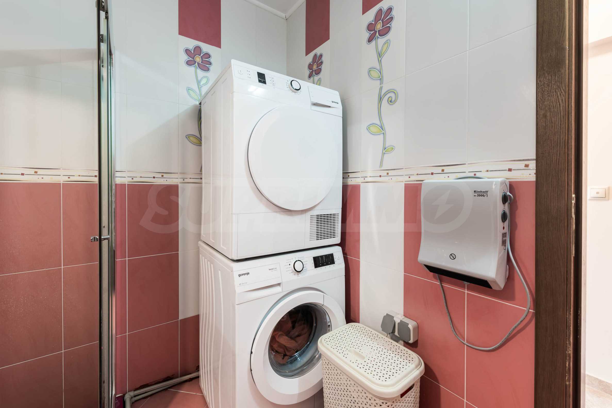 Квартира предлагается полностью меблированной и оборудованной: удобная новая меблировку, плита, холодильник, стиральная машина, сушилка, кондиционеры в обеих комнатах.