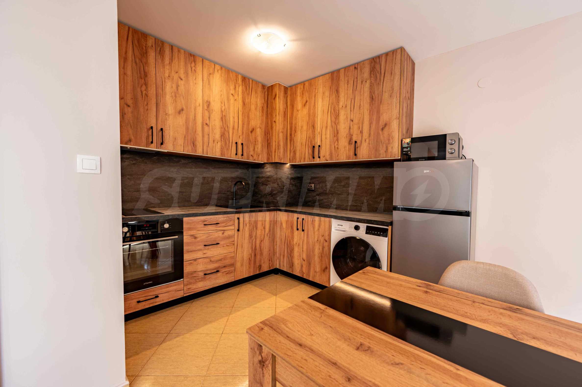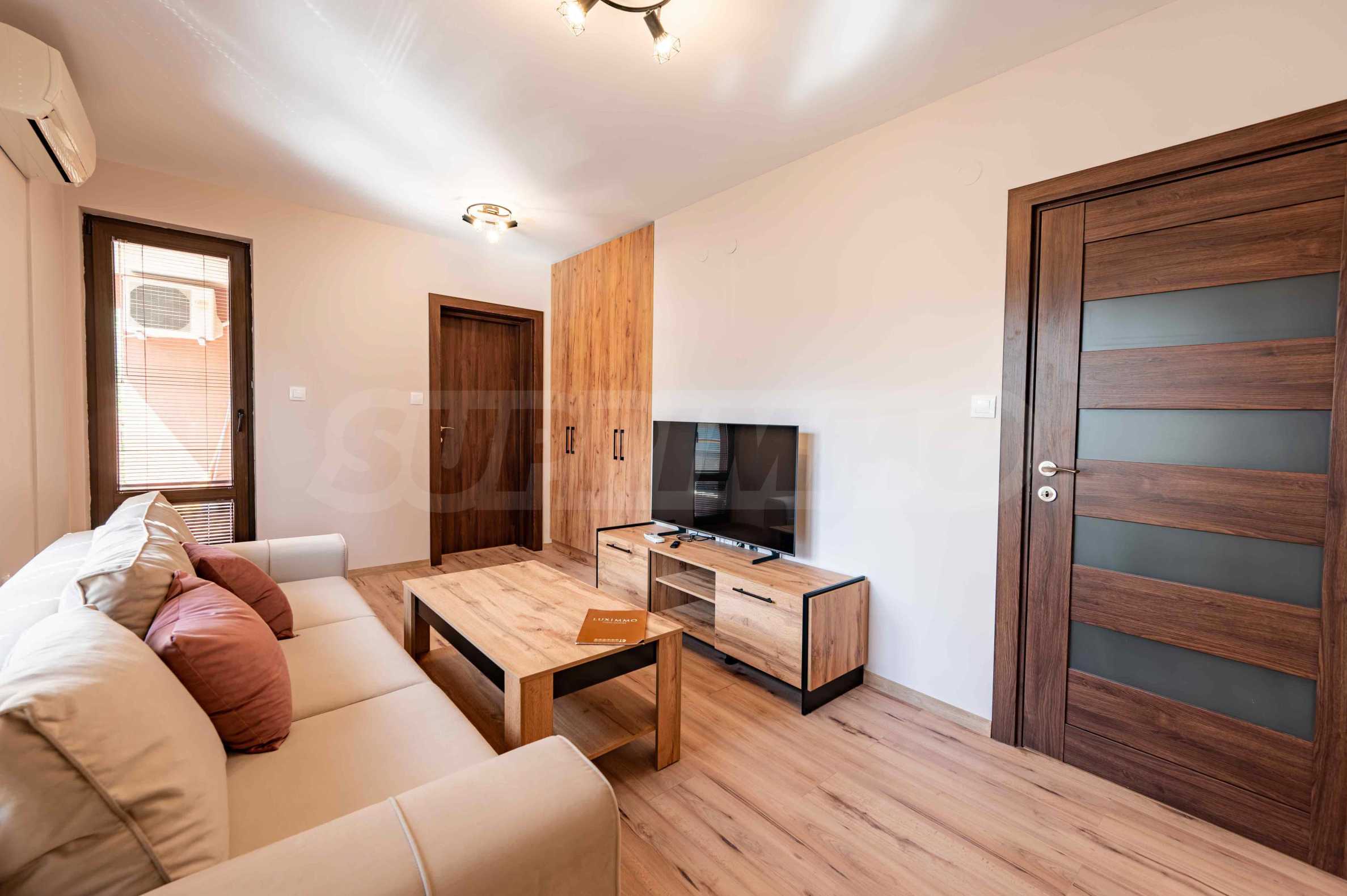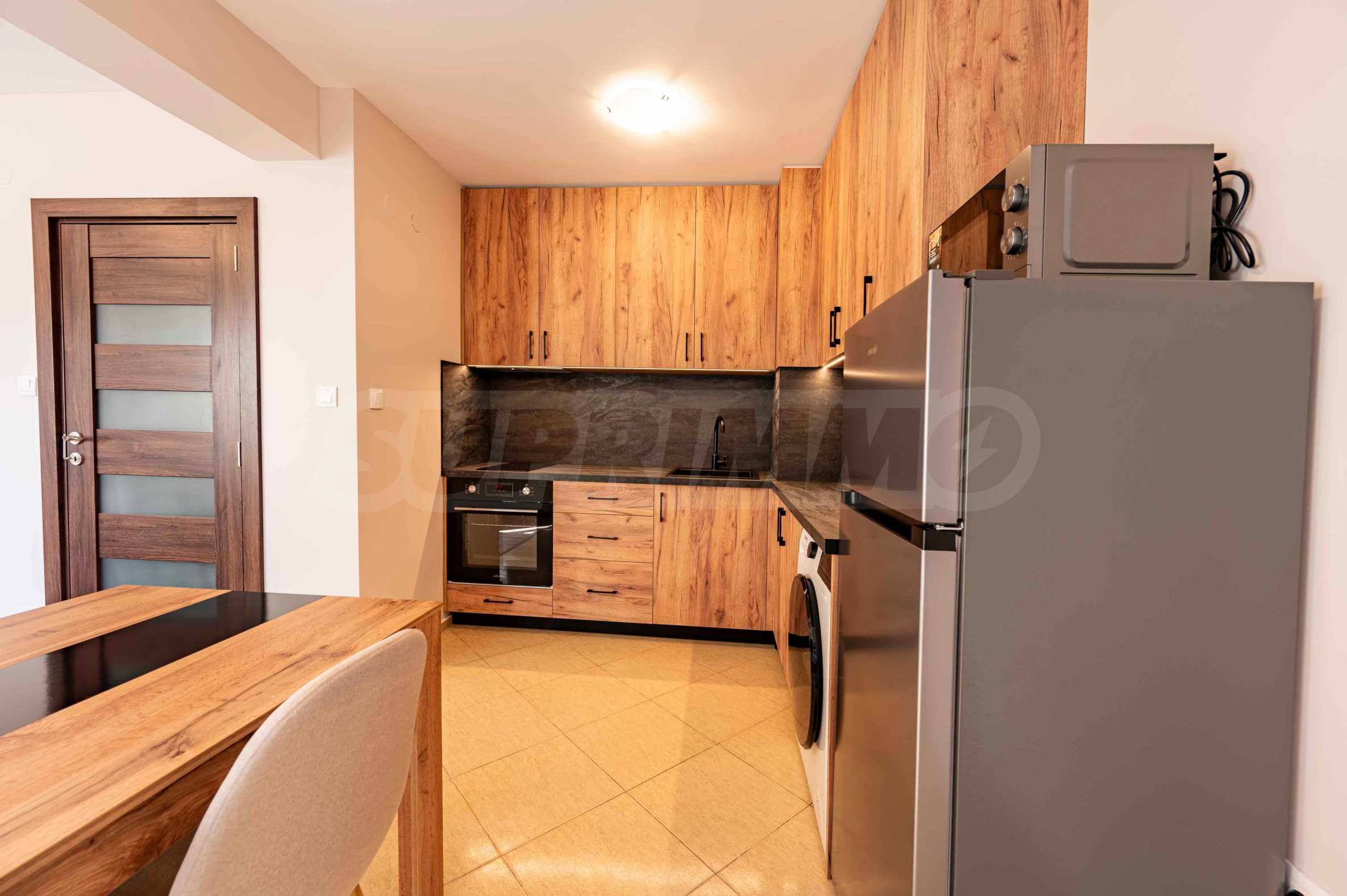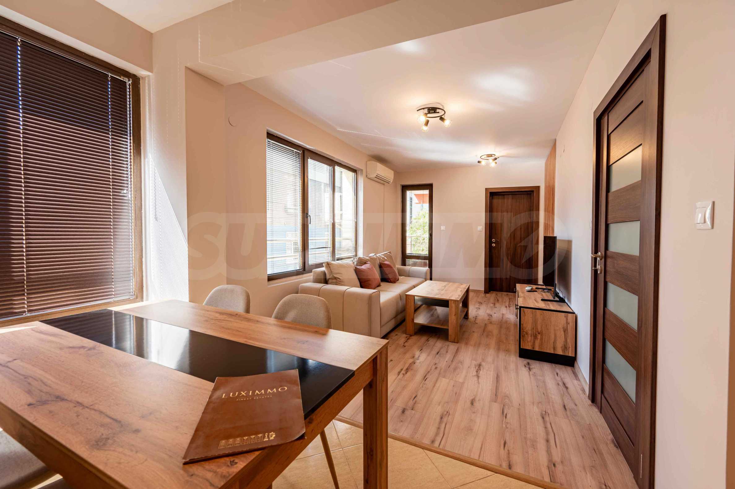 Квартира выходит на южную сторону и отапливается кондиционерами. Функциональная планировка включает гостиную с кухней, спальню, ванную комнату с туалетом, а также террасу, на которую можно выйти как из гостиной, так и из спальни.