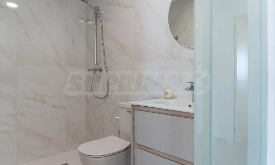 Ванные комнаты стильно отделаны высококачественной сантехникой Ideal Standard или аналогичной марки, дополненной смесителями TRES SERIE CUADRO. Интерьер дополняют дизайнерские шкафы и раковины из гелькоута или аналогичного материала.