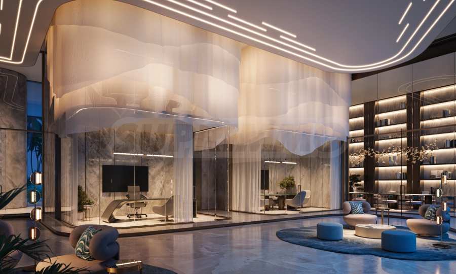 Вестибюль впечатляет двойной высотой потолка и современным дизайном в белом цвете, дополненным дизайнерской меблировкую, зелеными акцентами и светлой палитрой. В центре пространства установлены уникальные 10-метровые часы, разработанные Jacob & Co., которые превращают атриум в настоящий шедевр.