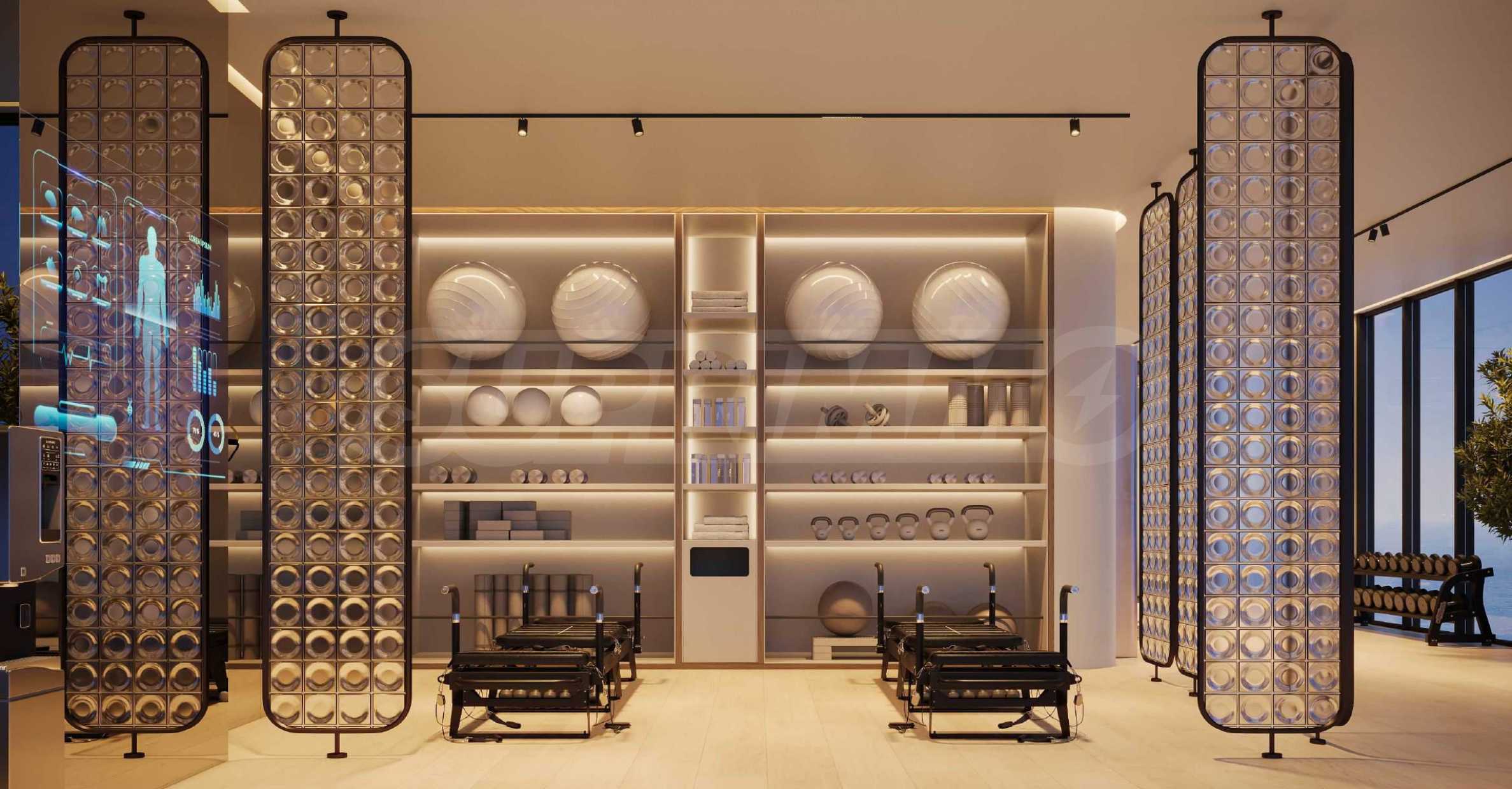 В здании также есть полностью оборудованный тренажерный зал с высококлассным оснащением, а также зоны для пилатеса — популярного метода тренировок, доказавшего свою эффективность среди женщин. Также предусмотрены массажный кабинет и сауна — идеальное завершение настоящего СПА-процедуры, не выходя из дома.