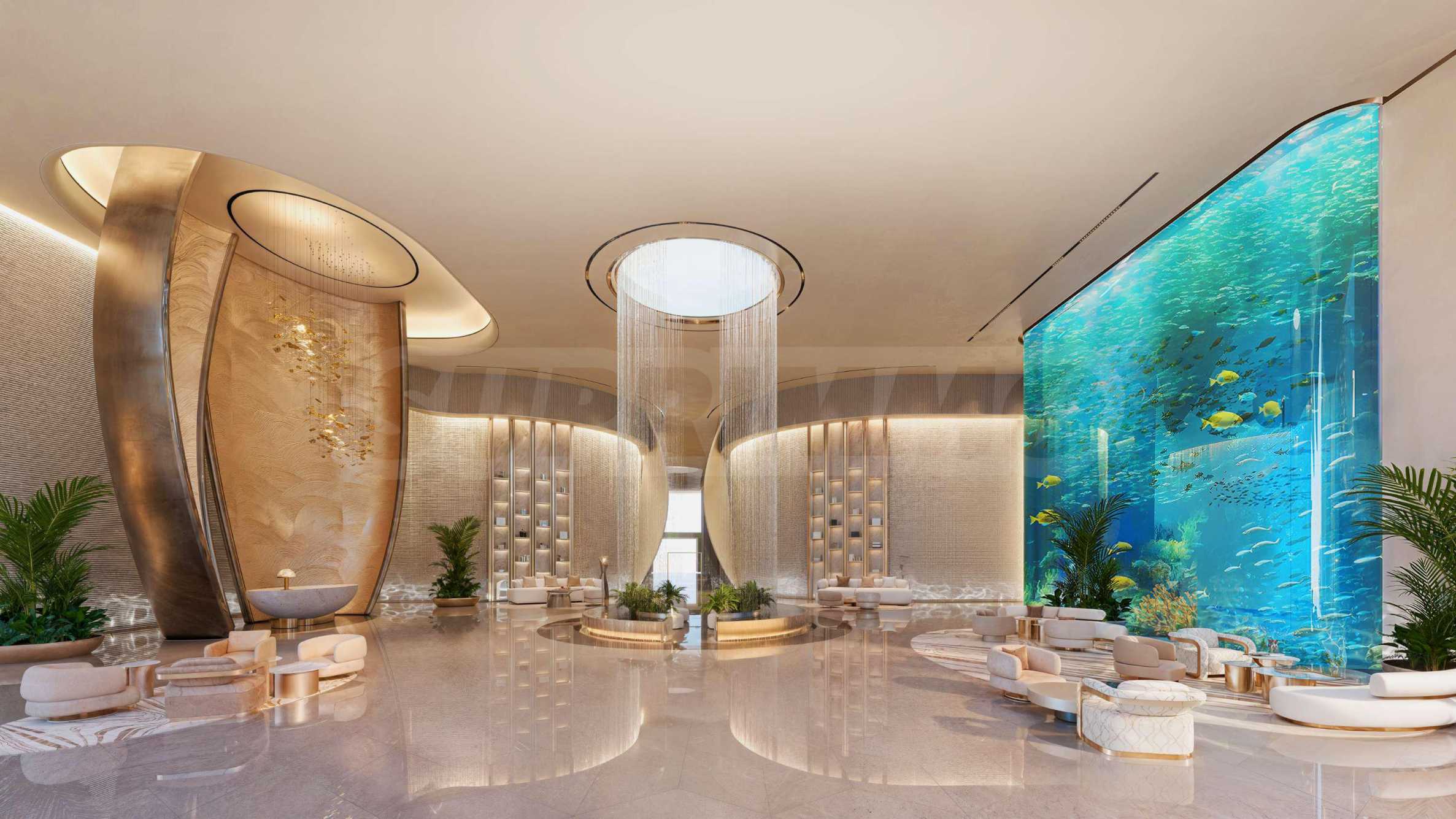 С первого шага в вестибюле Breez by Danube вы почувствуете дух бескомпромиссной роскоши. Простор с потолками двойной высоты создаёт ощущение бесконечности, а водная инсталляция, спускающаяся с потолка к центральному фонтану, дарит умиротворение и гармонию, вдохновлённые морем. Стойка регистрации подобна произведению скульптурного искусства, освещение напоминает современные арт-инсталляции, а зоны отдыха располагают к короткому перерыву или встрече с друзьями. Несомненной изюминкой является впечатляющий аквариум площадью 140 кв. м и высотой почти 6 метров – настоящая живая картина, придающая пространству неповторимый характер.