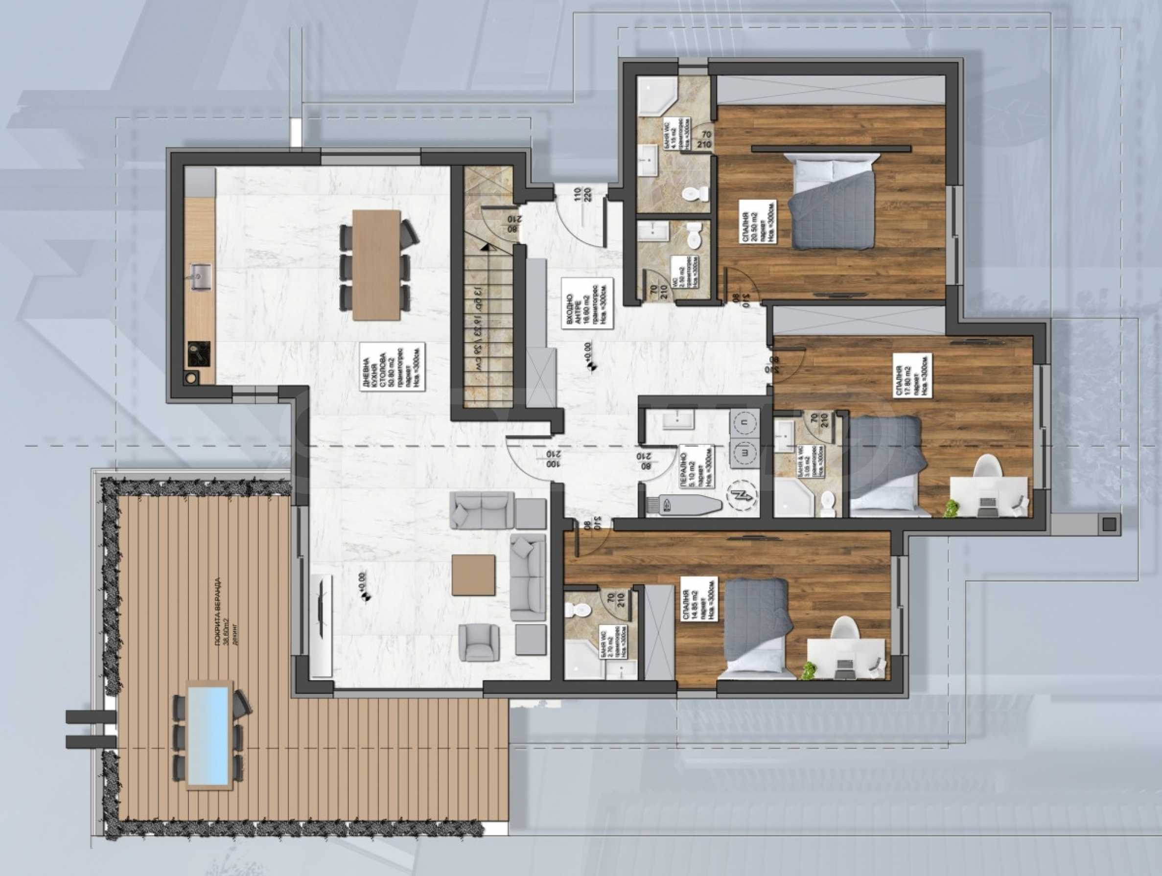 • первый этаж - прихожая с высокими потолками, коридор, просторная гостиная с кухней и столовой, три спальни, три ванные комнаты с туалетом, прачечная и веранда.
