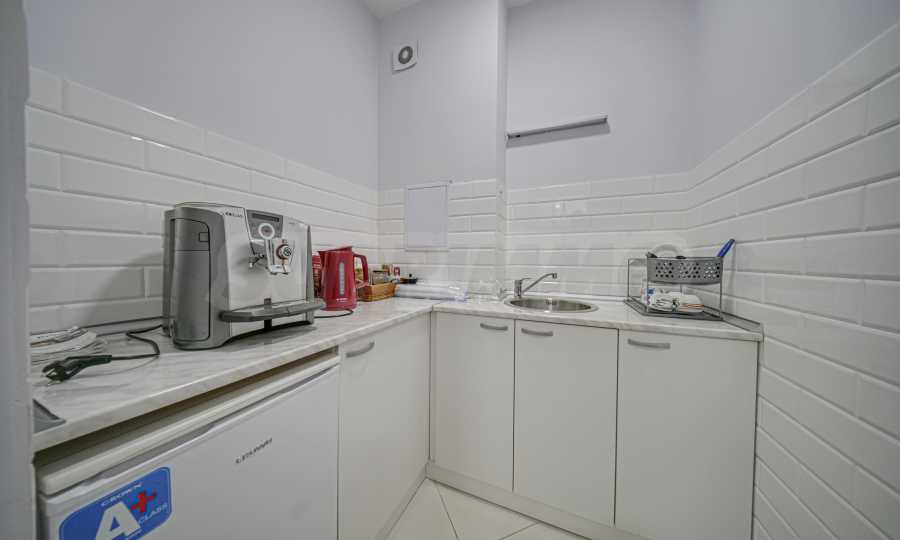 Офис площадью 139,04 кв. м расположен на первом этаже. Окна выходят на юго-запад, из них открывается панорамный вид на улицу Профессора Кирилла Попова. Помещение предлагается с роскошной отделкой из качественных материалов: