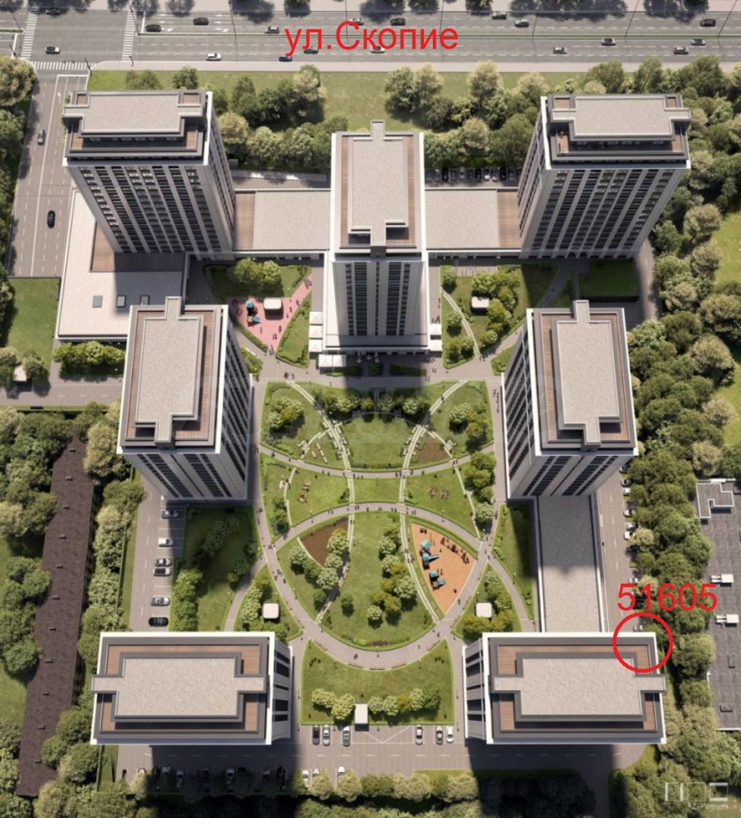 Просторная парковая зона с прогулочными дорожками, спортивными и игровыми площадками;