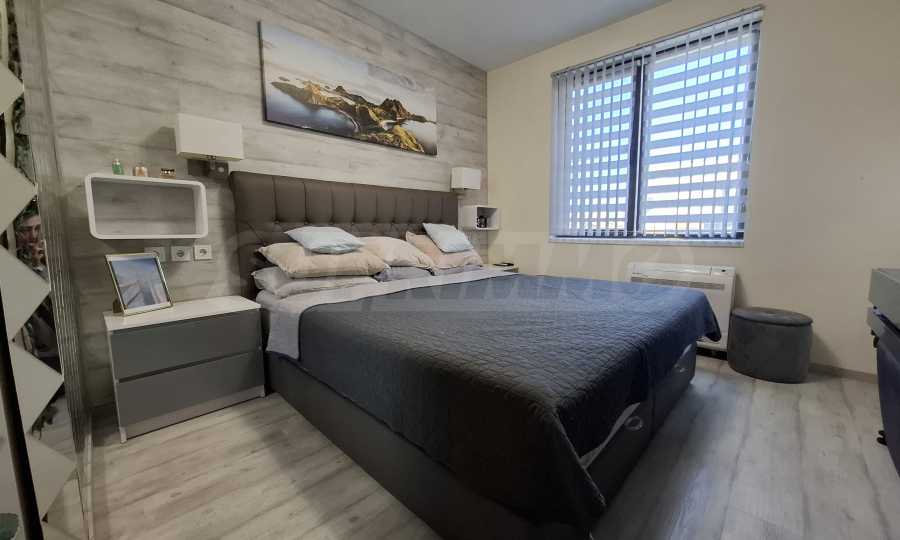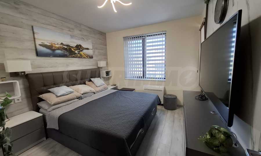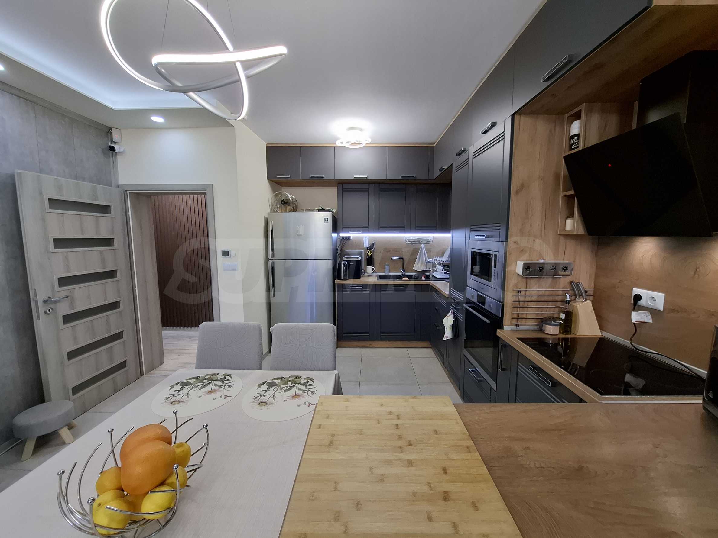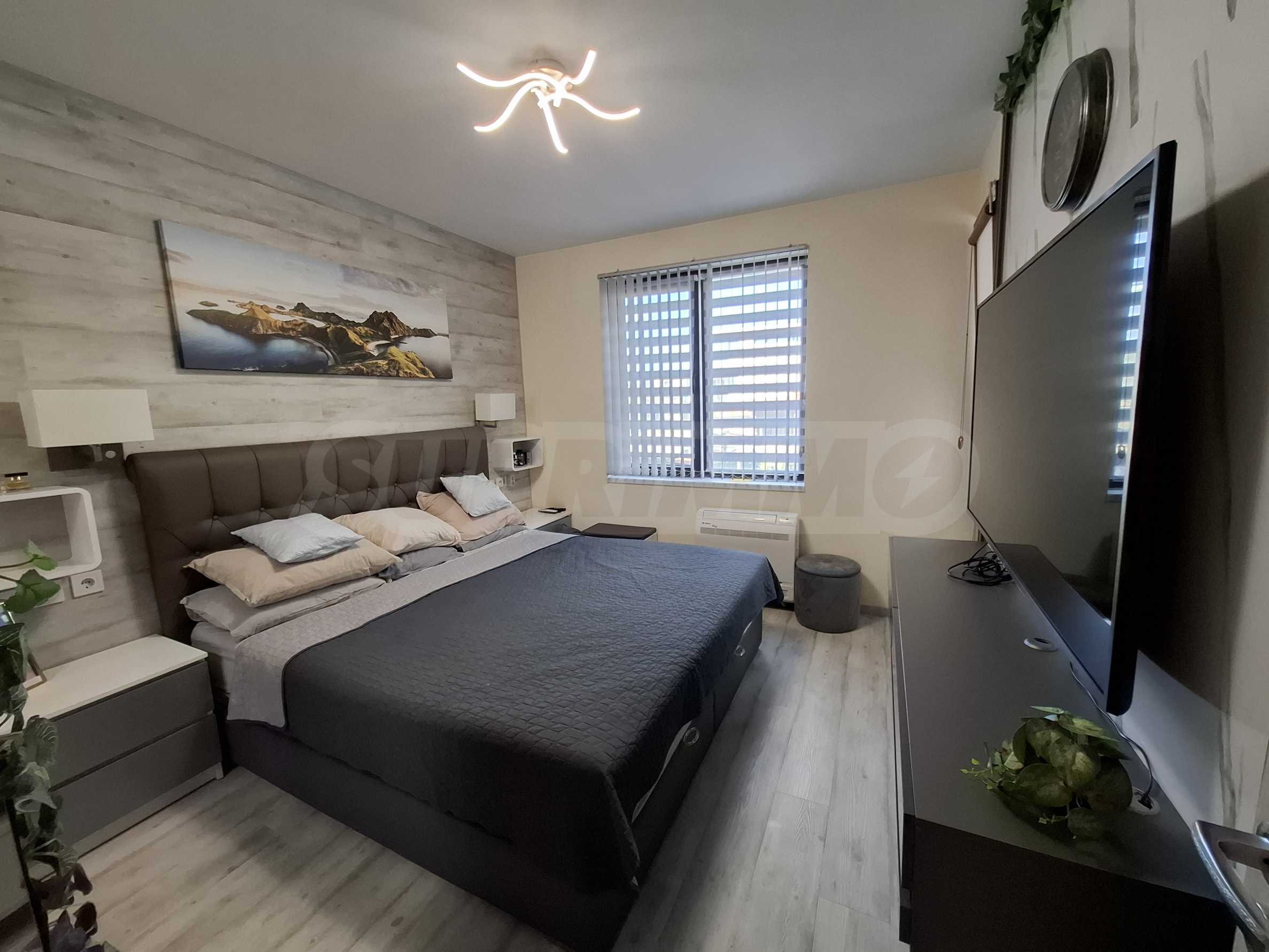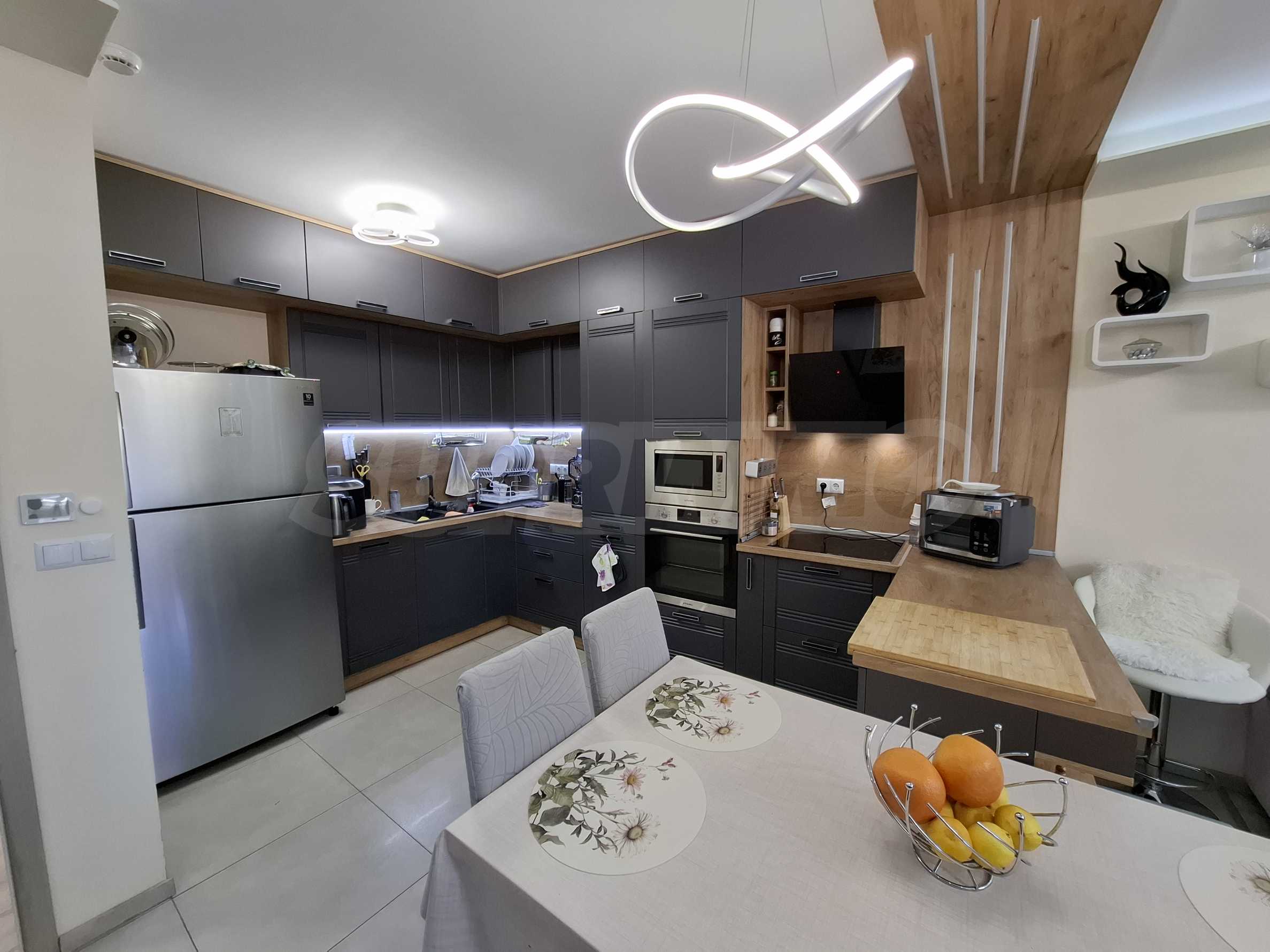 Квартира имеет современный интерьер, полностью меблирована и оборудована высококачественной электротехникой - стиральная машина, встроенная духовка и варочная панель, холодильник, два кондиционера, два телевизора, микроволновая печь и т. д. Также установлена современная система охранной сигнализации.