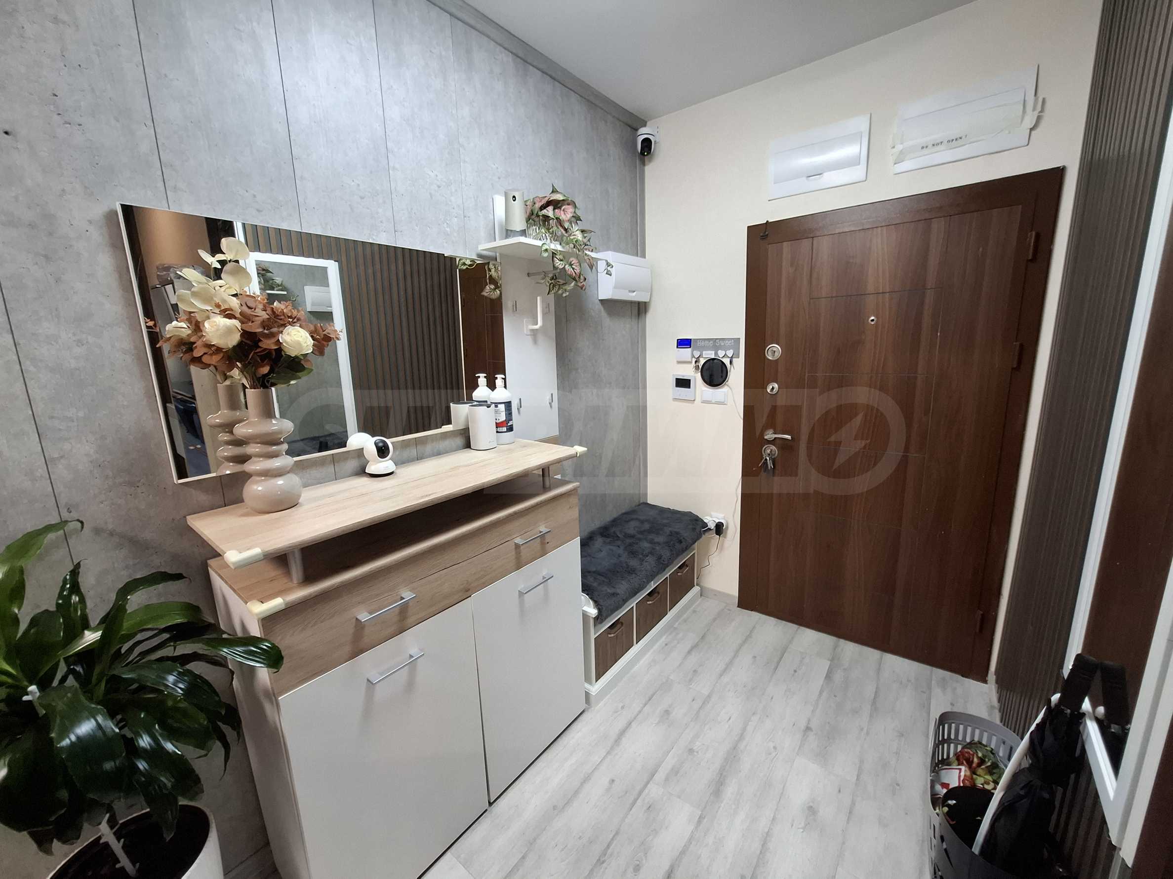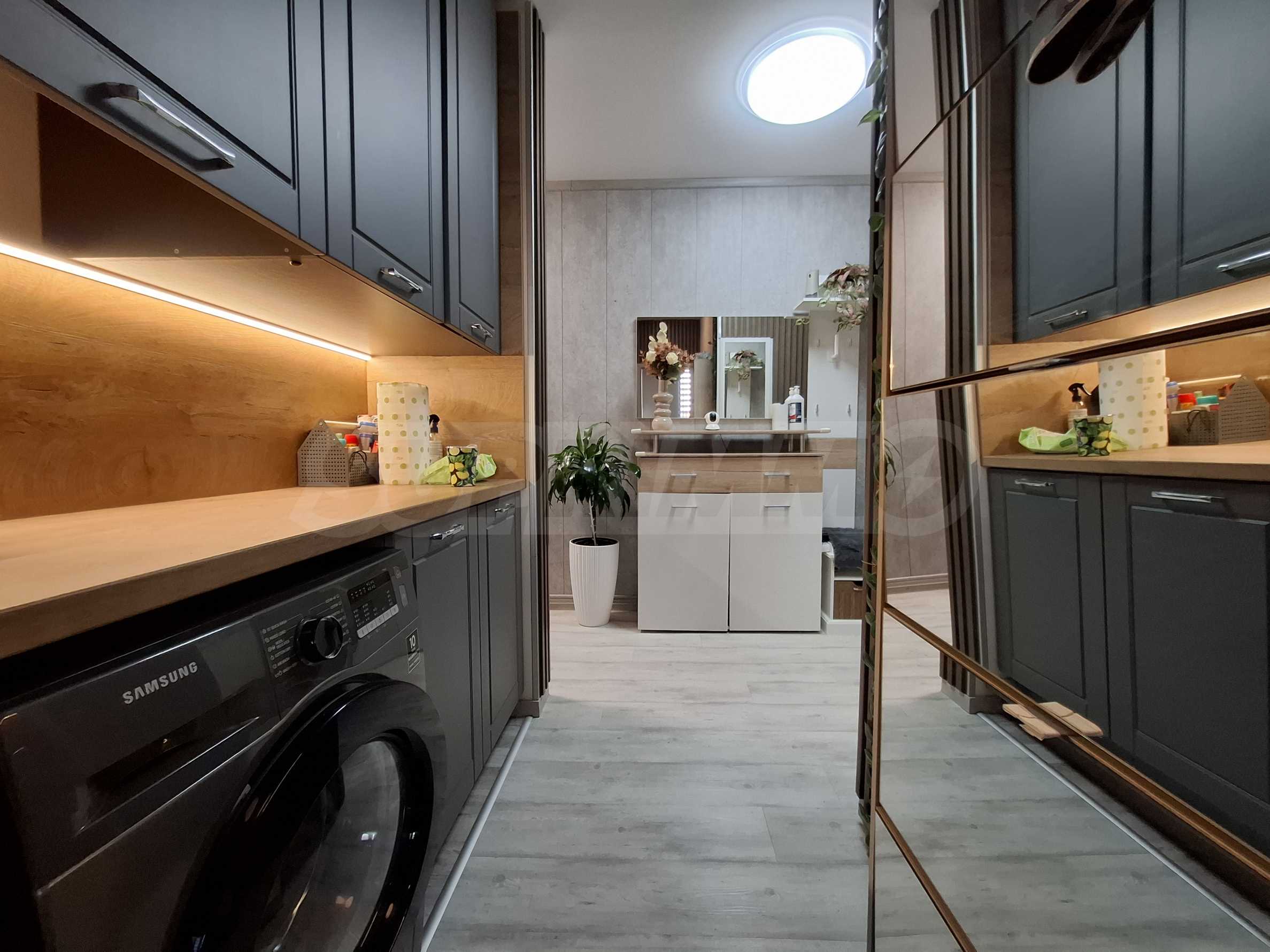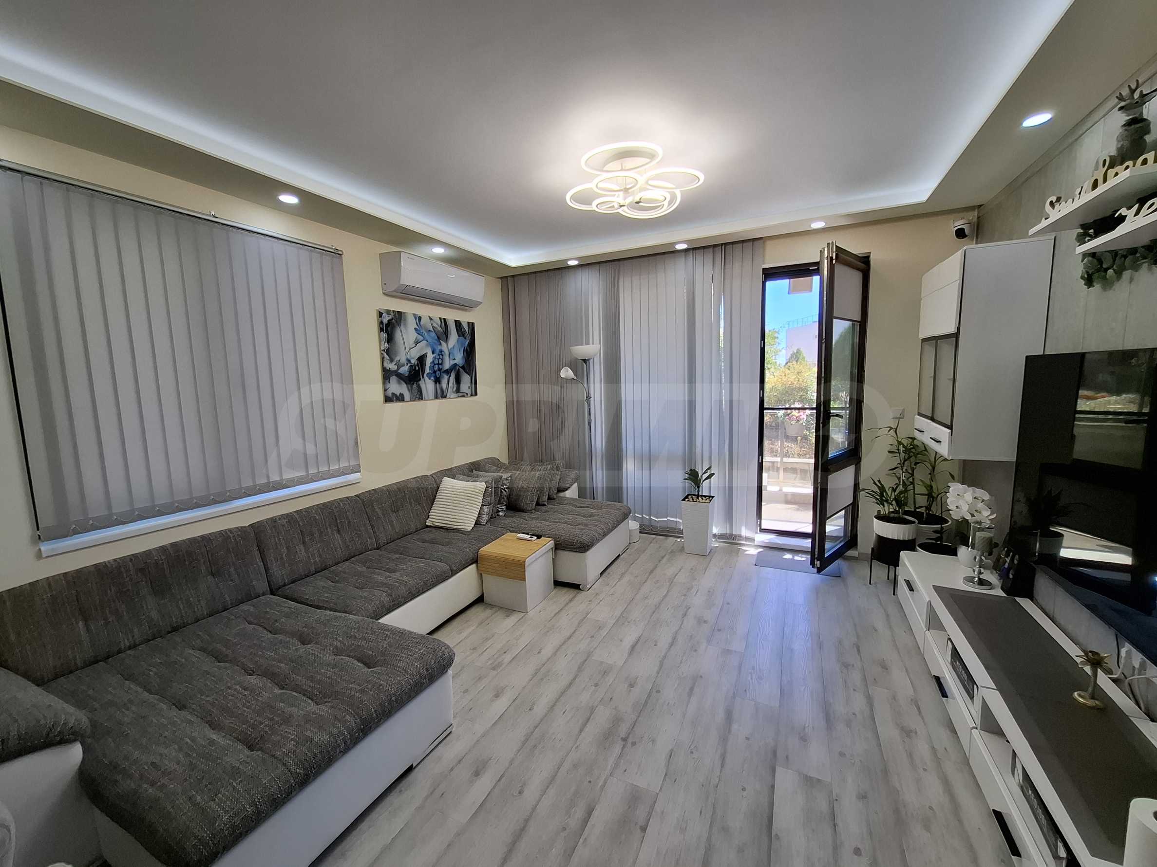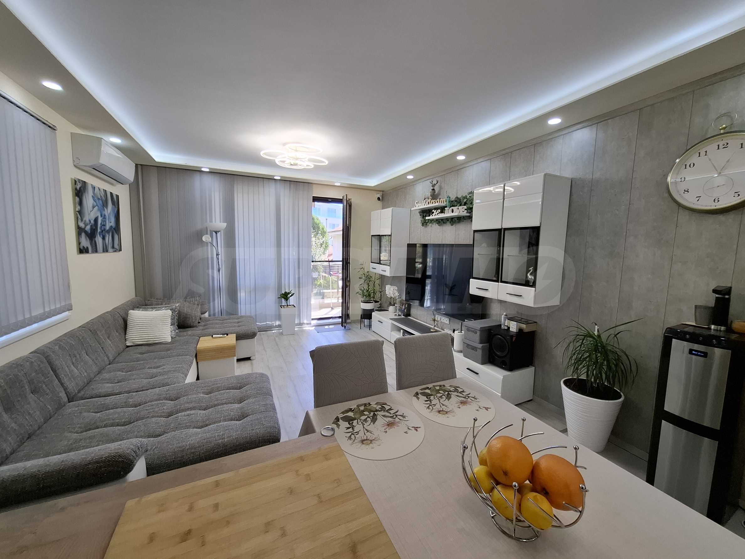 Квартира имеет современный интерьер, полностью меблирована и оборудована высококачественной электротехникой - стиральная машина, встроенная духовка и варочная панель, холодильник, два кондиционера, два телевизора, микроволновая печь и т. д. Также установлена современная система охранной сигнализации.