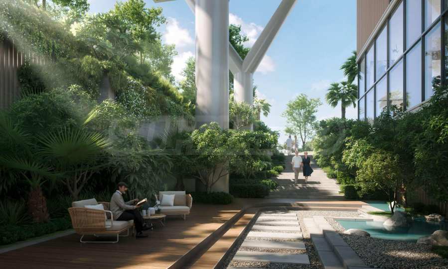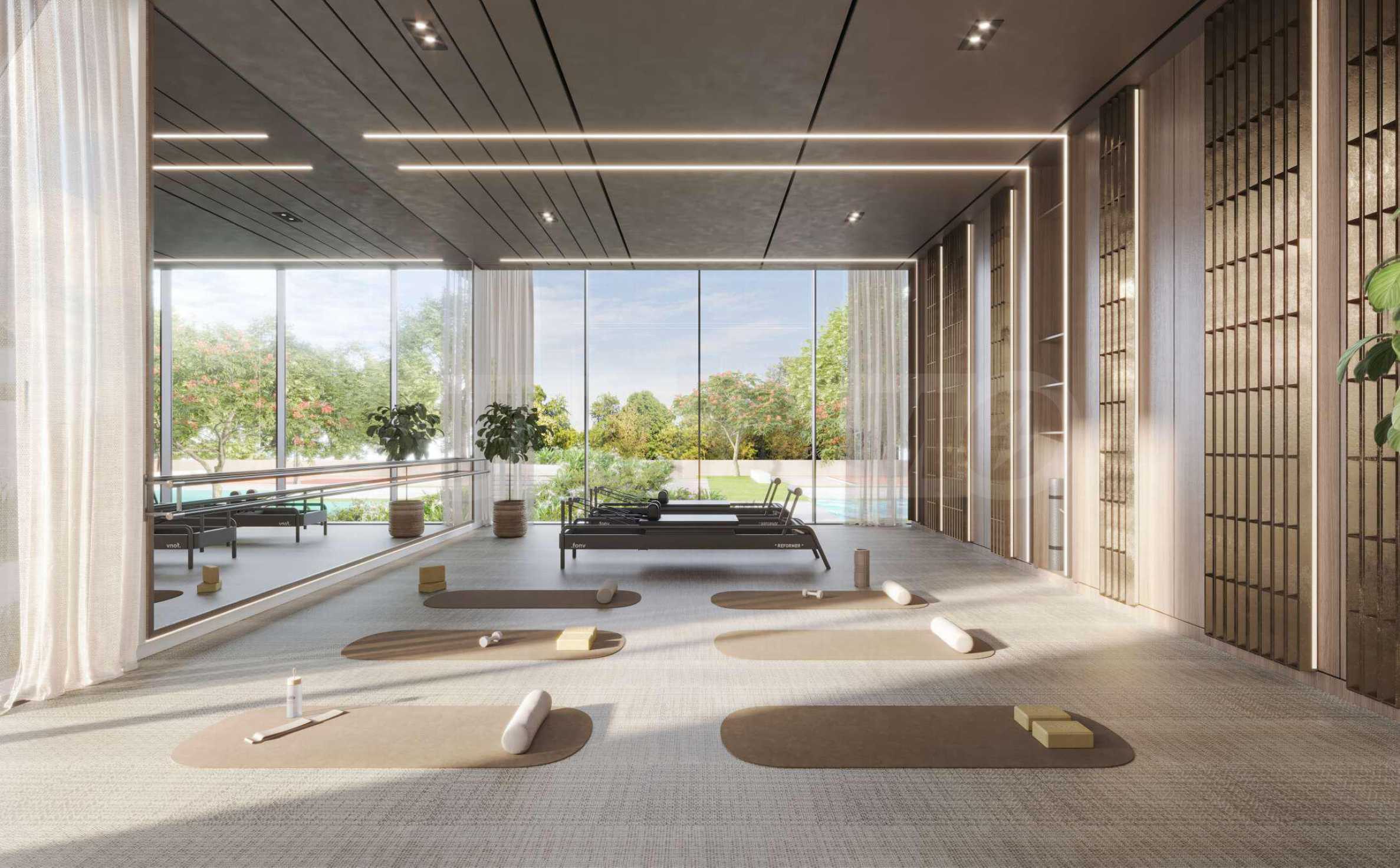 На террасе на крыше подиума расположен изысканный бассейн, окруженный зонами отдыха и пышной зеленью — оазис, напоминающий уединенный рай. Для тех, кто ценит активный образ жизни, предусмотрены современный тренажерный зал и специальная студия йоги, подходящие как для индивидуальных занятий, так и для групповых тренировок.