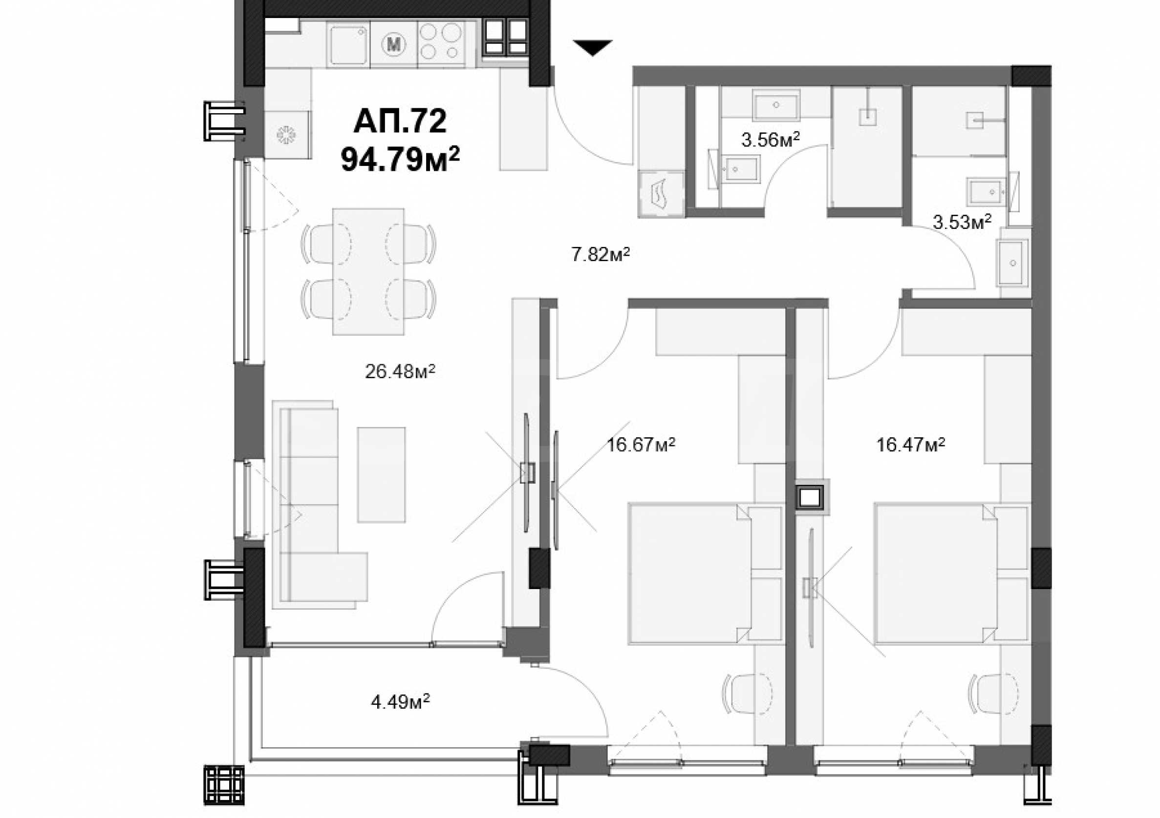 • планировка: прихожая, две ванные комнаты с туалетами, просторная гостиная с кухней и столовой, две спальни, терраса.
