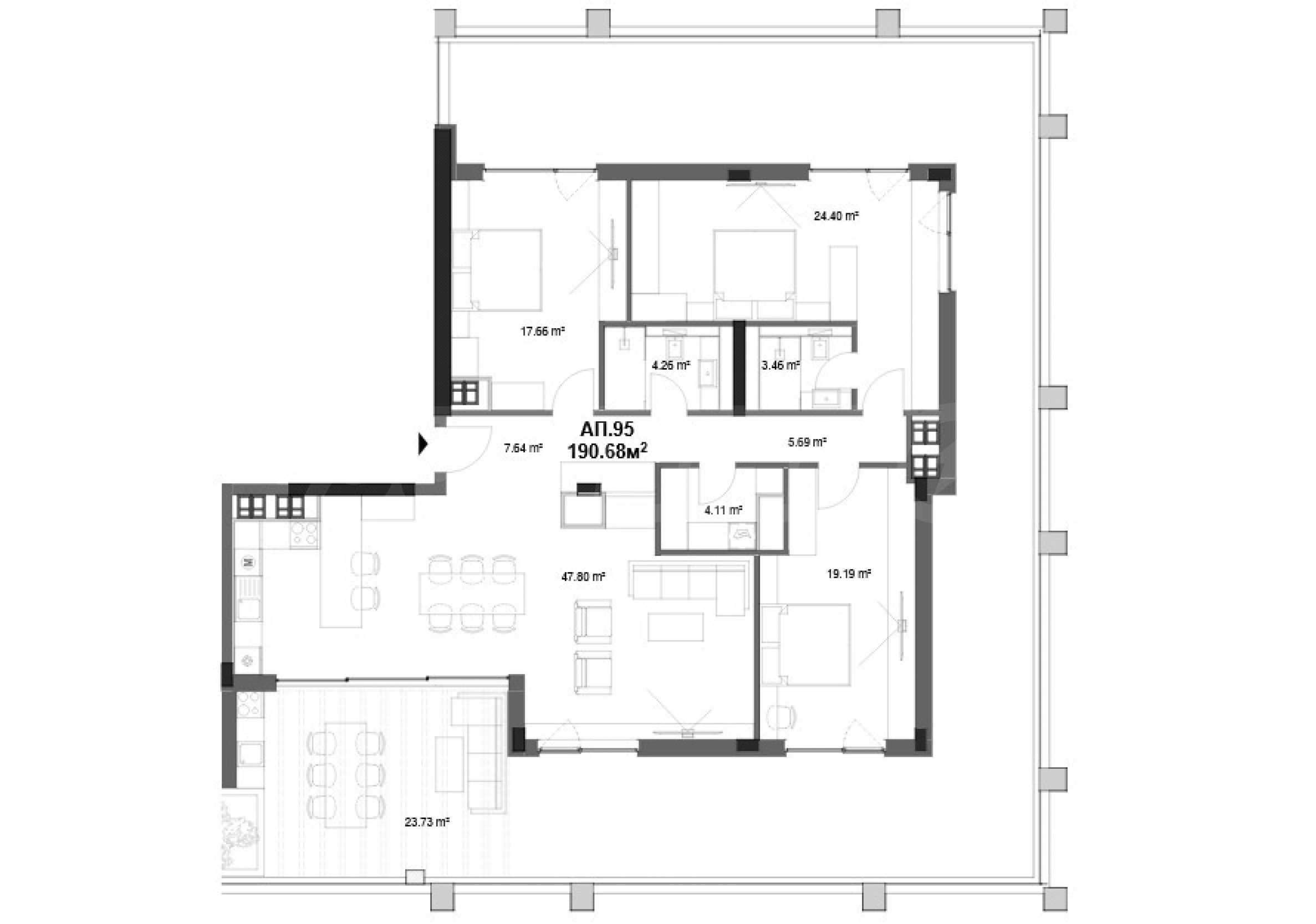 • планировка: прихожая, большая кладовая, две ванные комнаты с туалетами, просторная гостиная с кухней и столовой площадью 47,80 кв. м, три просторные спальни, большая панорамная терраса с выходом из всех комнат.