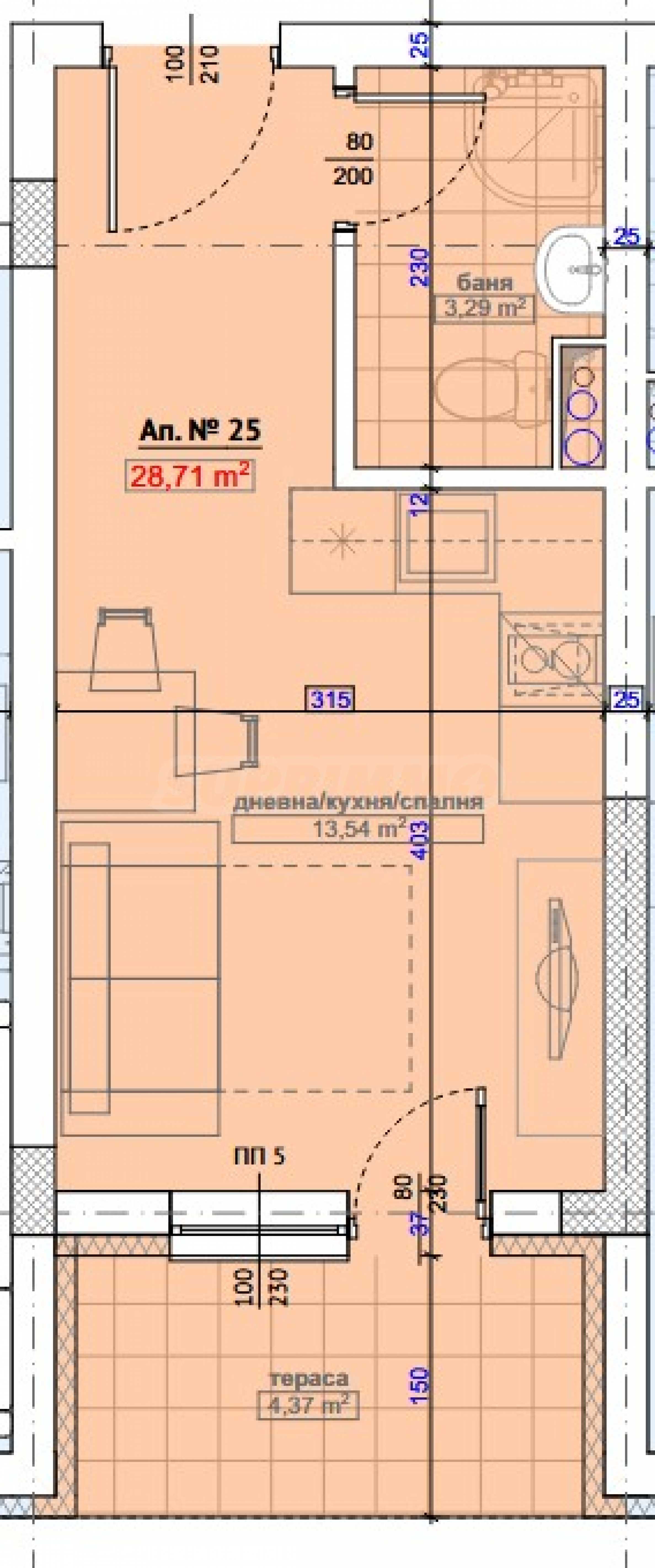 Квартира общей площадью 35,95 кв. м расположена на 5 этаже и имеет следующую планировку: прихожая, гостиная с кухней, спальная зона, ванная комната с туалетом, терраса.