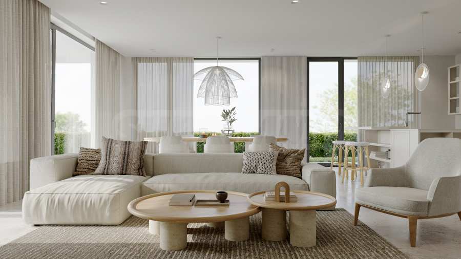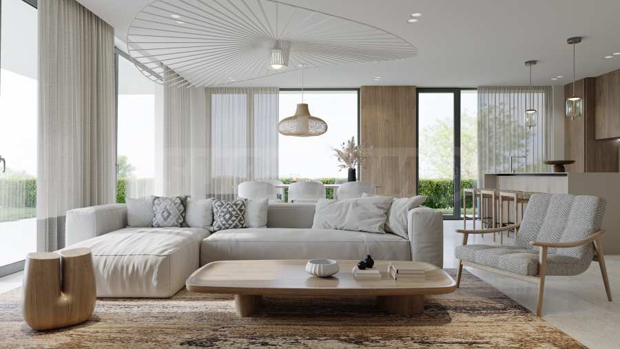 На третьей линии от пляжа будут расположены 4 трехэтажных здания с террасами, в которых разместятся просторные трех- и четырехкомнатные апартаменты, всего в 100 метрах по прямой от моря. Апартаменты предлагаются с оштукатуренными стенами и стяжкой, с возможностью меблировки.