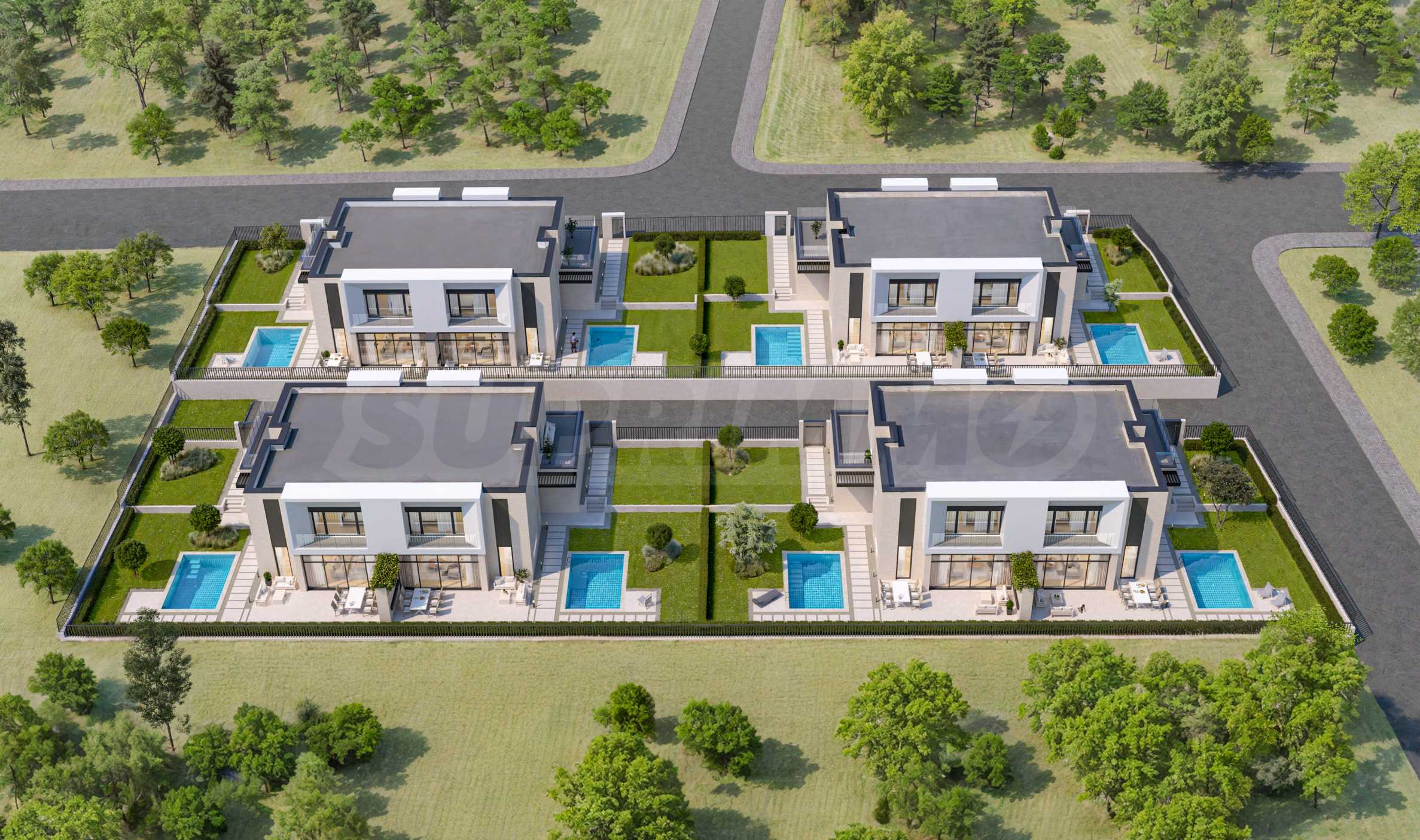 Комплекс включает в себя четыре многоквартирных жилых здания на двух надземных уровнях с плоской крышей. Каждое здание разделено на два дома с отдельным входом, который обеспечивается тремя ступенями, повторяющими рельеф местности. Проект также предусматривает гаражи на две машины, а жилые помещения спроектированы с максимальным вниманием к деталям. Каждый дом имеет отдельный участок с застроенной площадью 254 кв. м и панорамным видом на Софийское поле.