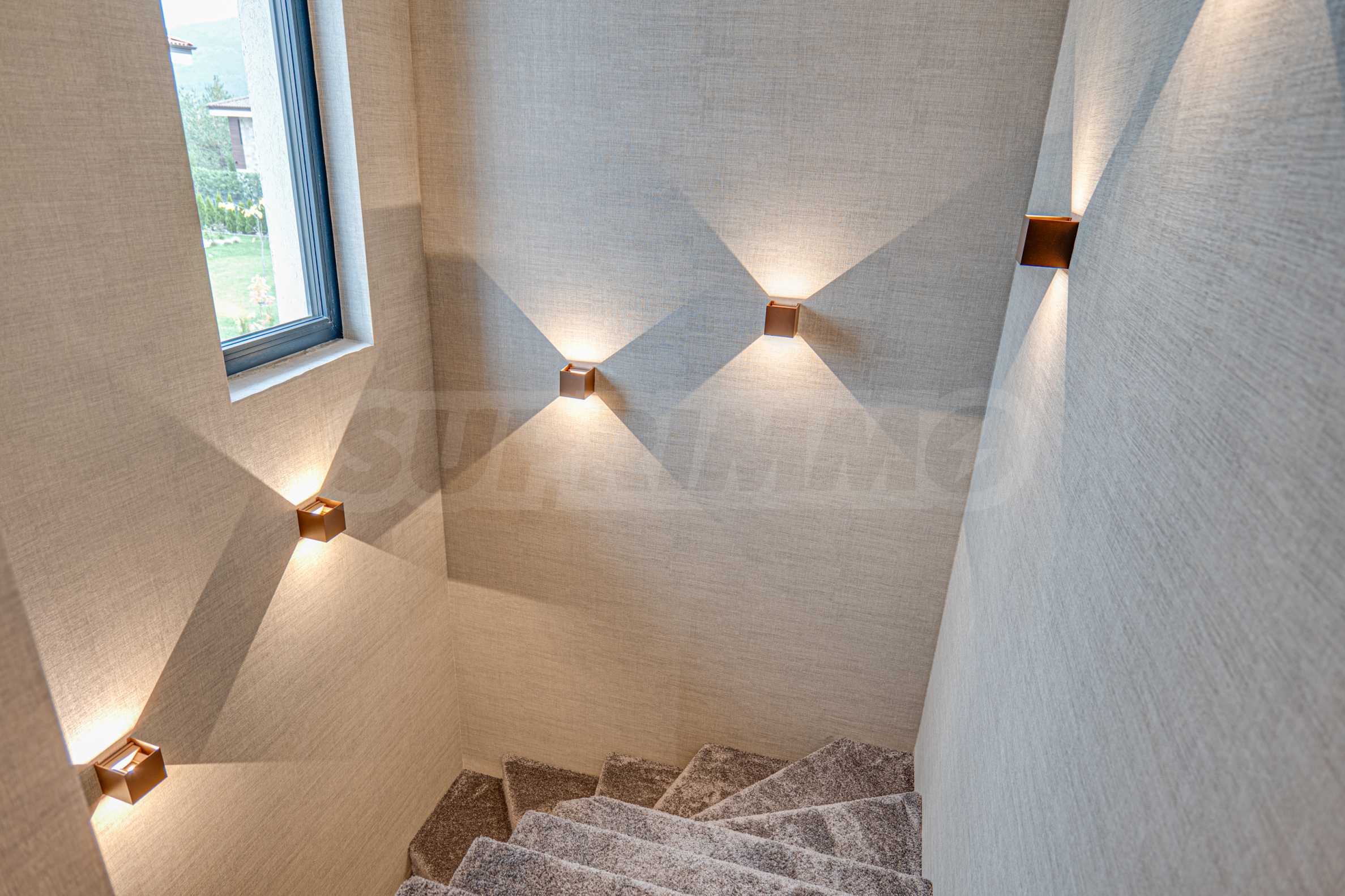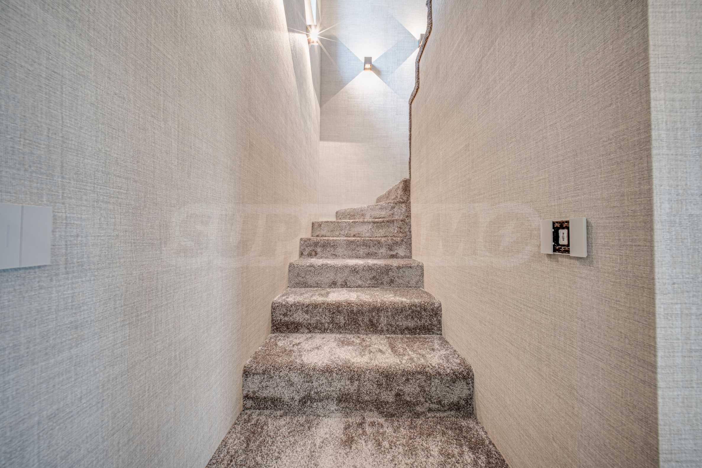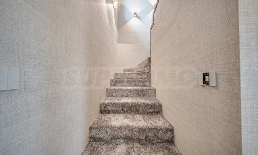 Внутренняя лестница покрыта ковром, что добавляет уюта и домашнего комфорта.