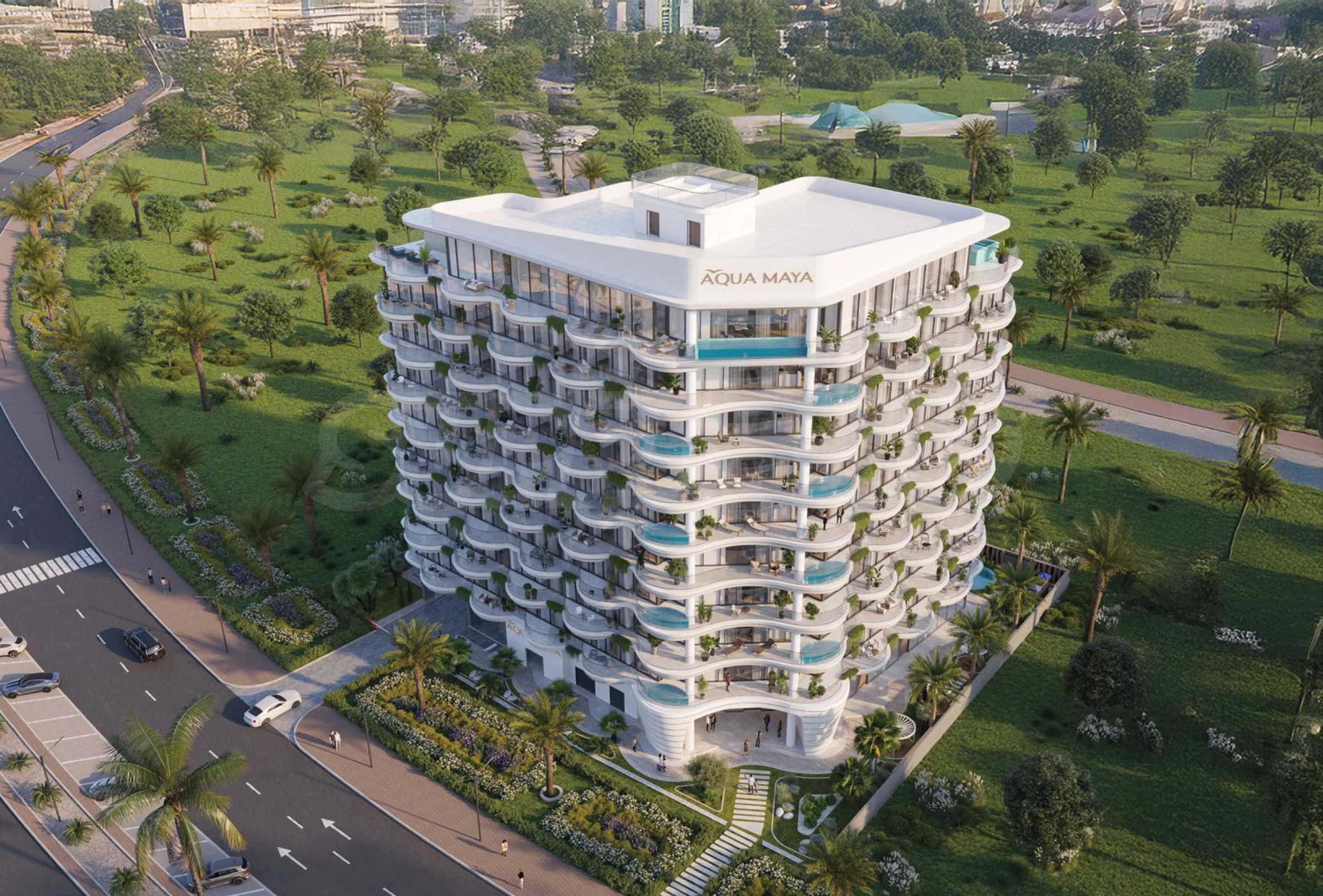 Aqua Maya — символ качества, роскоши и стиля. Десятиэтажное здание поражает своим элегантным обликом, вдохновлённым движением воды. Изогнутые линии, стеклянные балконы и белоснежные колонны делают здание одновременно современным и вневременным, а дополнительное озеленение добавляет свежести и красоты общему облику.