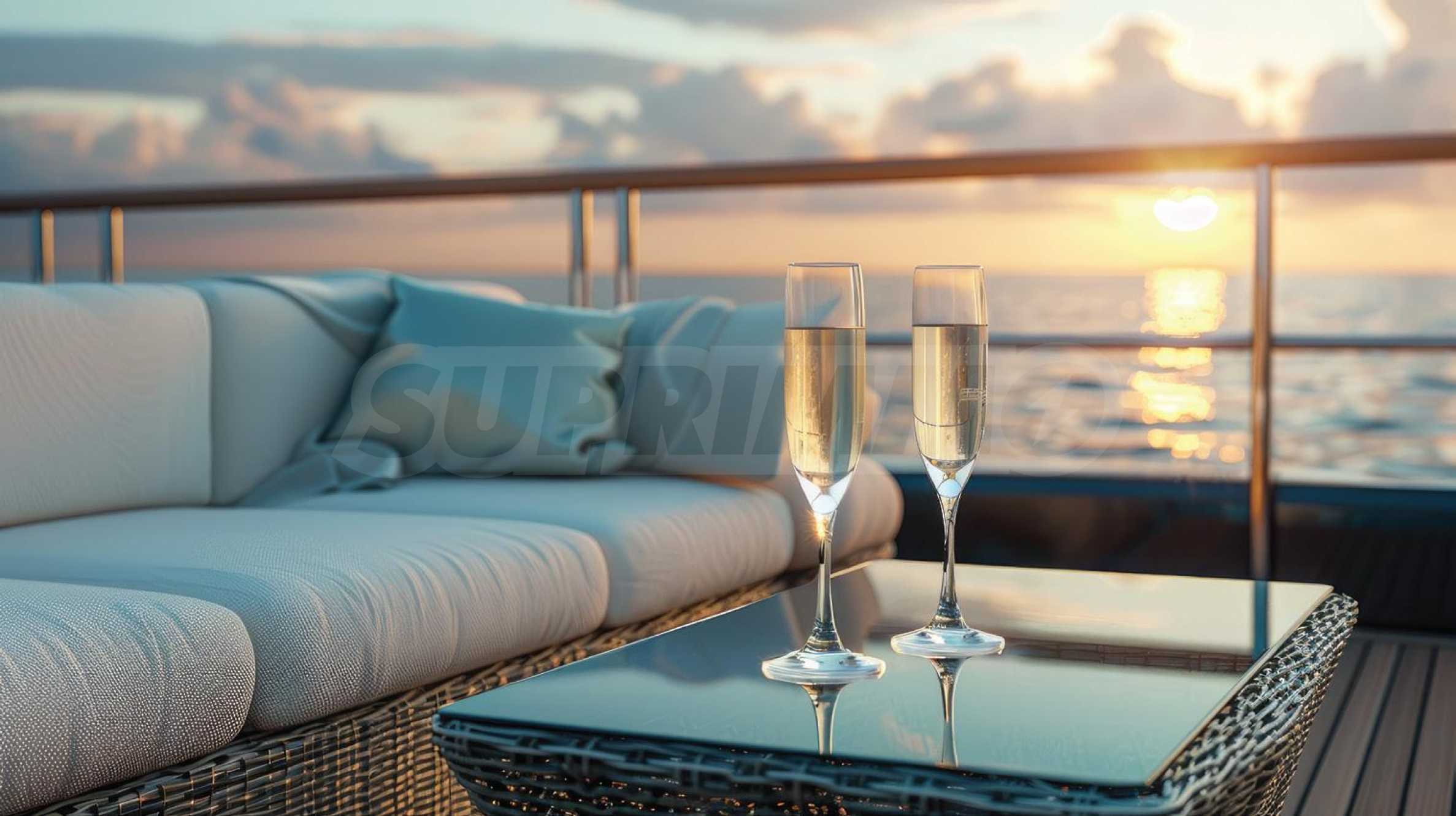 Интерьер продуман до мелочей. Высокие потолки и панорамные окна обеспечивают обилие естественного света и ощущение простора, а мягкие цвета и чистые линии подчёркивают спокойную морскую атмосферу.