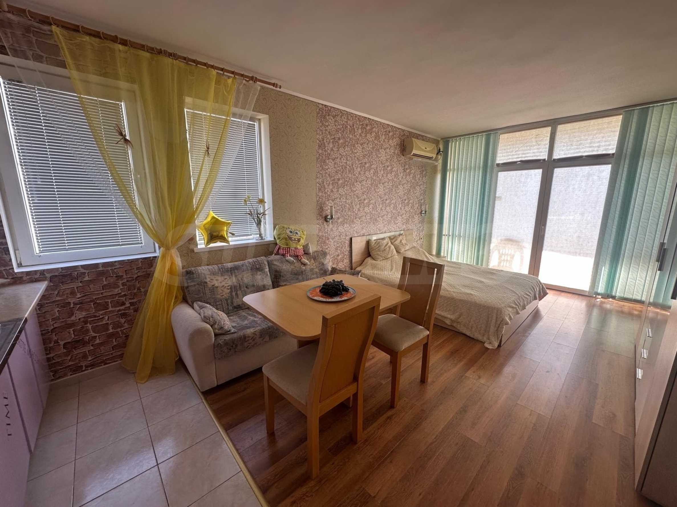 Представляем на продажу уютную студию, расположенную в современном комплексе с круглогодичным обслуживанием, в 500 метрах от моря, в центральной части Солнечного Берега.