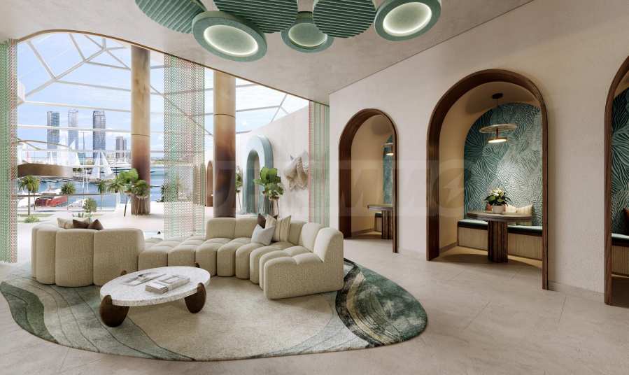 Квартира имеет функциональную планировку, включающую гостиную с кухонным уголком, две спальни с ванными комнатами, отдельный гостевой туалет и террасу. Высокие потолки и панорамные окна от пола до потолка наполняют пространство естественным светом и открывают вид на город, создавая ощущение простора и легкости. Терраса служит естественным продолжением интерьера — местом для отдыха и наслаждения атмосферой прибрежной жизни.