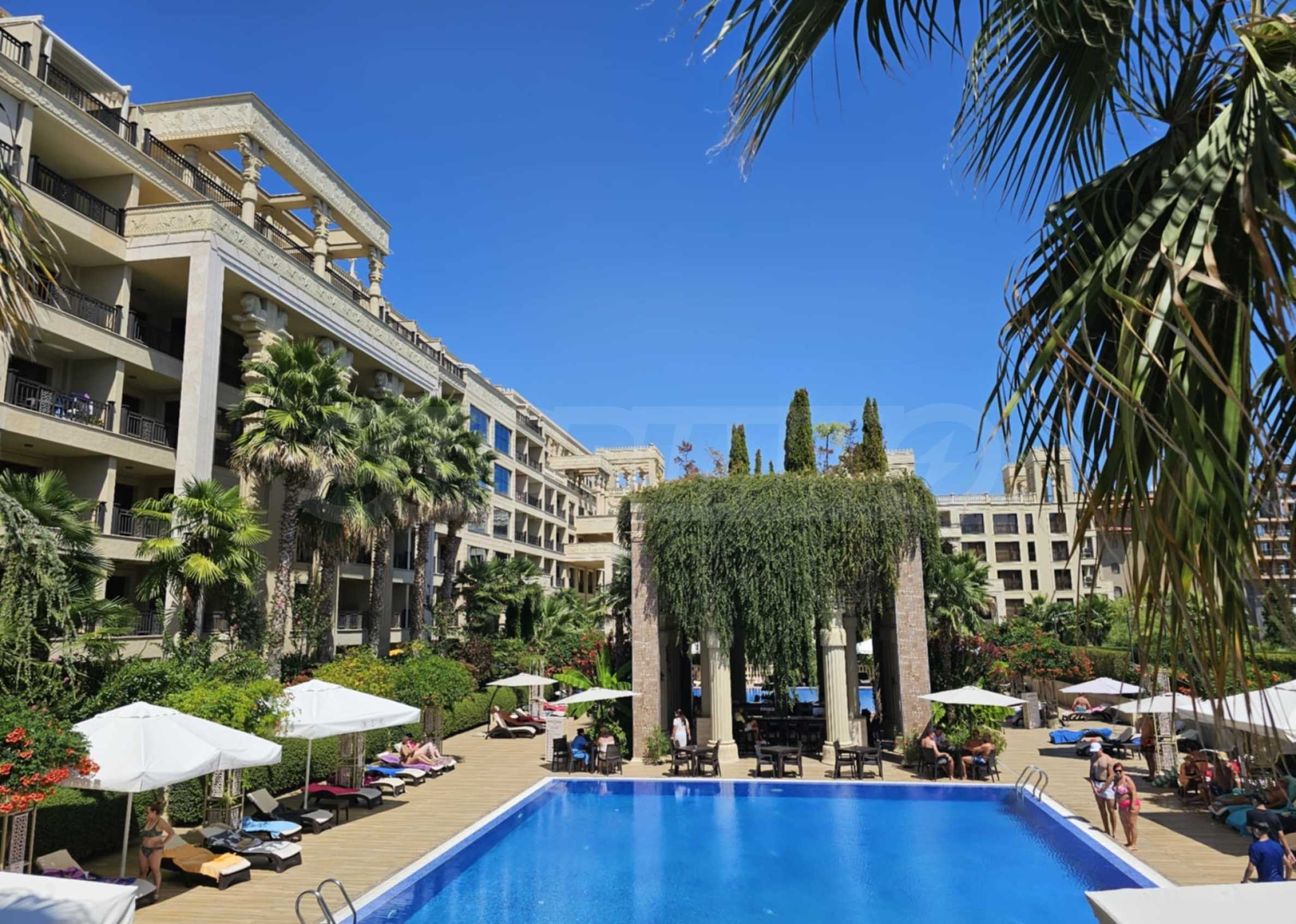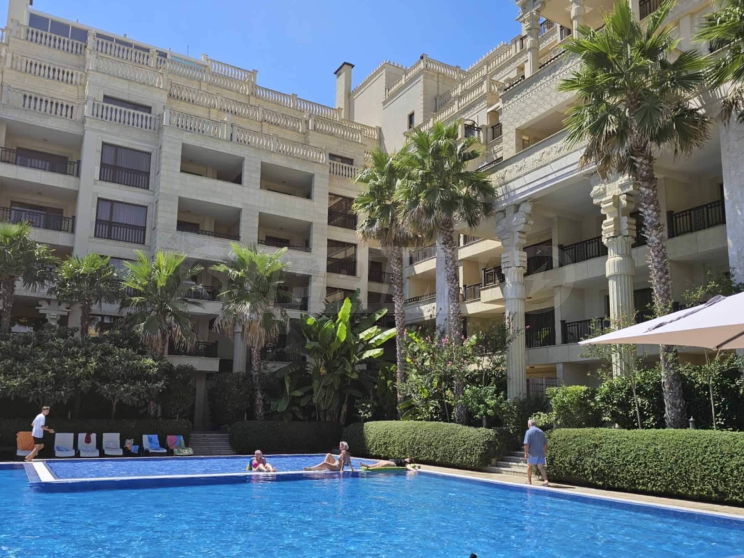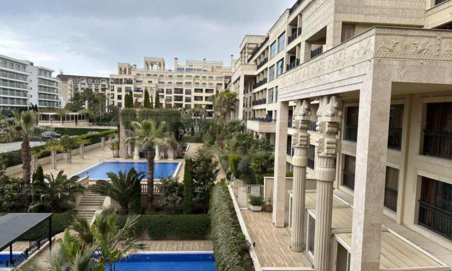 Комплекс построен в уникальном стиле, богато украшен орнаментами и статуями на фасадах и колоннах. Это один из самых новых и роскошных апарт-отелей на курорте Золотые пески. К услугам жильцов комплекса четыре открытых бассейна, тренажерный зал, ресторан, бар, подземная и наземная парковка, детская площадка, а также огромная благоустроенная территория.