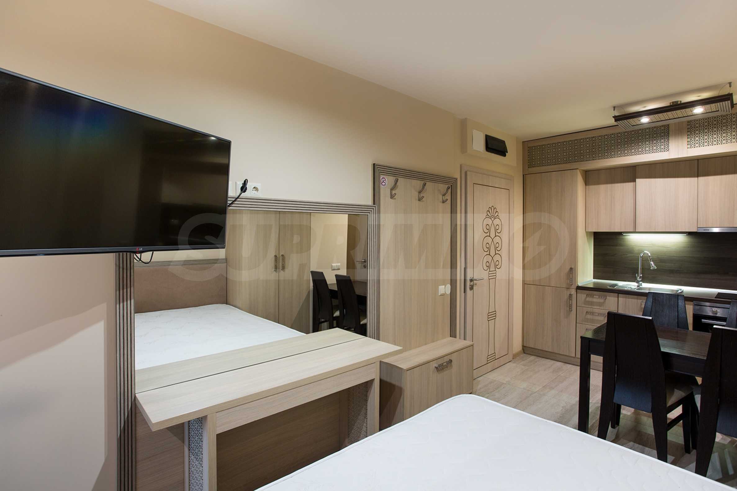 Представляем вам меблированную студию в первоклассном комплексе, расположенном в 150 метрах от пляжа на курорте Золотые пески, недалеко от города Варна. Этот роскошный комплекс расположен в тихом месте среди зелени парка курорта, в 5 минутах от пляжа и в пешей доступности от множества магазинов, банков, ресторанов и т. д.