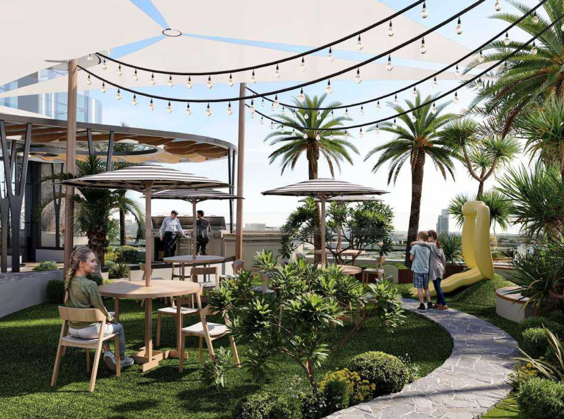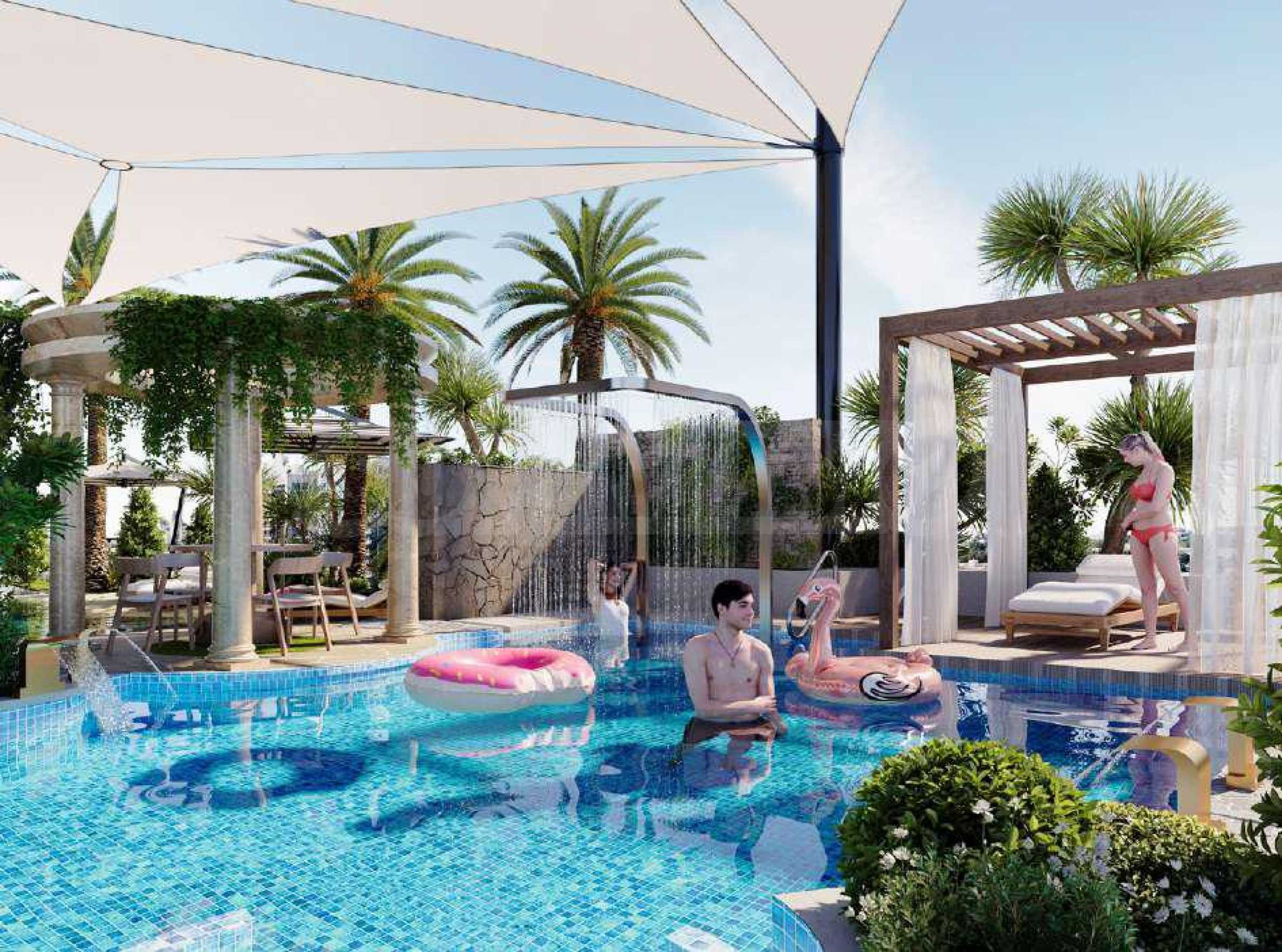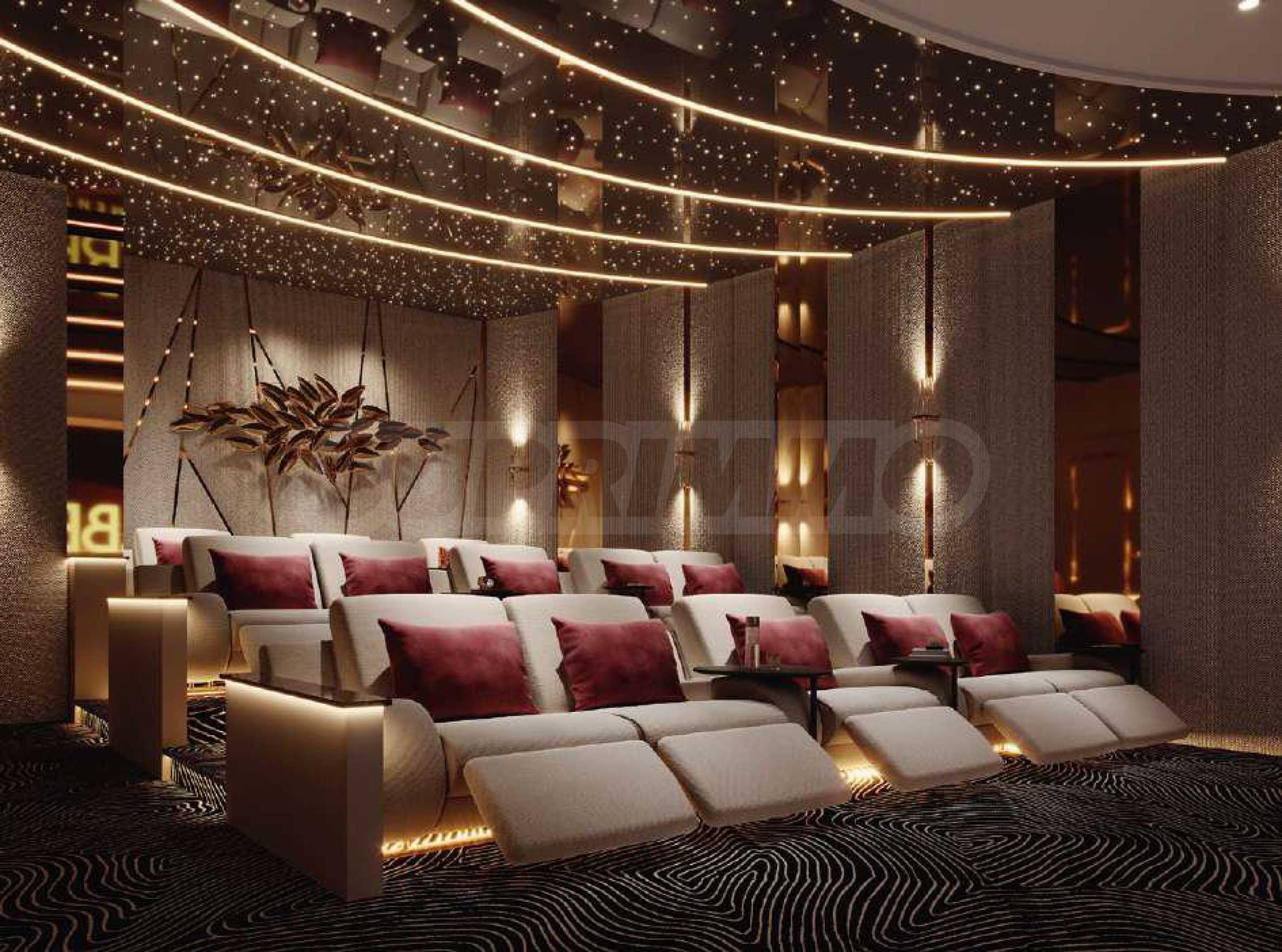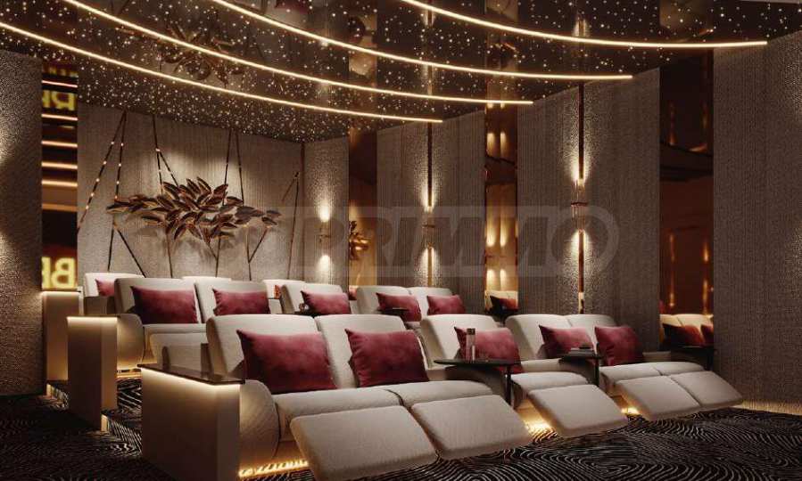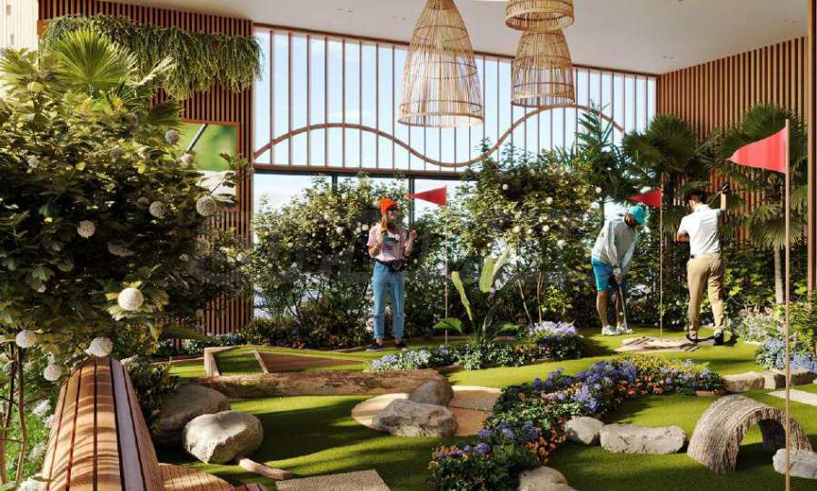 В Electra также есть кинотеатр для взрослых, а настоящей жемчужиной проекта являются зоны отдыха и развлечений на открытом воздухе — просторный бассейн с различными водными аттракционами, зонами отдыха, барбекю и уголками для обедов и ужинов на свежем воздухе. Среди зелени вы также найдете зону для йоги с видом на близлежащее поле для гольфа, а также поле для мини-гольфа — изысканное пространство для игр и приятных моментов с близкими и соседями.