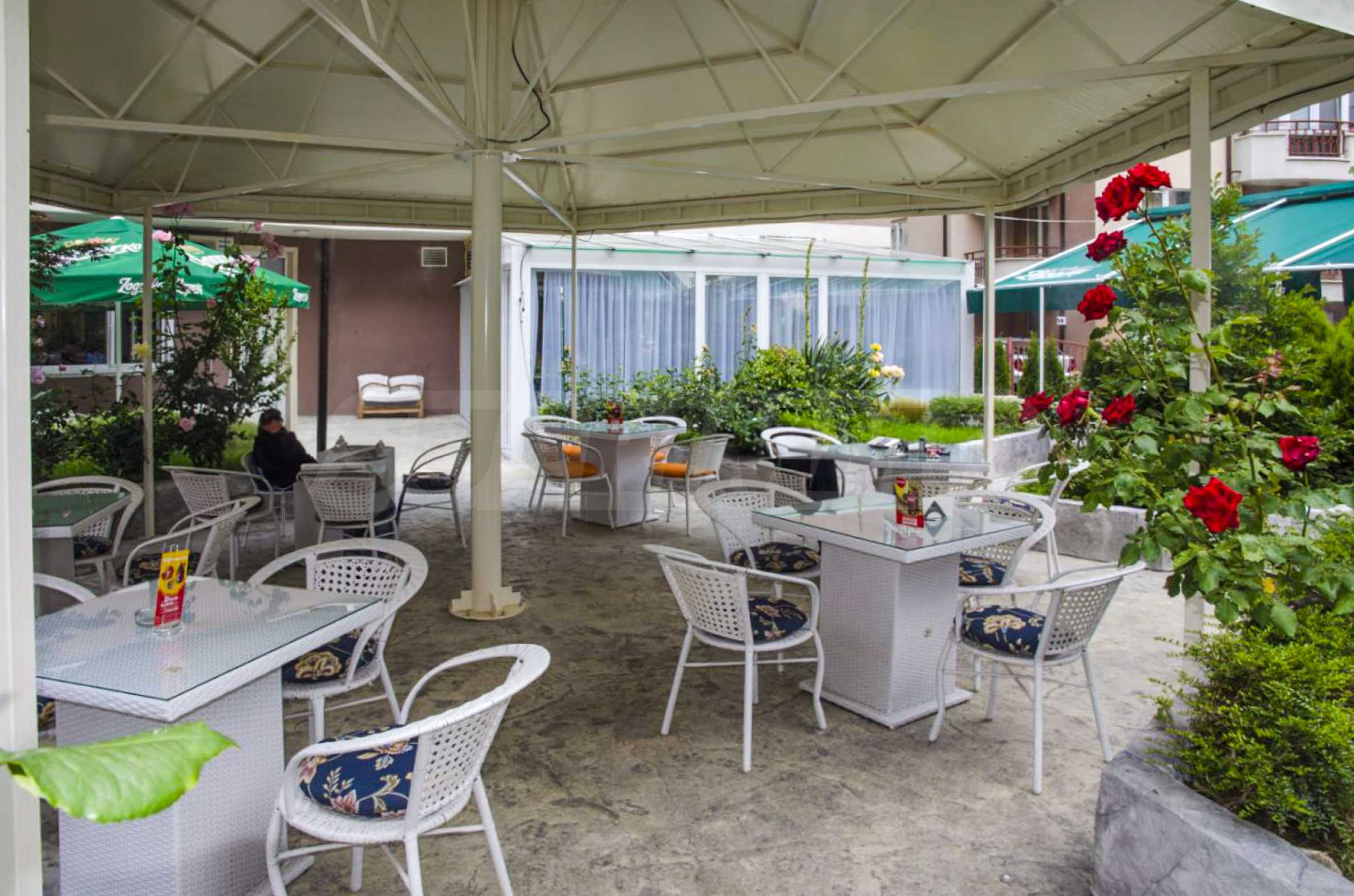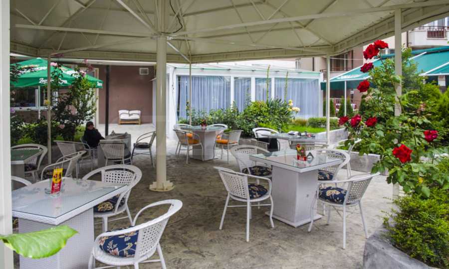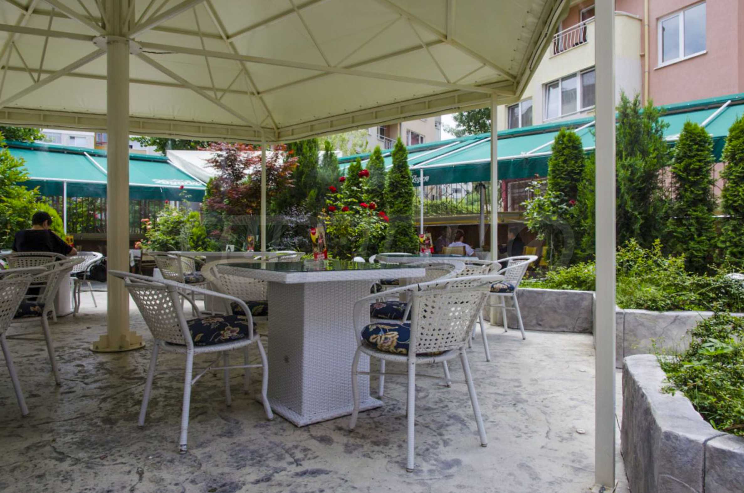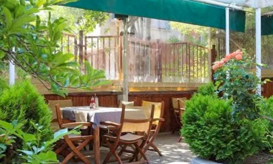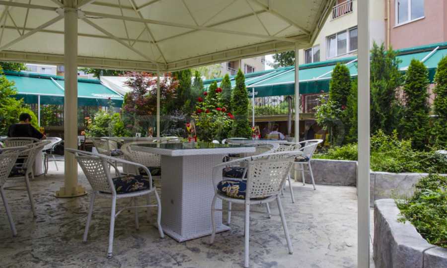 Дополнительным преимуществом объекта является огромный сад, который предоставляется в бесплатное пользование и идеально вписывается в территорию здания. Он прекрасно благоустроен, с ухоженными цветами и зелеными насаждениями, что позволяет разместить столы и стулья на открытом воздухе, что увеличивает вместимость заведения до 140 человек.