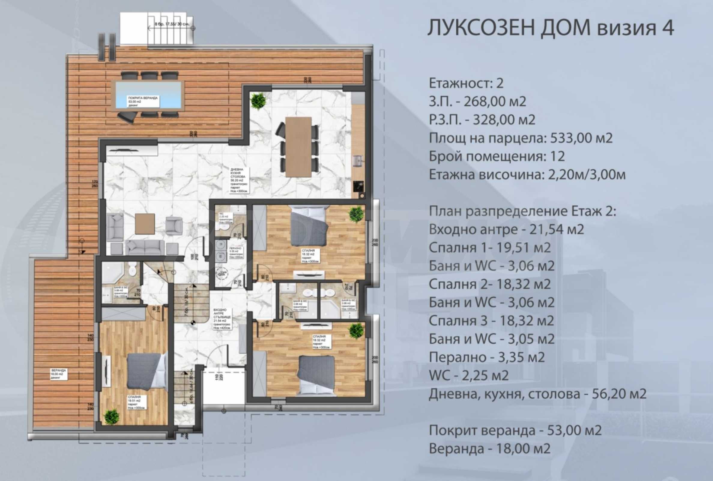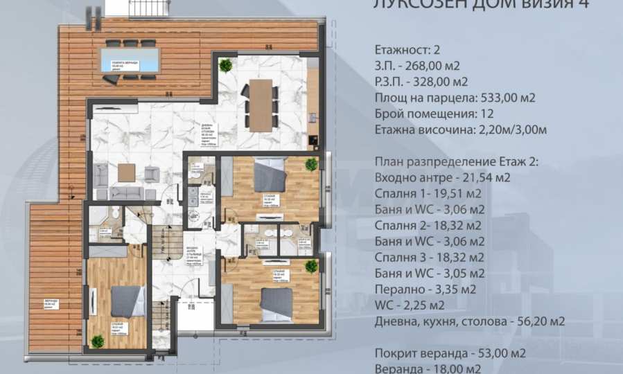• панорамная веранда с возможностью установки перголы – 53 кв.м;