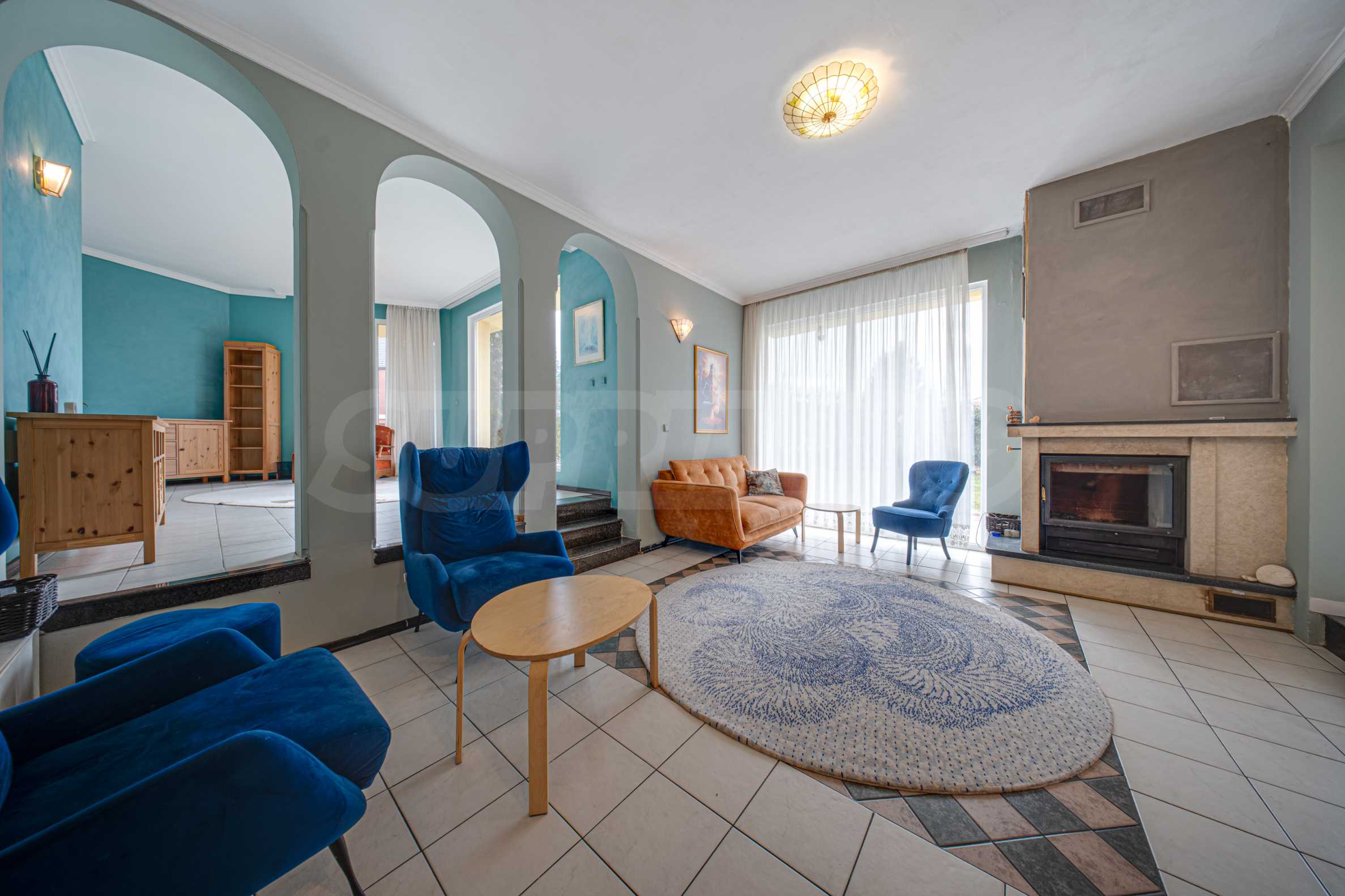 • просторная гостиная с камином, наполненная естественным светом;