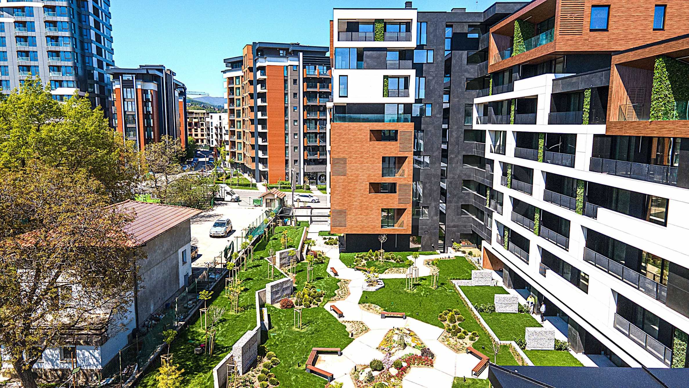 Концепция динамики городской среды реализуется через объём, пространство и фасад. Проект представляет собой композицию из 9-, 8-, 6- и 4-этажных объёмов, объединенных общей ступенчатой структурой, спускающейся к востоку, к будущему парку Лозенец. Дополнительными акцентами композиции являются объёмы пентхаусов, представляющие собой своеобразные коробки, заполненные HPL-панелями FUNDERMAX в ореховом цвете, в которых размещаются роскошные апартаменты с увеличенной высотой потолков (3,30 м).