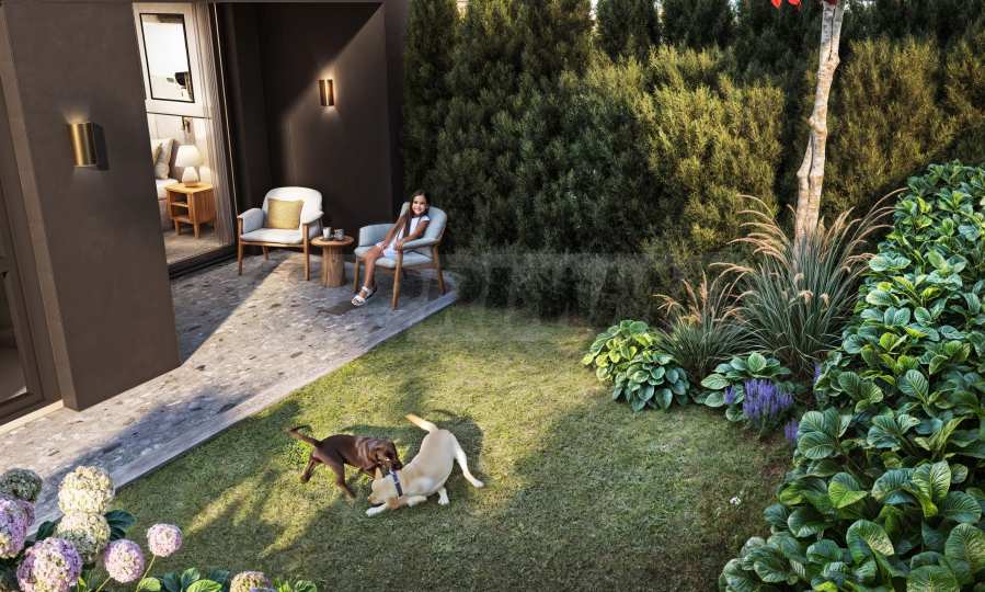 Квартира расположена на первом этаже здания и имеет общую жилую площадь 107,18 кв. м. Ориентация на юго-запад, планировка удобная и функциональная, из каждой комнаты есть выход на террасу. К квартире примыкает солнечный дворик площадью 50,40 кв. м, который дополняет интерьер и может быть превращен в место для отдыха и развлечений на свежем воздухе.