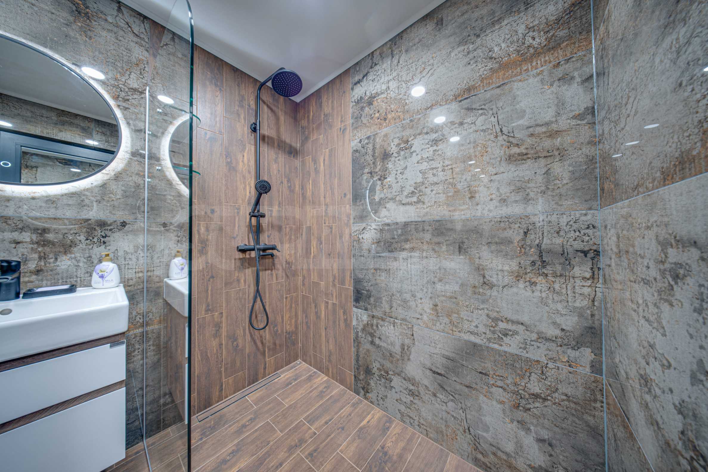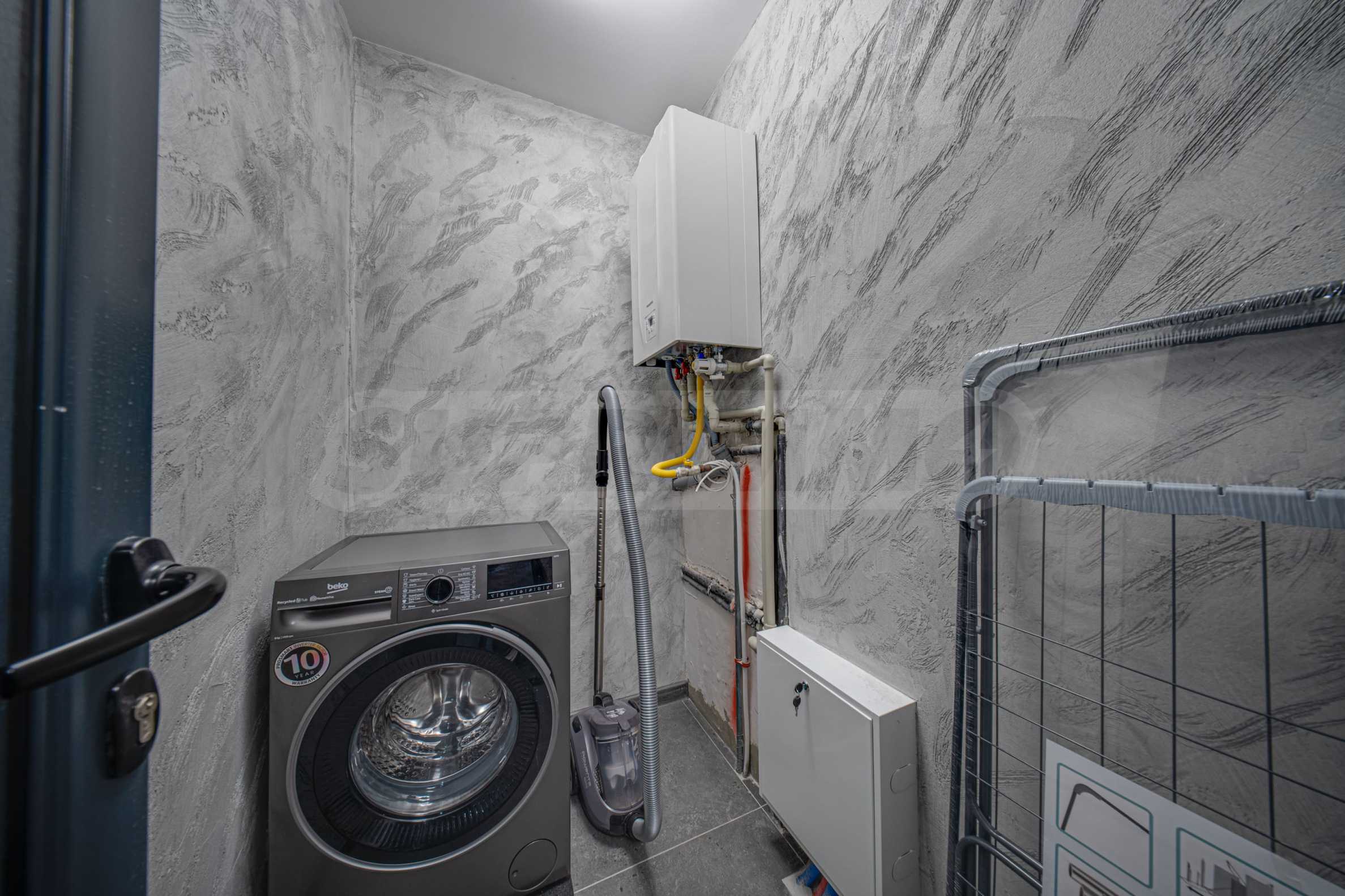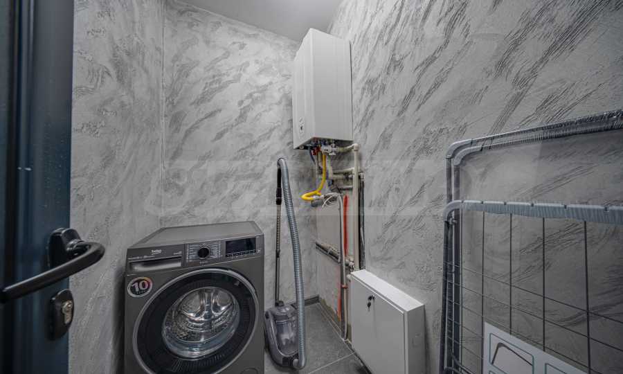 Квартира полностью меблирована и оборудована: стиральная машина, посудомоечная машина, духовой шкаф, холодильник с морозильной камерой, варочная панель, вытяжка, обеденный стол, стулья, мягкая меблировку, кровать, шкафы, тумбы, аксессуары и т. д. Отделочные работы - полы: высококачественный ламинированный паркет и керамогранит; стены - песчаная штукатурка, травертин и латекс; ванные комнаты - керамогранит.