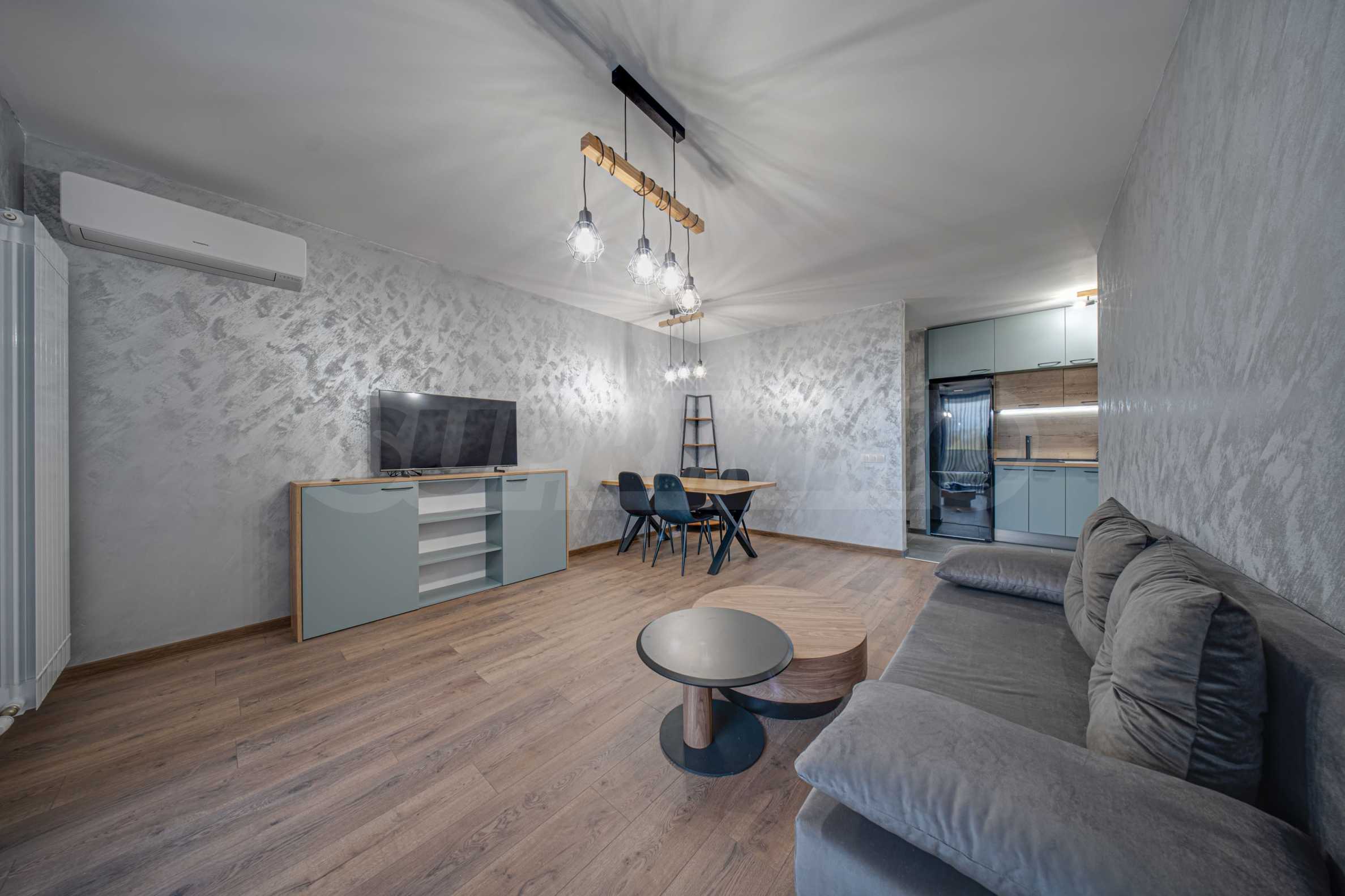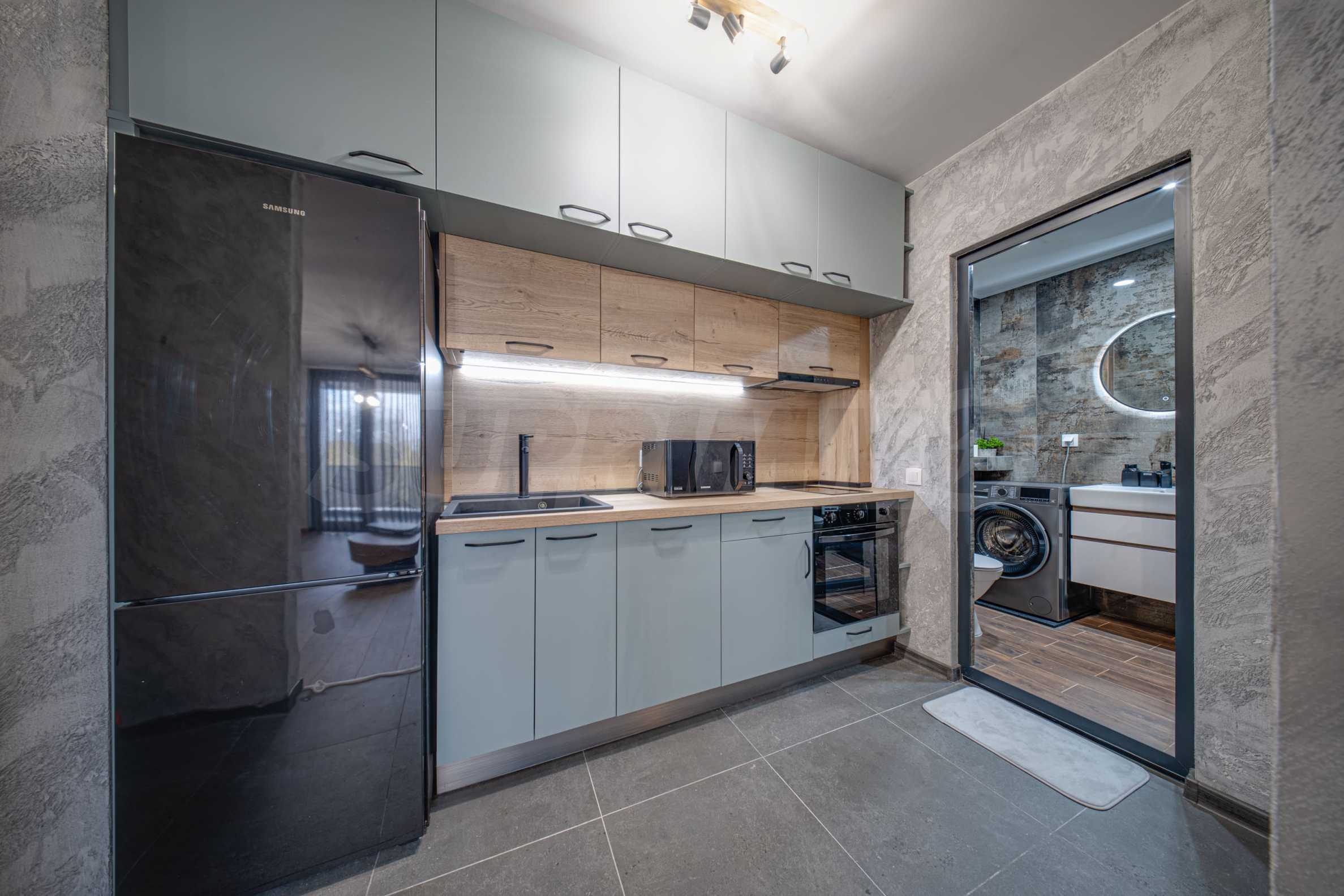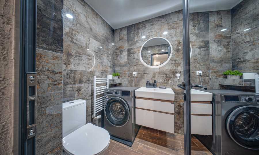 Квартира полностью меблирована и оборудована: стиральная машина, посудомоечная машина, духовка, холодильник с морозильной камерой, варочная панель, вытяжка, обеденный стол, стулья, мягкая меблировку, кровать, шкафы, тумбы, аксессуары и т. д. Отделочные работы: напольное покрытие – высококачественный ламинированный паркет и гранитная плитка; стены – песчаная штукатурка, травертин и латекс.