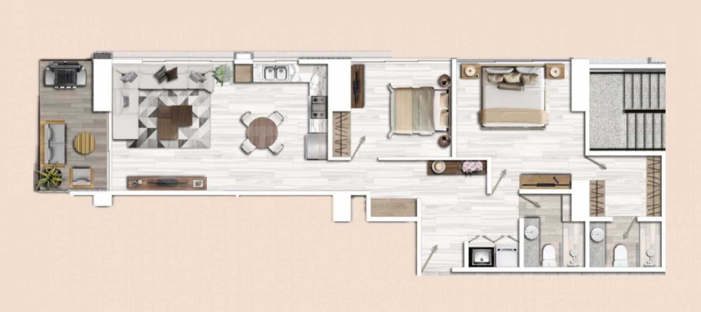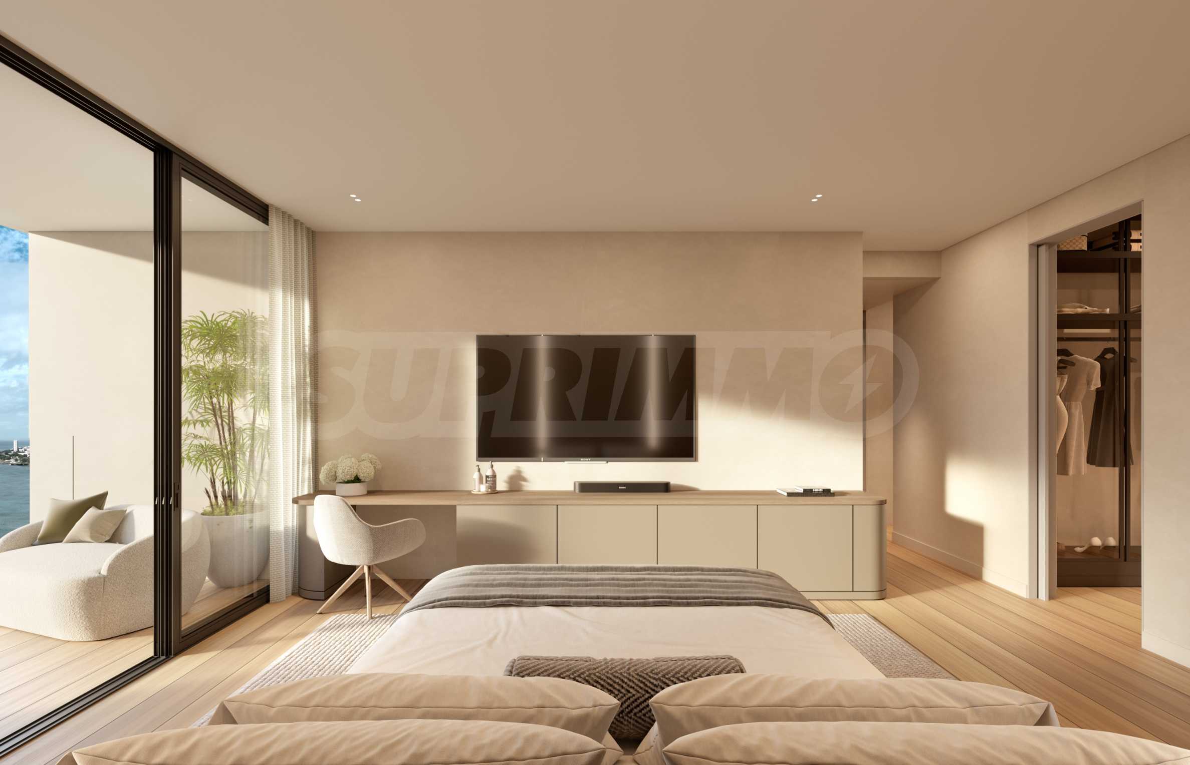 Квартира расположена на 9 этаже здания и имеет общую площадь 98 кв. м, из которых 93 кв. м отведены под внутреннюю часть и 5 кв. м – на внешнюю. Высокие потолки и панорамные окна словно рамы, позволяющие любоваться невероятными морскими пейзажами каждый день. Планировка квартиры чрезвычайно удобная и функциональная: просторная гостиная открытой планировки, совмещенная с кухней-столовой, главная спальня с ванной комнатой и гардеробной, вторая спальня с ванной комнатой, гостевой туалет и балкон.