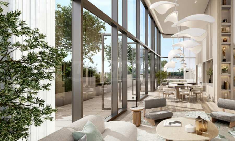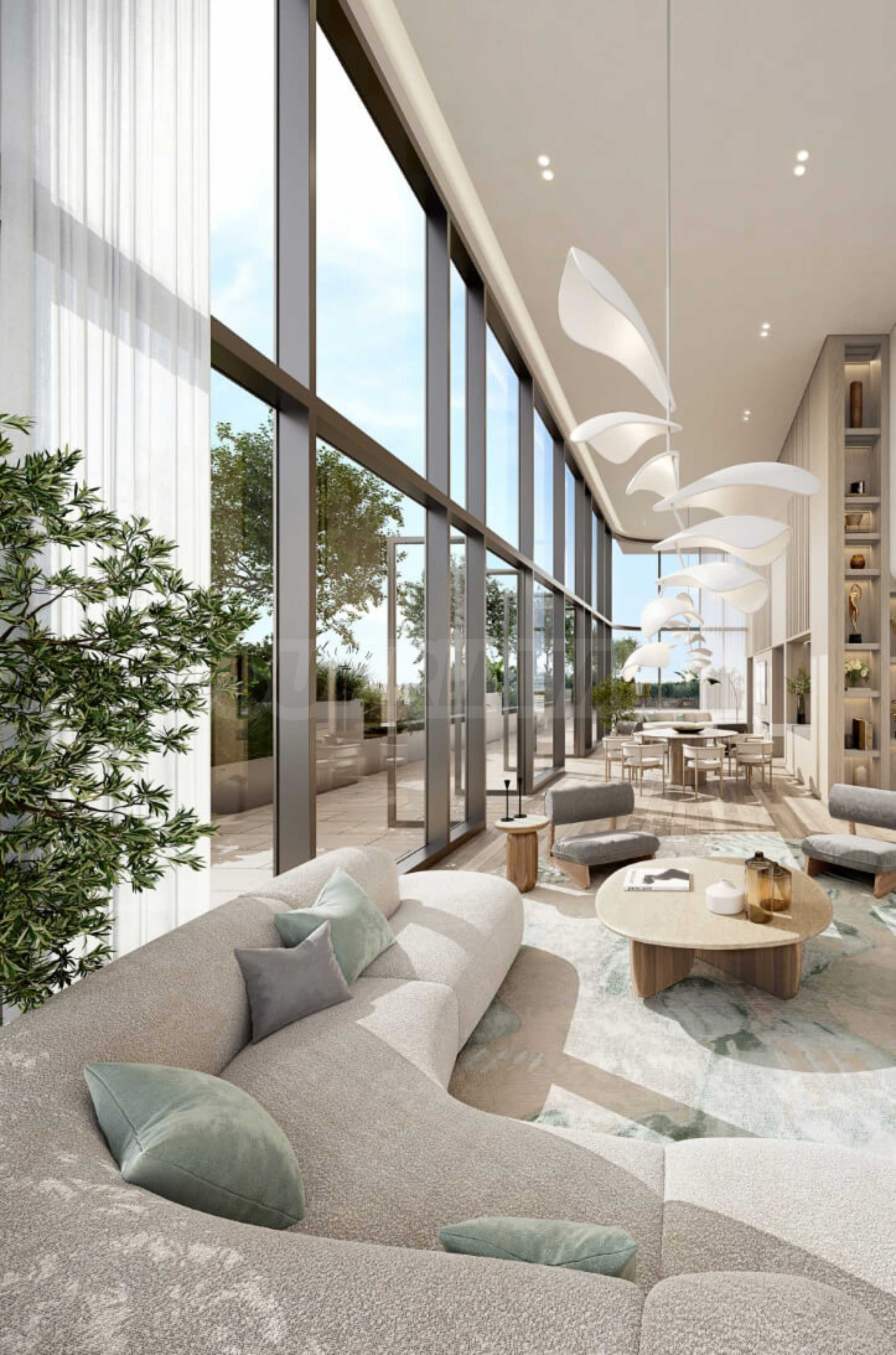 Эти апартаменты с двумя спальнями площадью 113,43 кв. м были тщательно спроектированы для обеспечения комфорта, функциональности и уединения. Высокие потолки и панорамные окна от пола до потолка наполняют помещение дневным светом и подчёркивают ощущение простора. Планировка включает светлую гостиную с кухней и столовой, две спальни, каждая с собственной ванной комнатой, отдельный гостевой туалет, подсобное помещение и террасу с видом на озёра или населенный пункт.