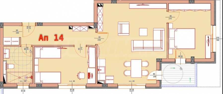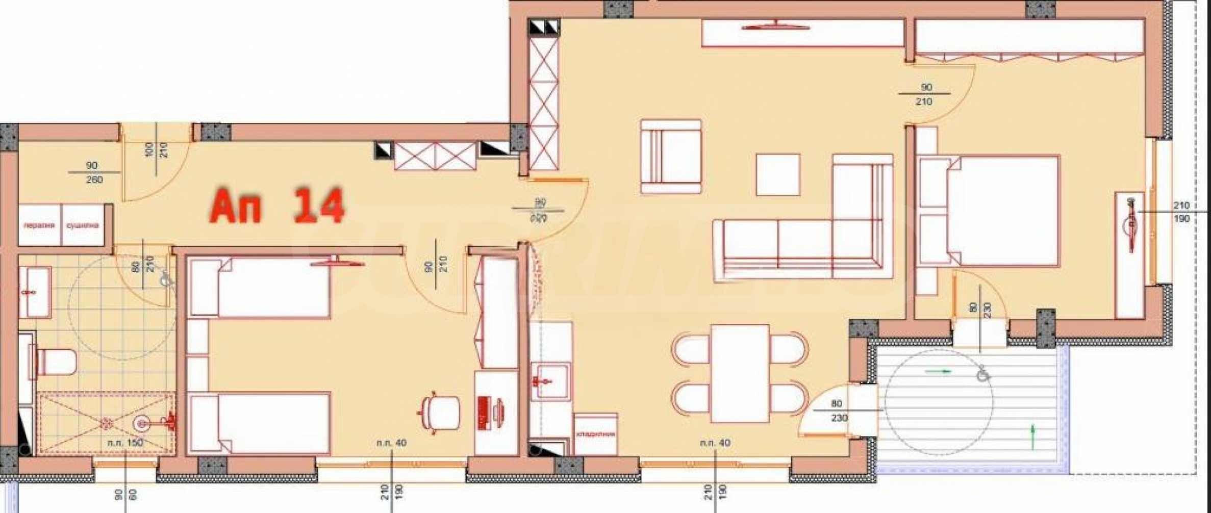 Квартира площадью 104,41 кв.м. расположена на 3-м этаже, окна выходят на юго-запад. Она сдаётся в следующей степени готовности в соответствии с болгарскими строительными нормами: