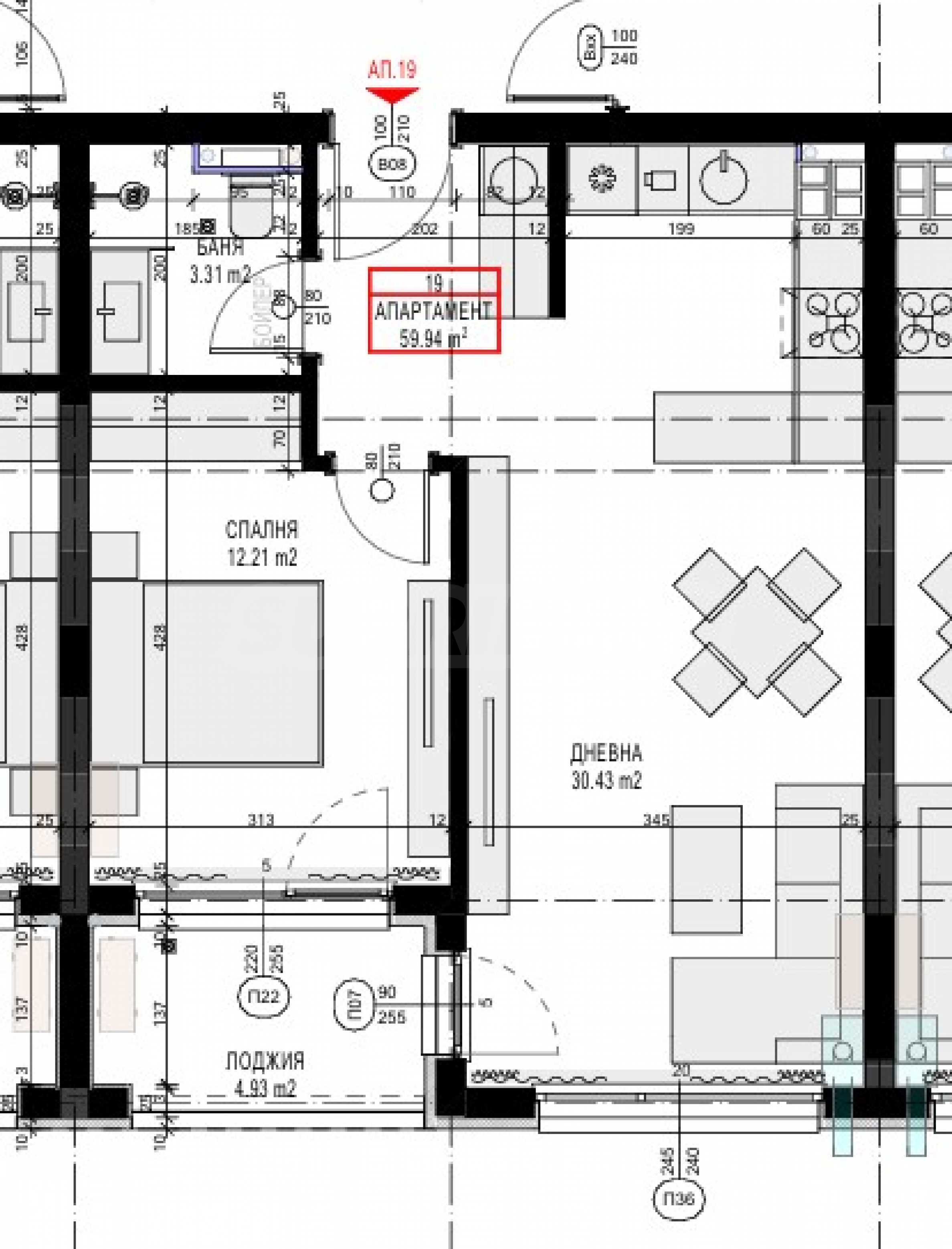 Квартира № 19 расположена на 2 этаже здания и имеет площадь 59,94 м2. Планировка: прихожая, ванная комната/туалет, гостиная с кухней-столовой, спальня, лоджия с выходом из обеих комнат. В стоимость квартиры включена кладовая площадью 3,38 м2.