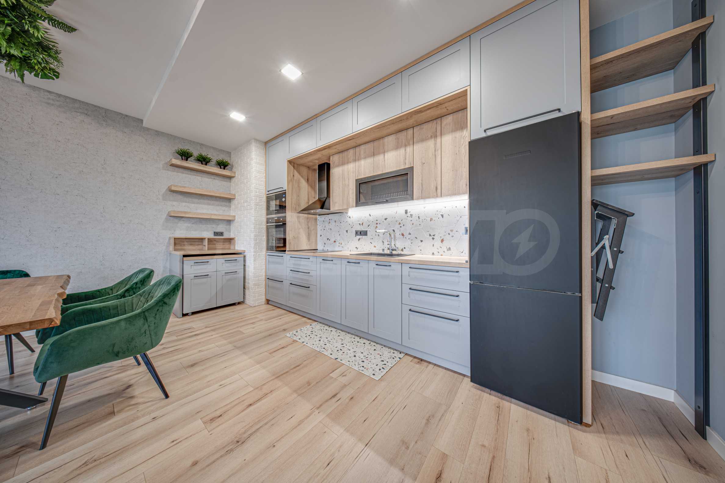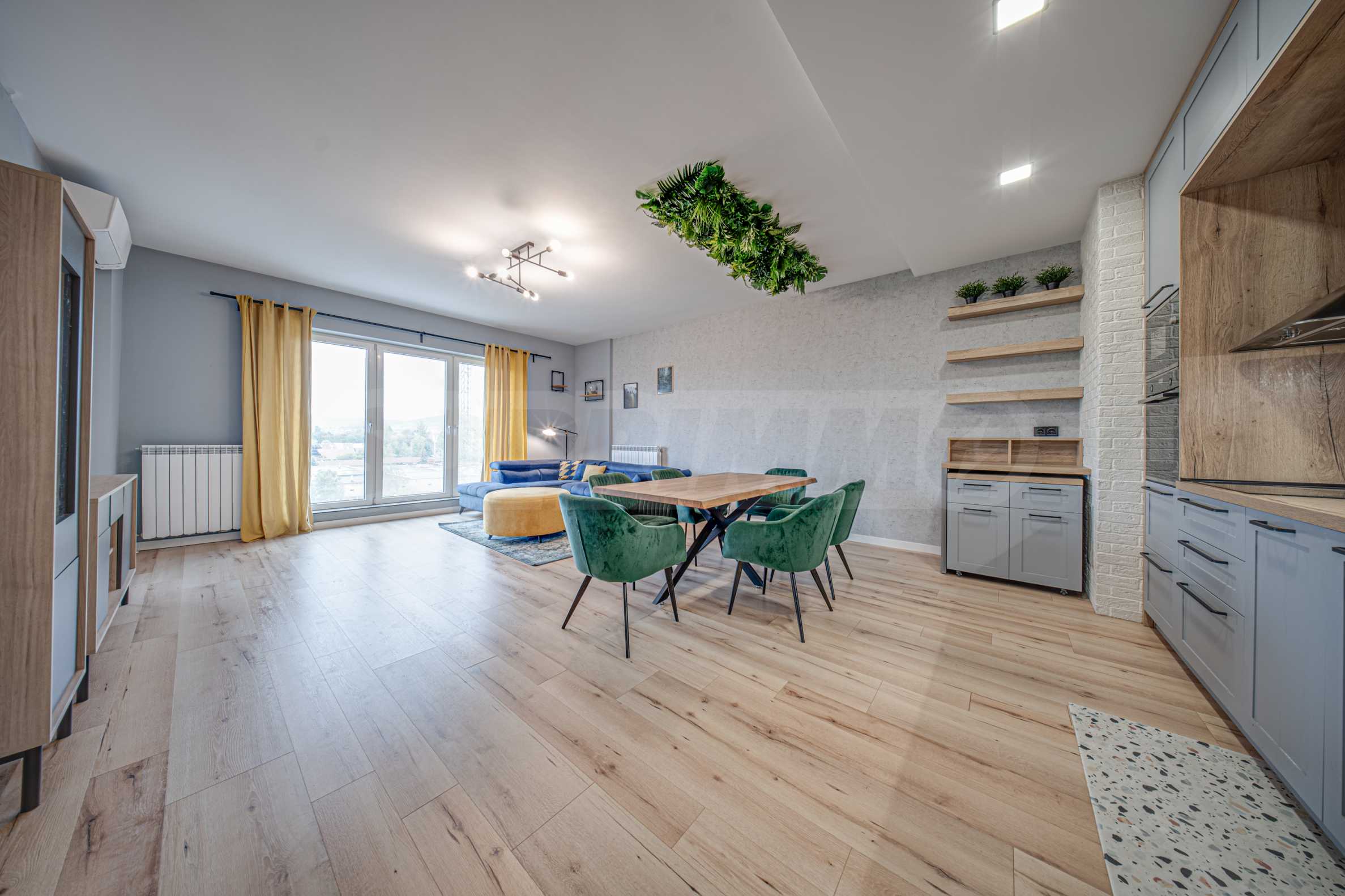 На открытом пространстве расположены гостиная и столовая, а также полностью оборудованная электроприборами кухня, рядом расположена терраса с прекрасным видом на гору Витоша.