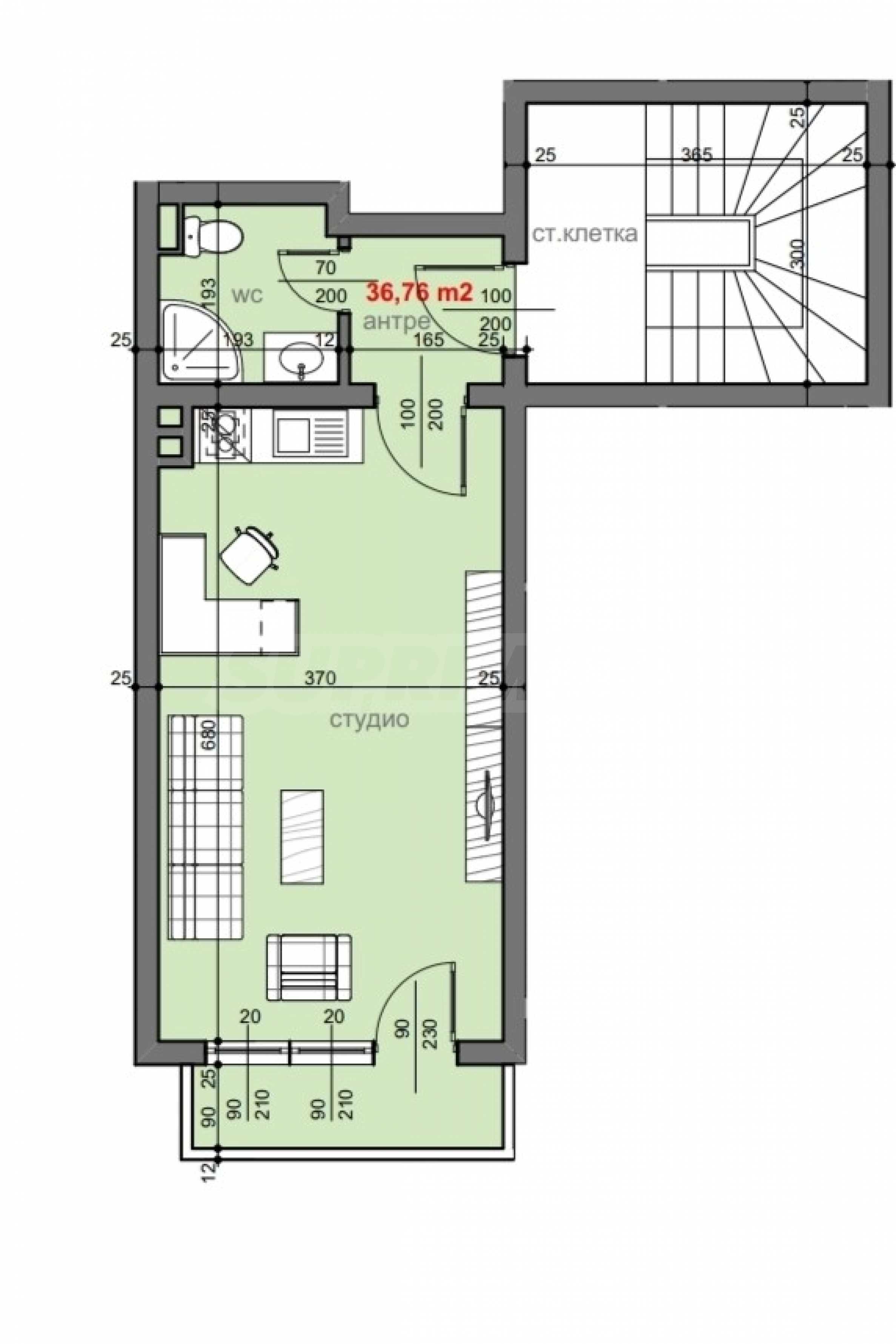 Квартира общей площадью 36,76 кв. м расположена на 1 этаже с террасой.